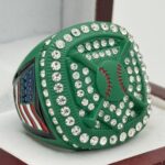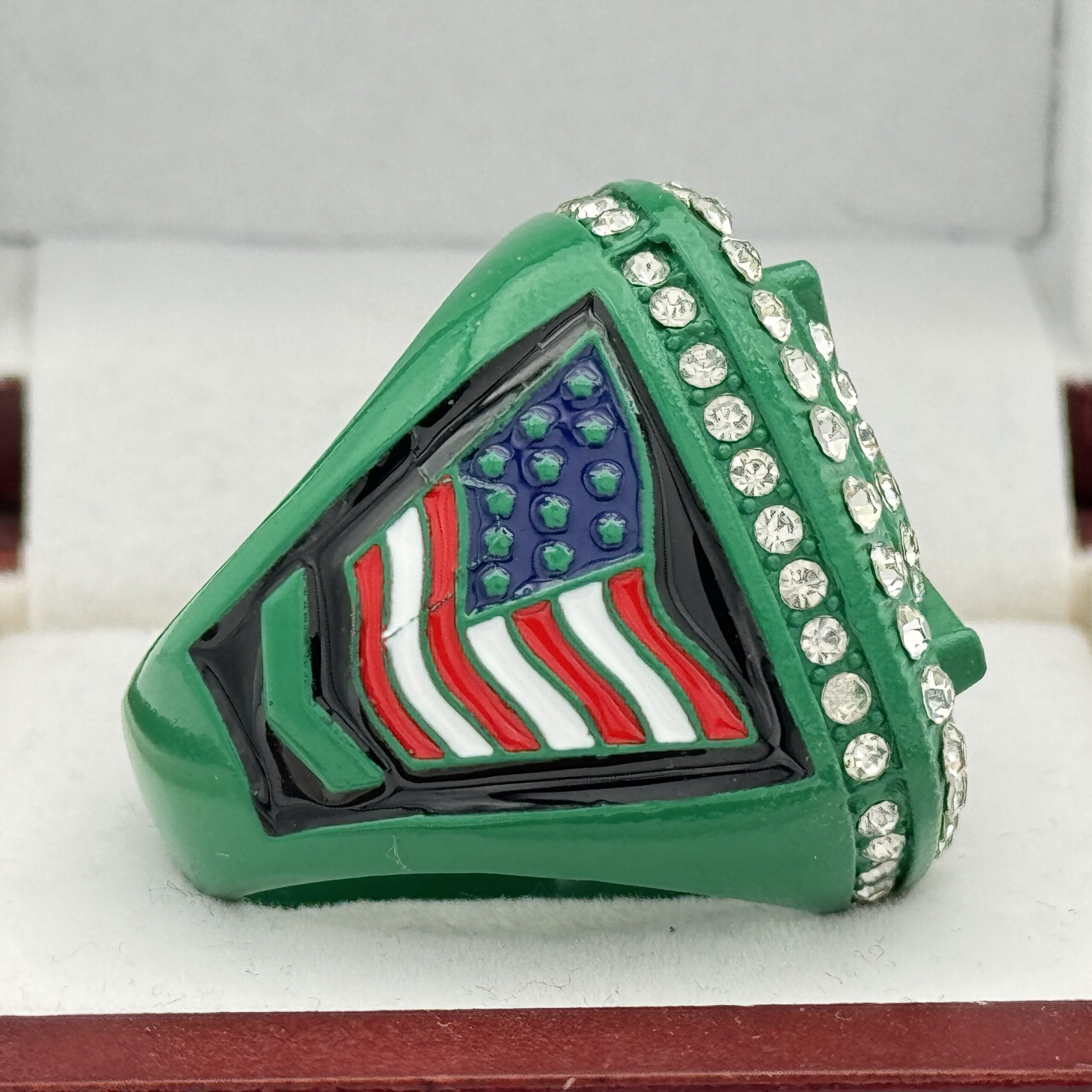 This ring is made of a zinc alloy. The ring body is green in color. The stones on the side bezel are clear in color the stones in the top bezel are clear in color. There is black color paint on the sides of the rings. The left side of the ring shows an American Flag and the right side shows a glove with crossed bats in the background. The top of the ring shows a home plate with crossed bats in the background with clear stones.