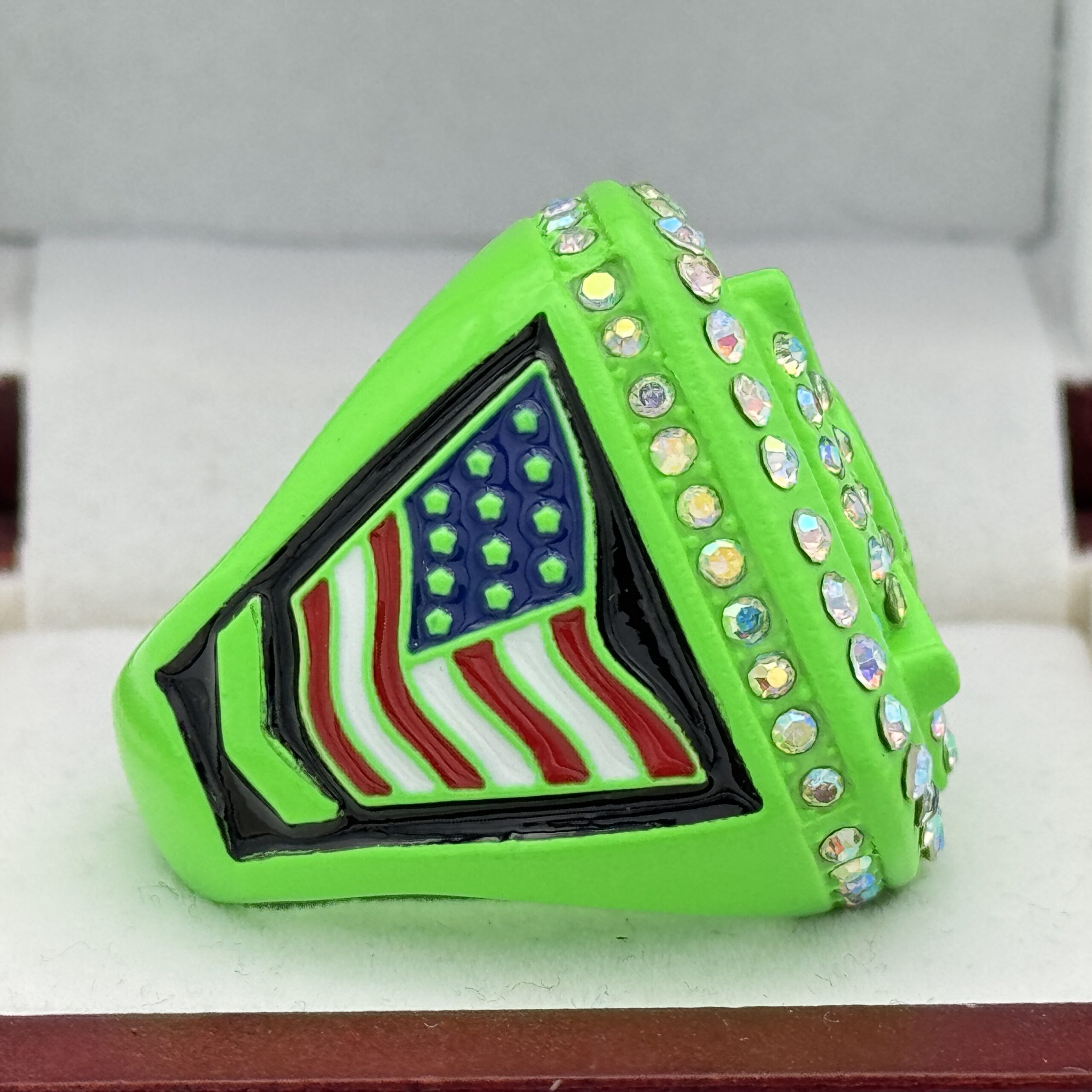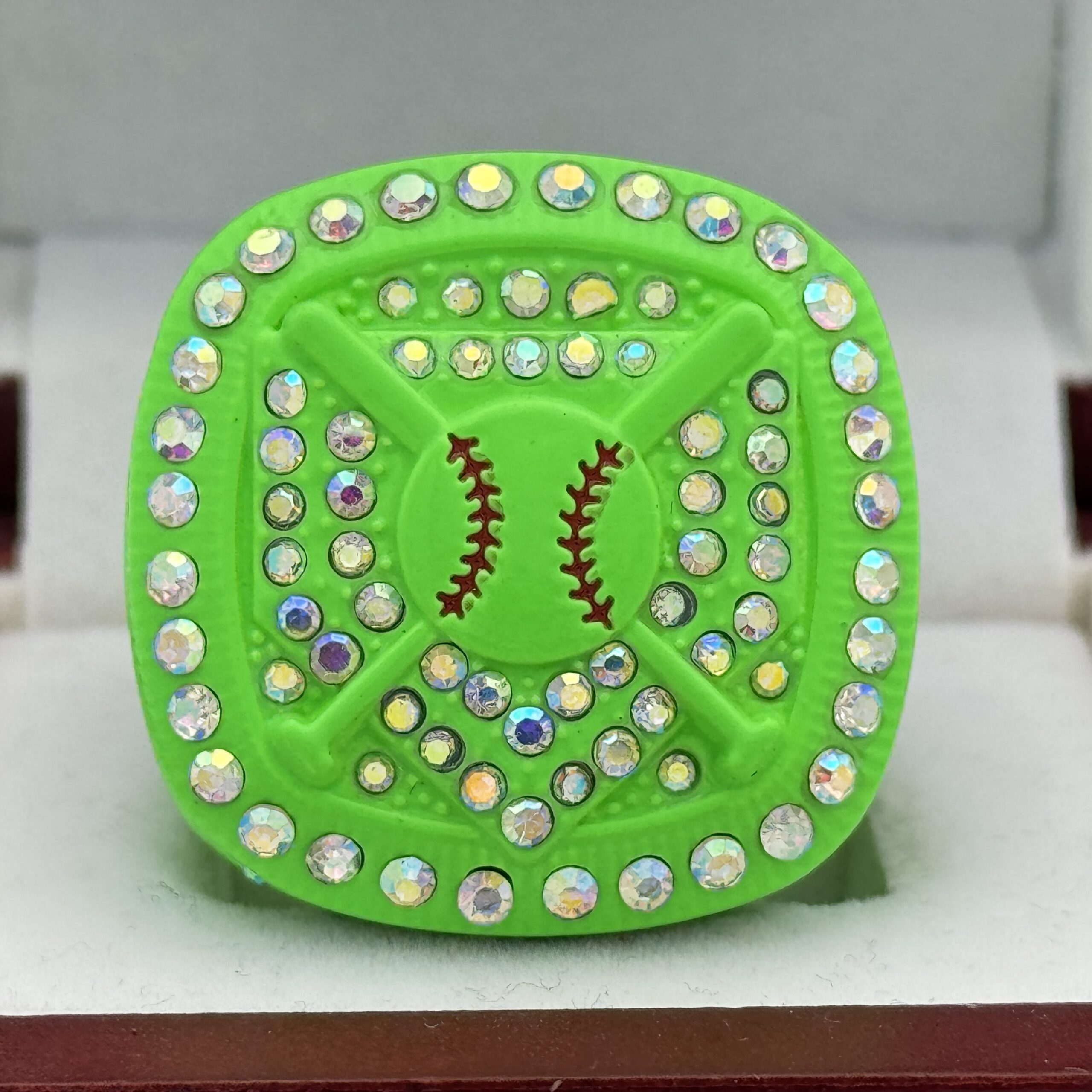 This ring is made of a zinc alloy. The ring body is neon green in color. The stones on the side bezel are prismatic in color the stones in the top bezel are prismatic in color. There is black color paint on the sides of the rings. The left side of the ring shows an American Flag and the right side shows a glove with crossed bats in the background. The top of the ring shows a home plate with crossed bats in the background with prismatic stones.