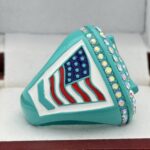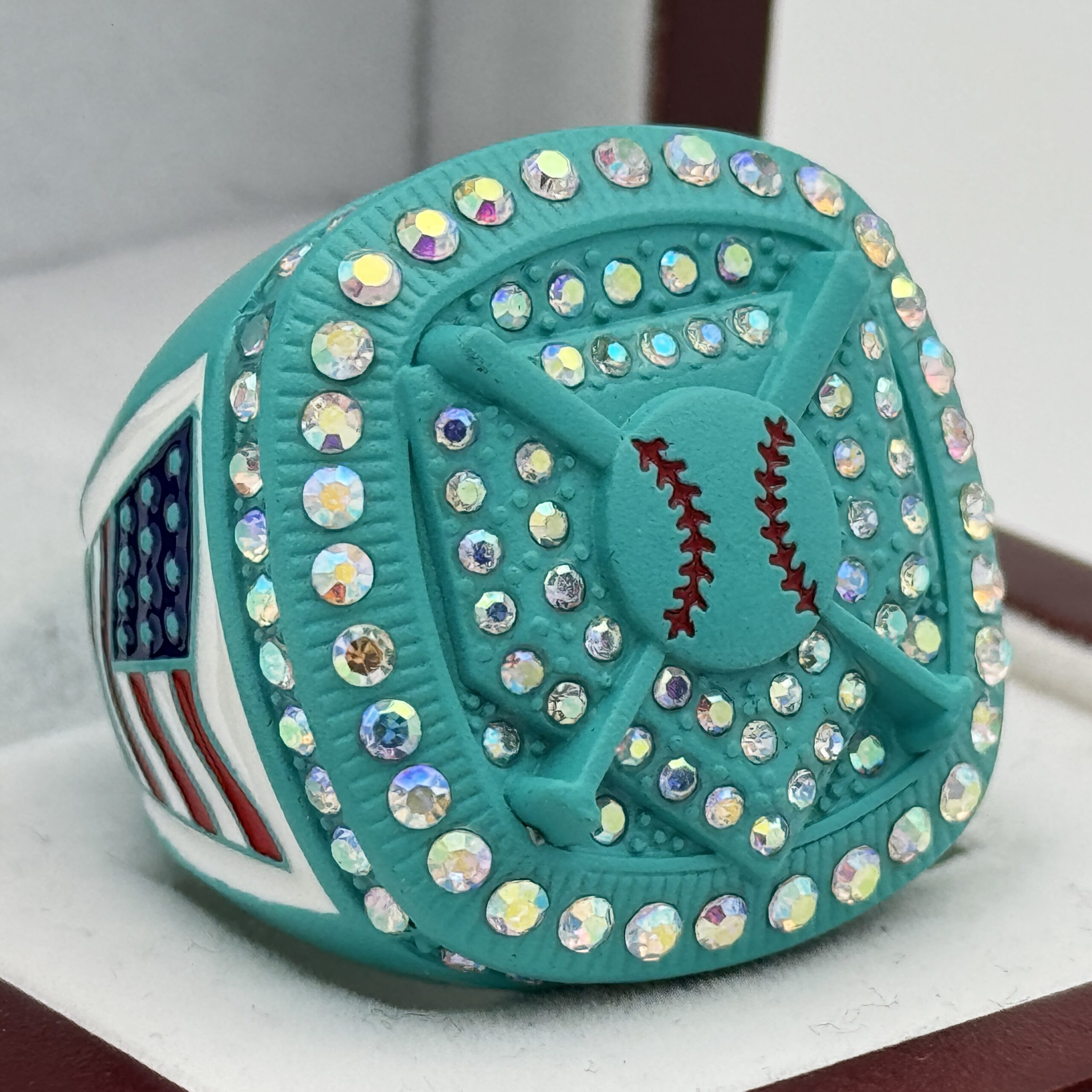 This ring is made of a zinc alloy. The ring body is teal in color. The stones on the side bezel are prismatic in color the stones in the top bezel are prismatic in color. There is white color paint on the sides of the rings. The left side of the ring shows an American Flag and the right side shows a glove with crossed bats in the background. The top of the ring shows a home plate with crossed bats in the background with prismatic stones.