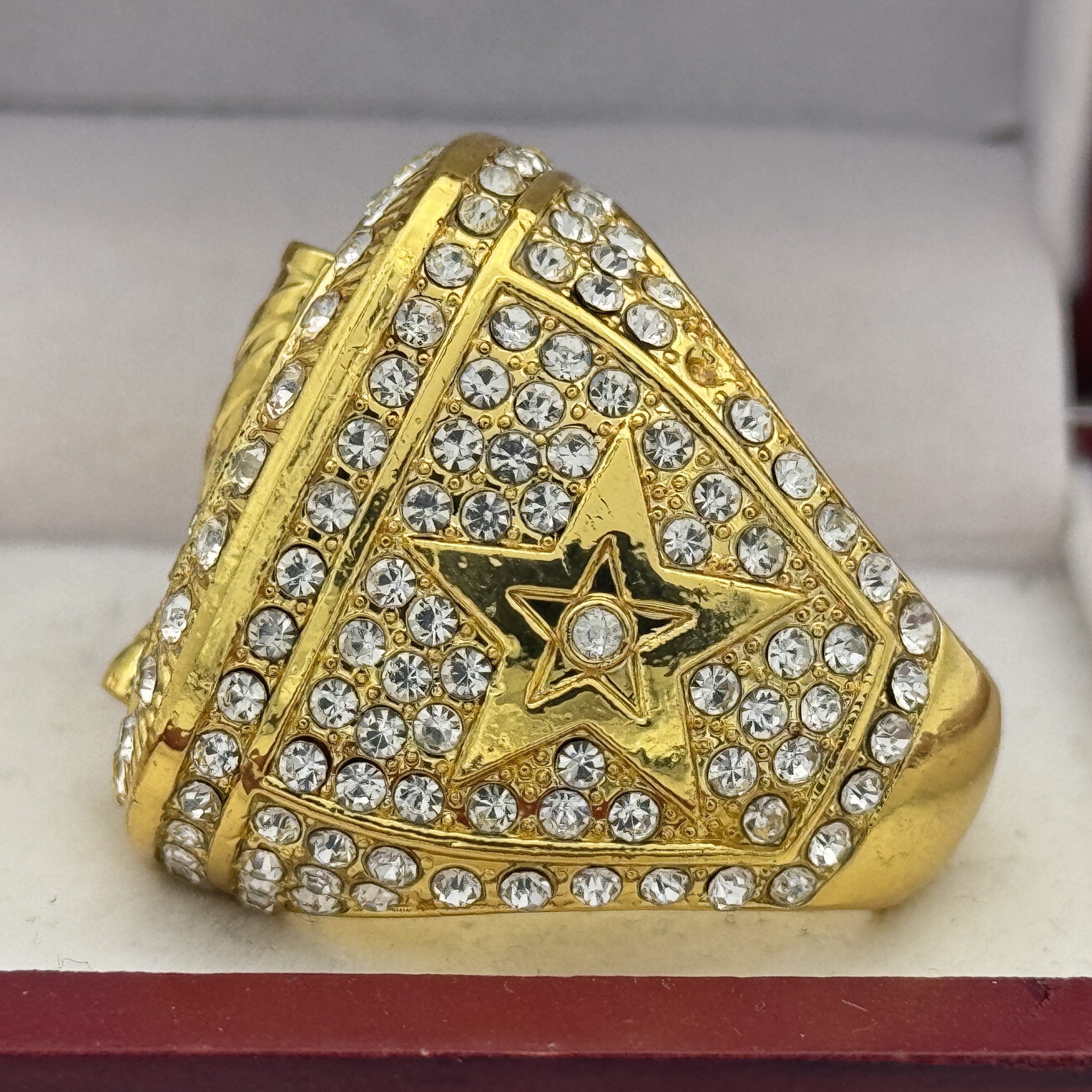 This ring is made of a zinc alloy. The ring body is gold in color. The stones on the side bezel are clear in color the stones in the top bezel are clear in color. The left side of the ring shows the American flag and the right side shows a star. The top of the ring shows trophy cuyp on top.Â