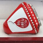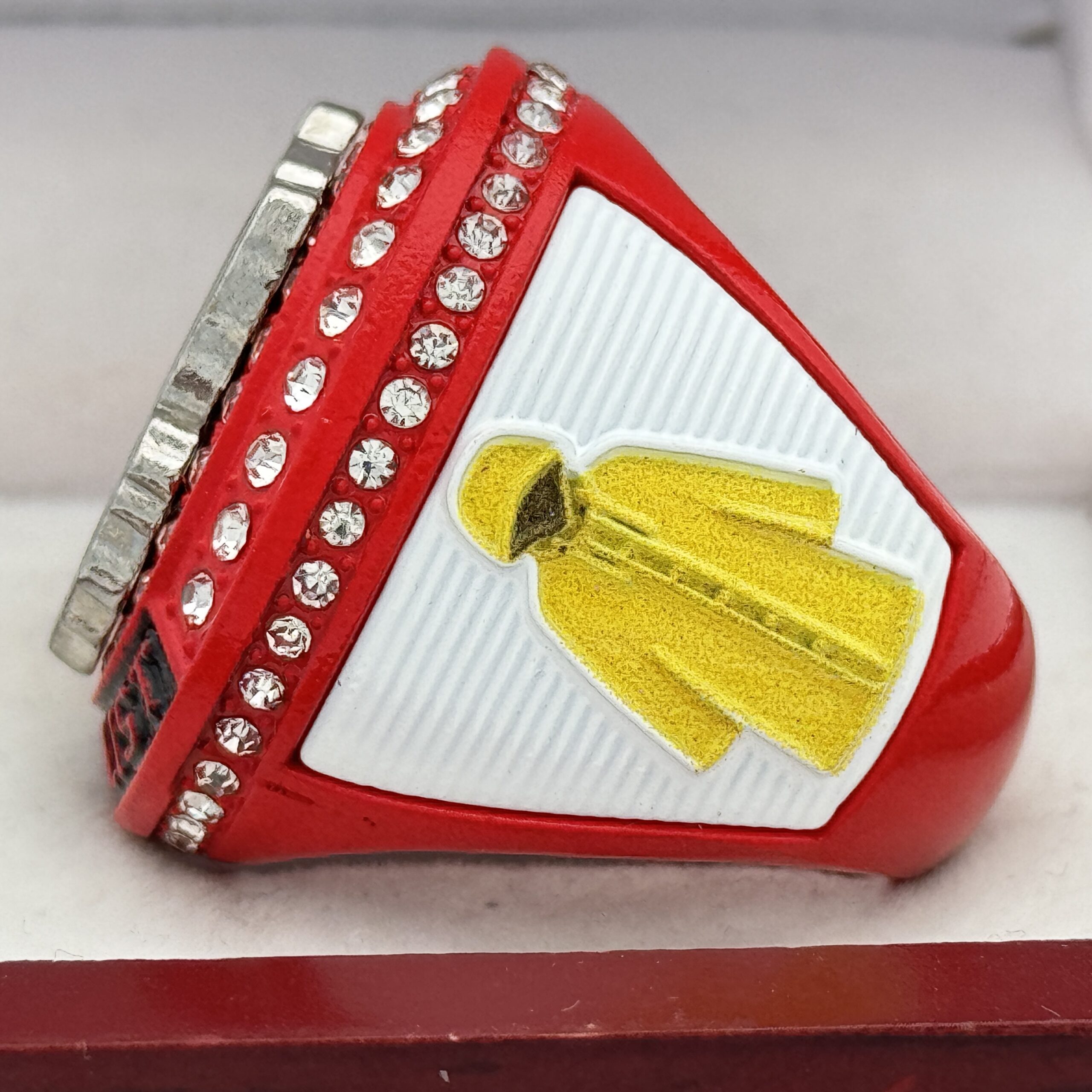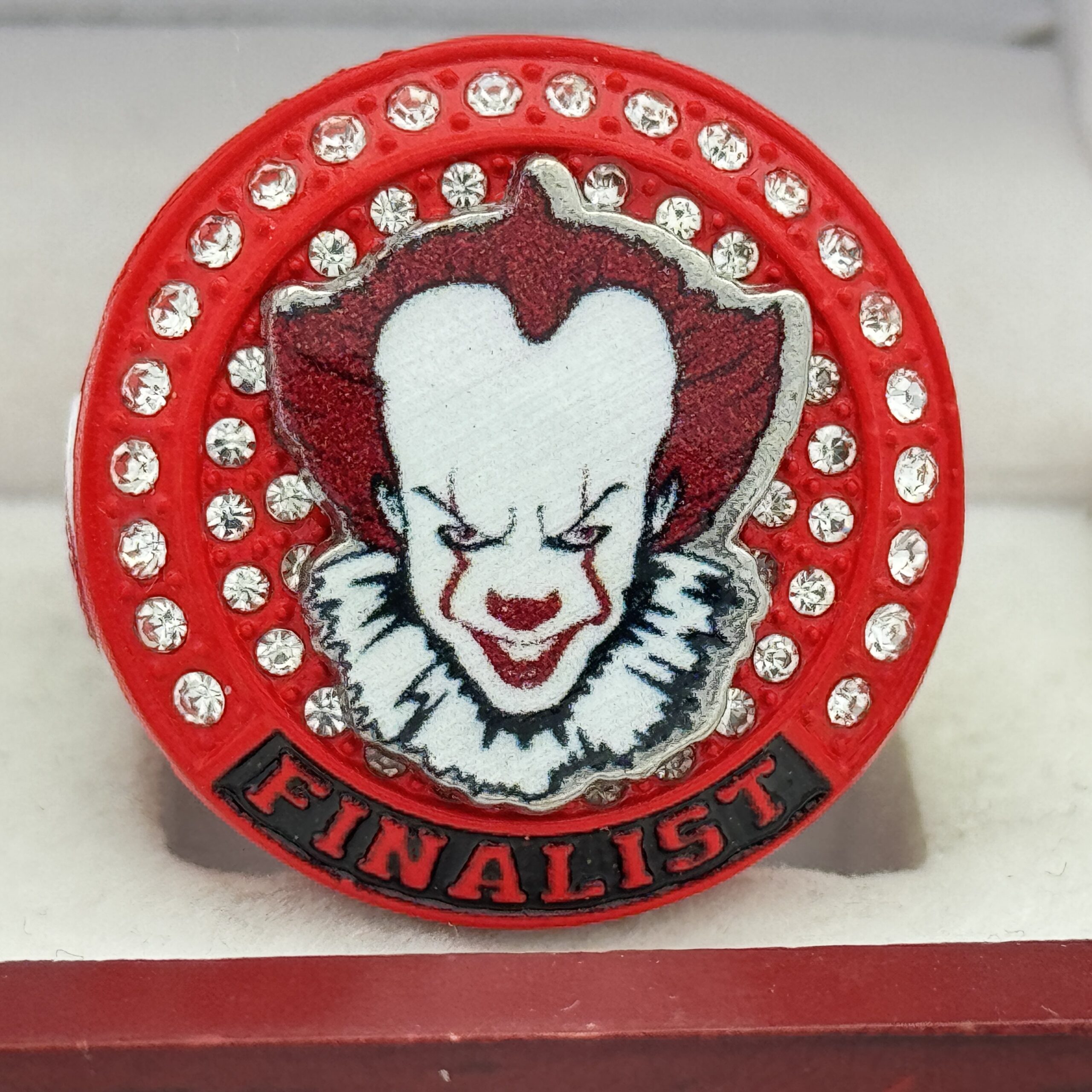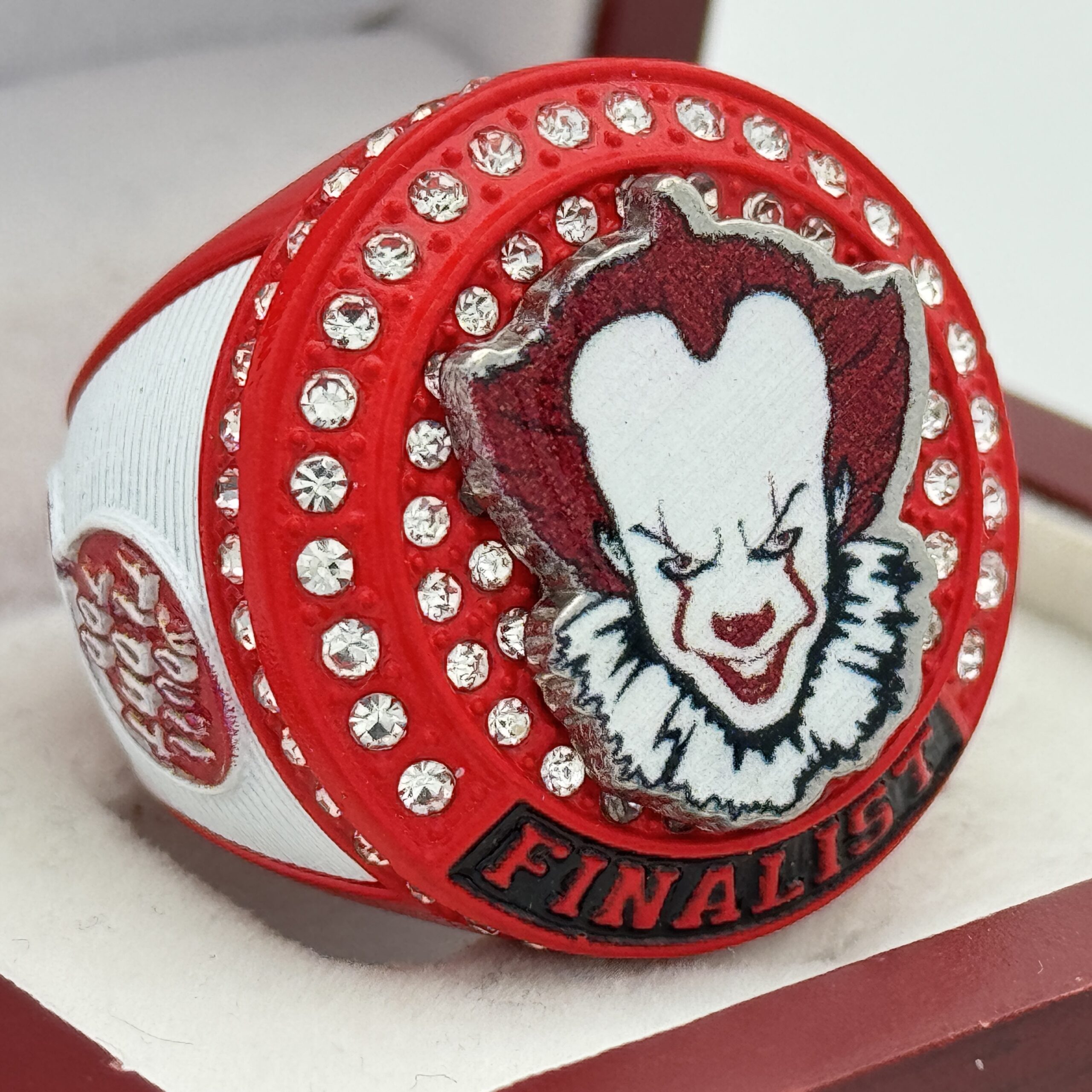 This ring is made of a zinc alloy. The ring body is red in color. The stones on the side bezel are clear in color. The stones in the top bezels are clear in color. There are white inserts on the sides of the rings. The left side of the ring shows a balloon and the right side shows yellow raincoat. The top of the ring shows a sinister clown.Â