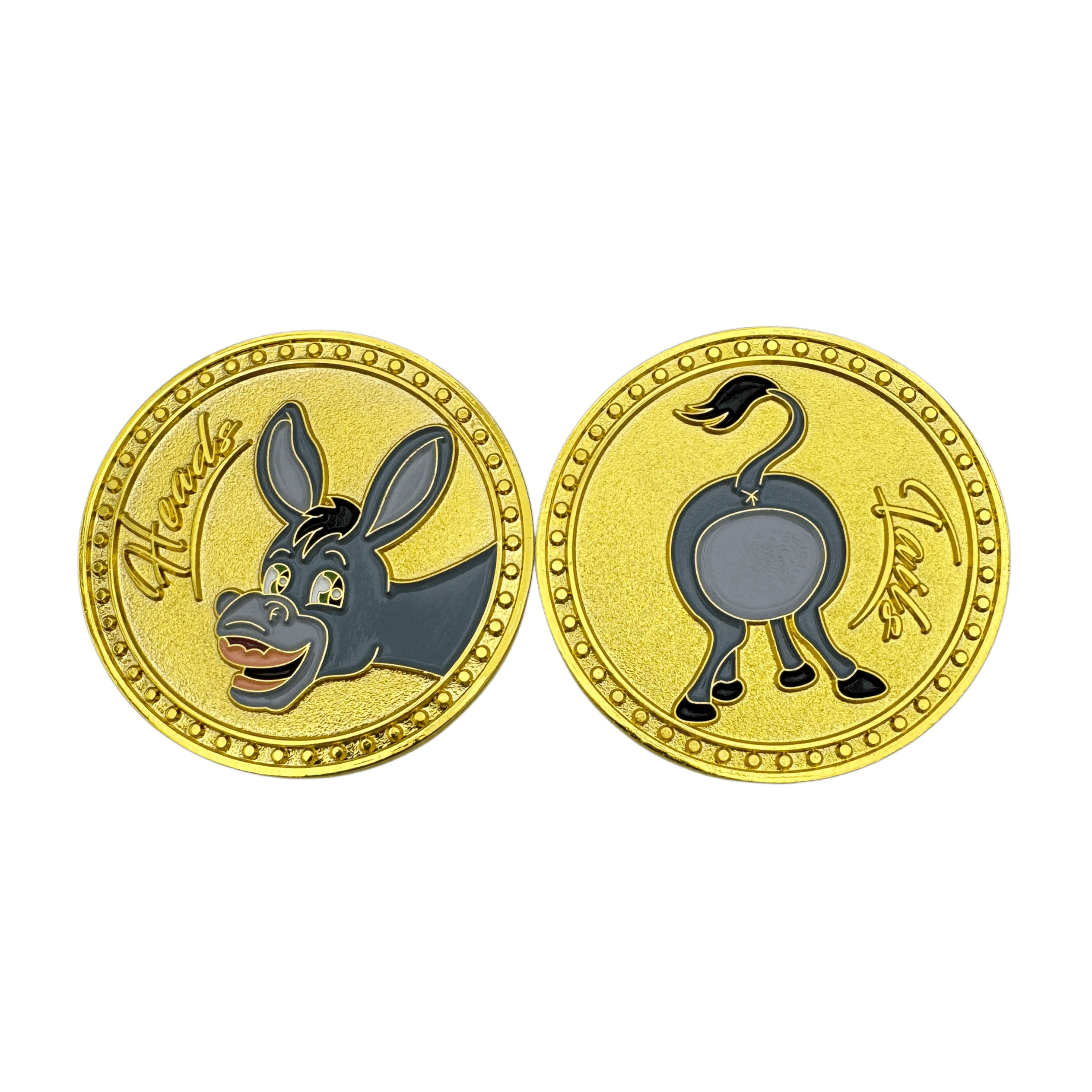 This coin is made of a zinc alloy. The coin is gold in color. The heads side of the coin shows a donkey’s face and the tails side of the coin shows a donkeys butt.