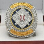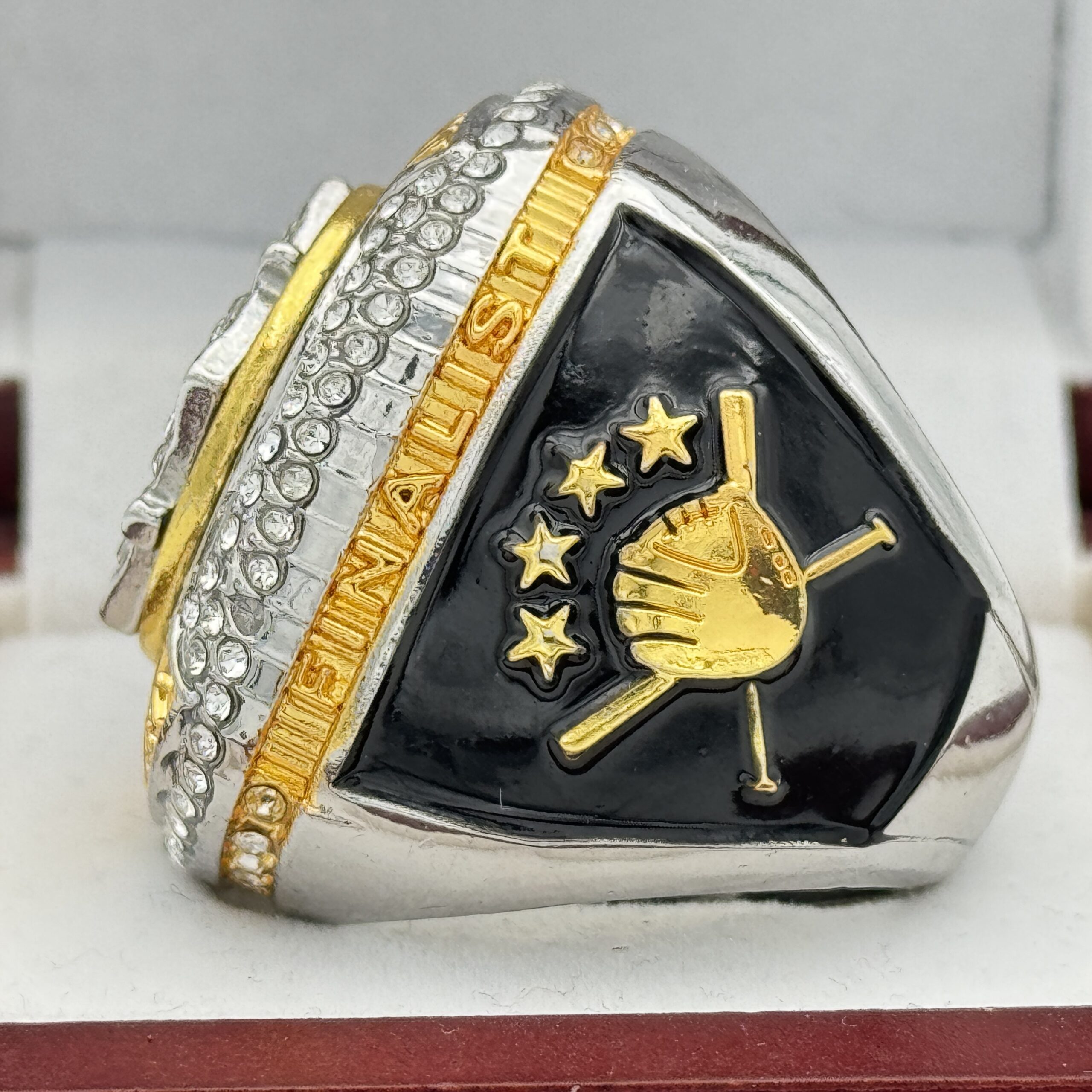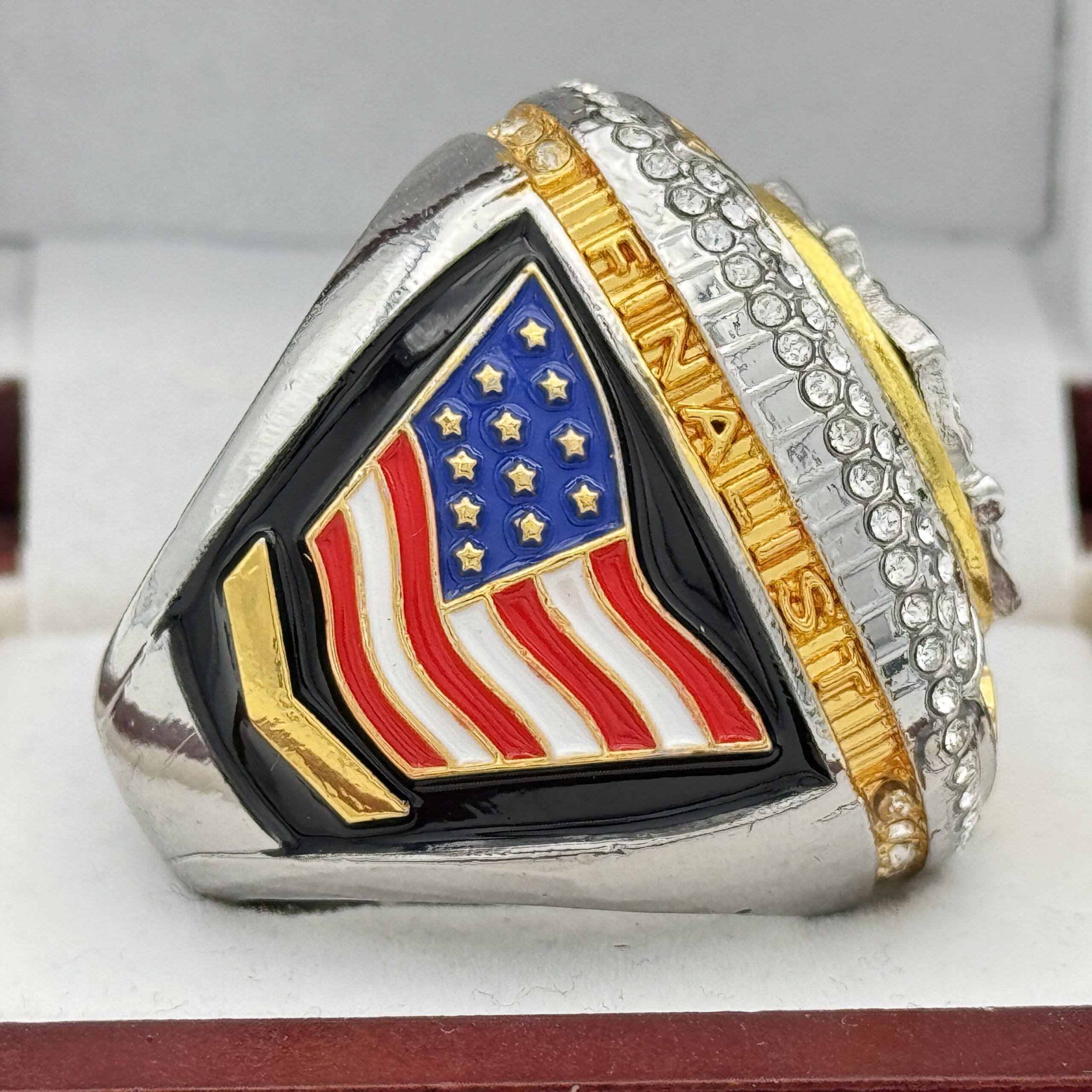 This ring is made of a zinc alloy. The ring body is silver in color with gold inlays. The stones on the side bezel are clear in color the stones in the top bezel are clear in color. There is black color paint on the sides of the rings. The left side of the ring shows an American Flag and the right side shows a glove with crossed bats in the background. The top of the ring shows a diamond with a ball and crossed bats in the background with clear stones and tournament finalist on the top.Â