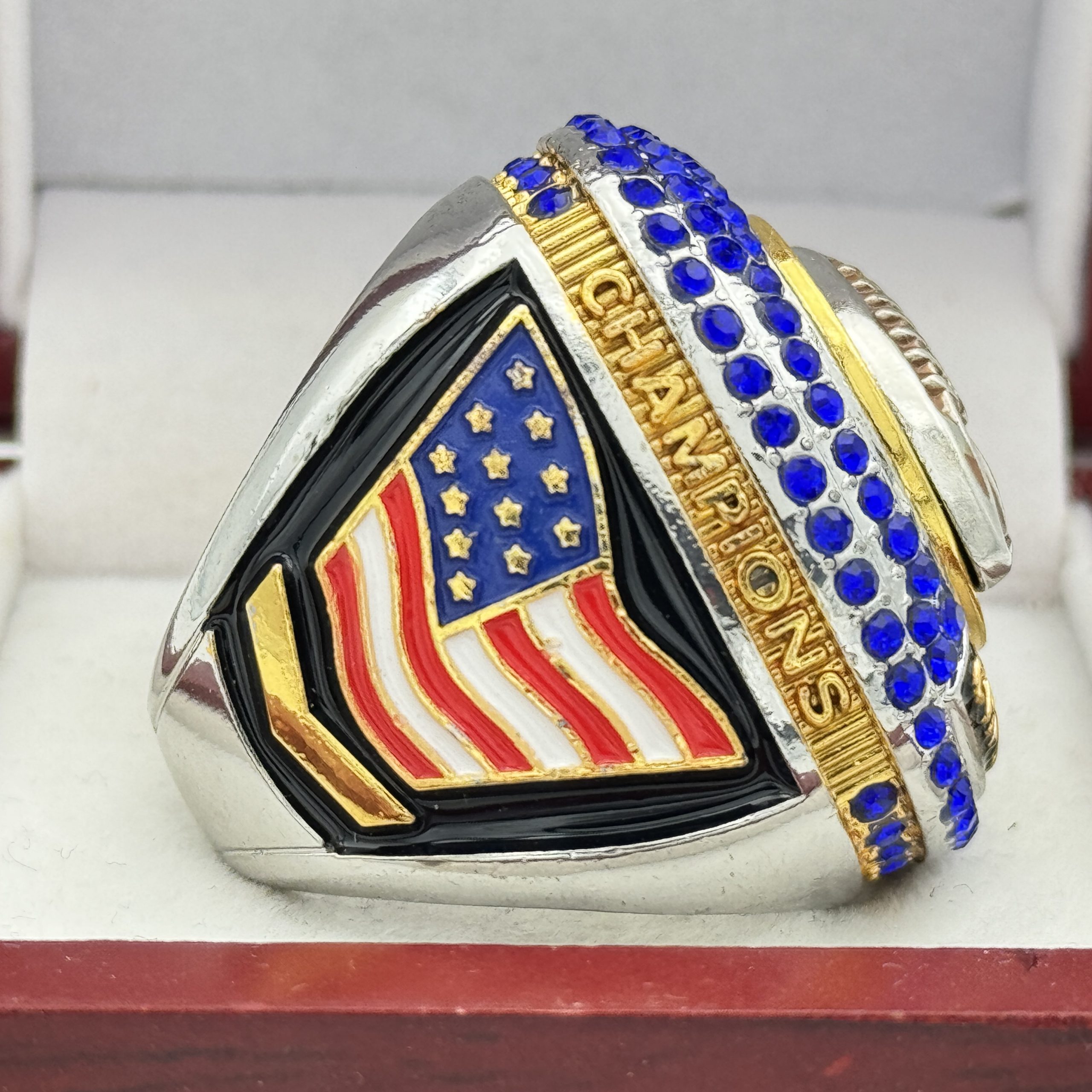 This ring is made of a zinc alloy. The ring body is silver in color with gold inlays. The stones on the side bezel are blue in color the stones in the top bezel are blue in color. There is black color paint on the sides of the rings. The left side of the ring shows an American Flag and the right side shows a football player. The top of the ring shows a football and tournament champions on the top.Â