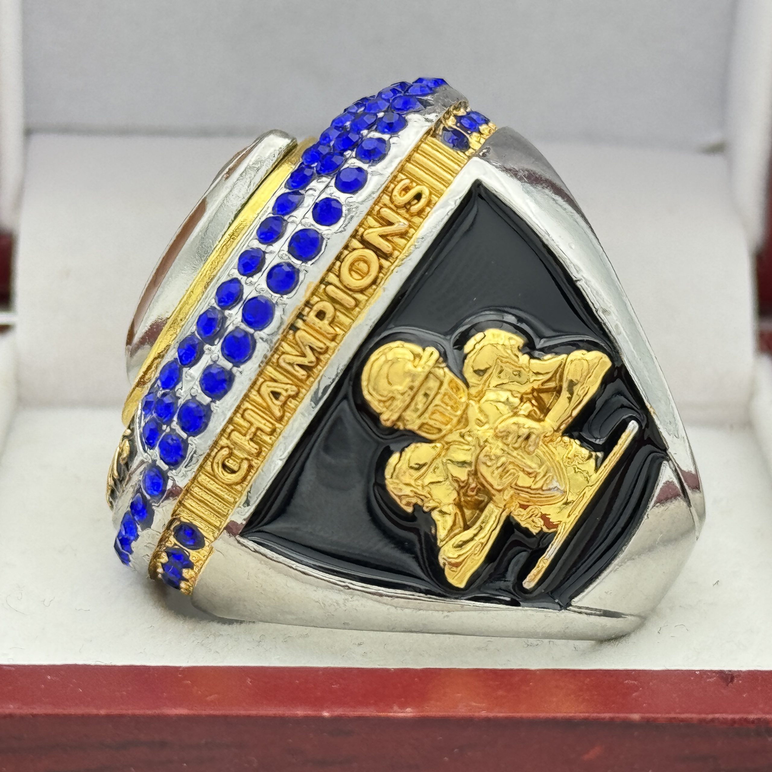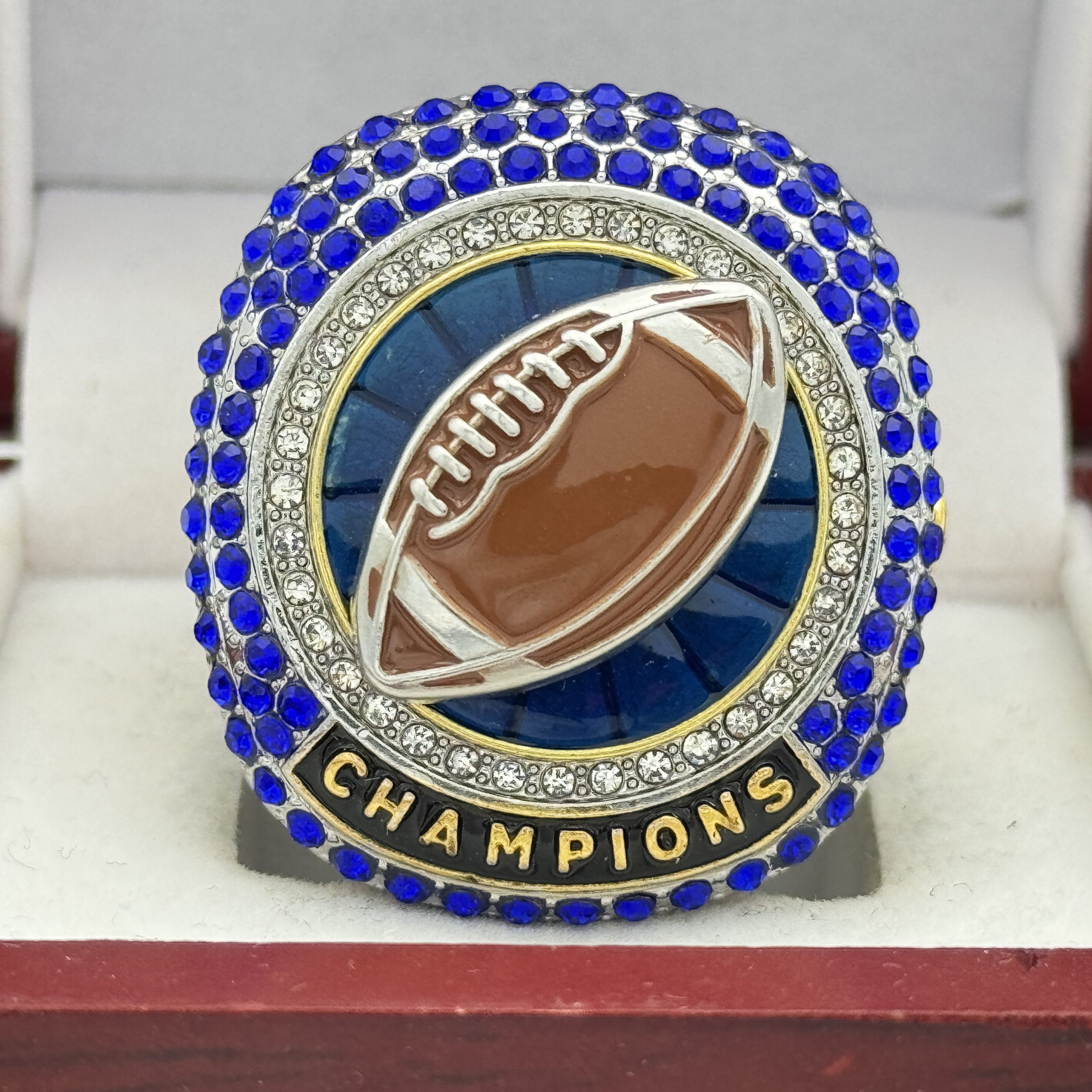 JUMBO FOOTBALL CHAMPION RING — BLUE BACKGROUND, BLUE STONES (Item # 51-04)