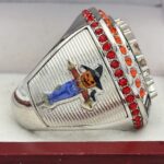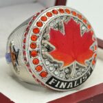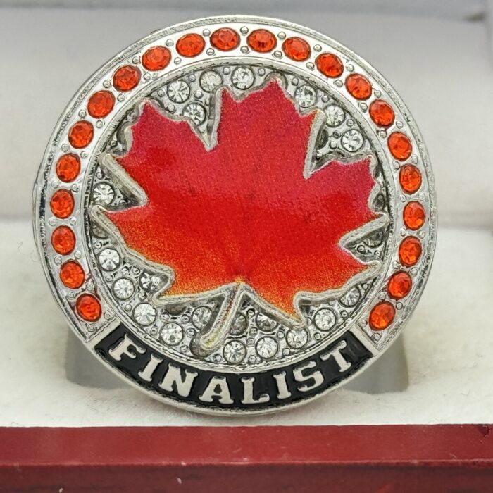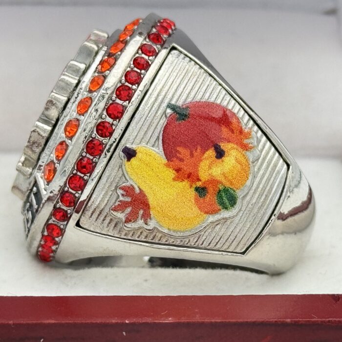 This ring is made of a zinc alloy. The ring body is silver in color. The stones on the side bezel are red in color. The stones in the top bezels are orange in color. There are silver inserts on the sides of the rings. The left side of the ring shows a scarecrow and the right side shows an assortment of pumpkins and gourds. The top of the ring shows a maple leaf and finalist.Â