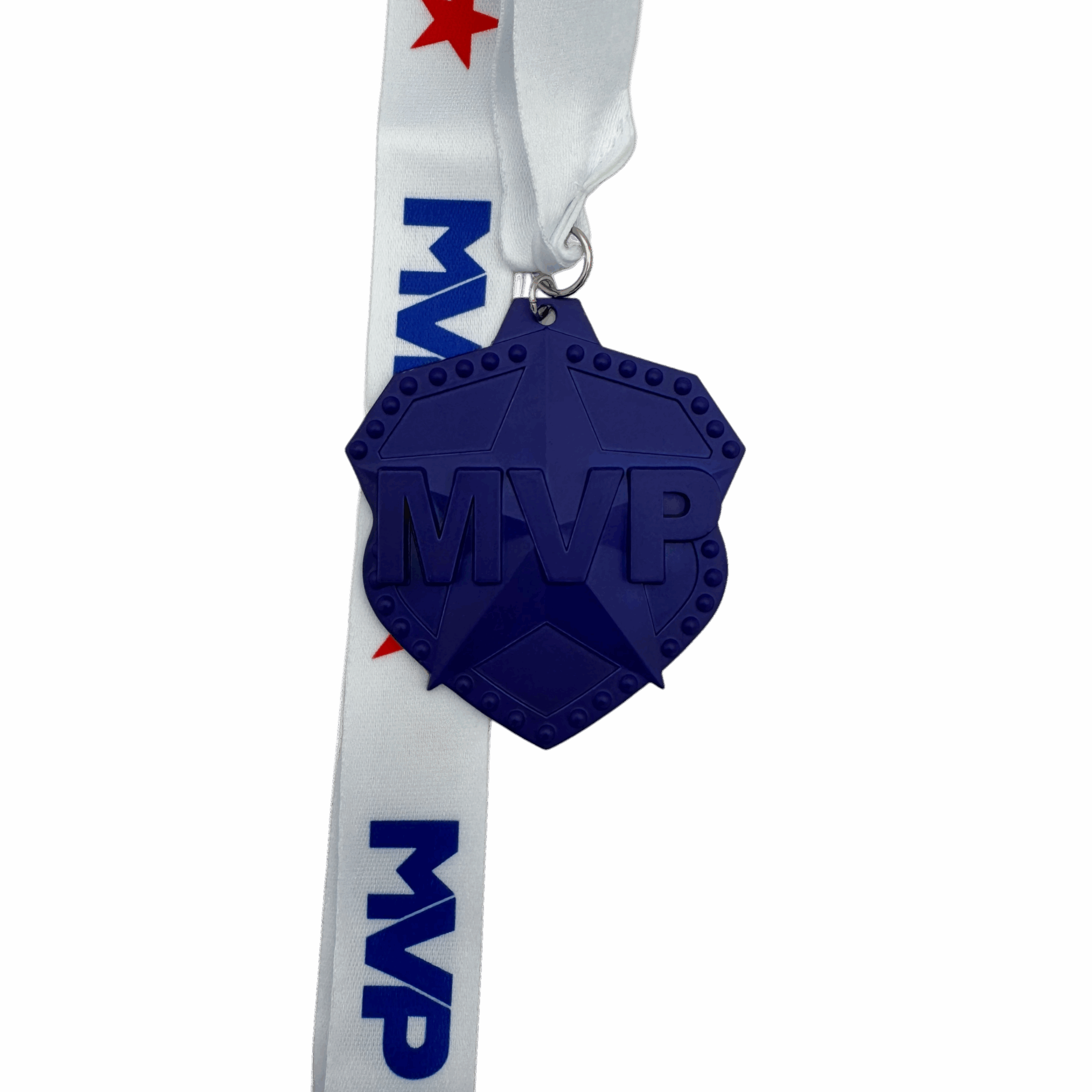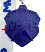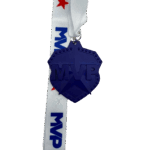 All of our medals are made of a zinc alloy. The medal is 2.75″ by 3″ with an 18″ ribbon. These medals are blue in color and shows MVP on top of a star. The ribbon is white with MVP and a star.Â