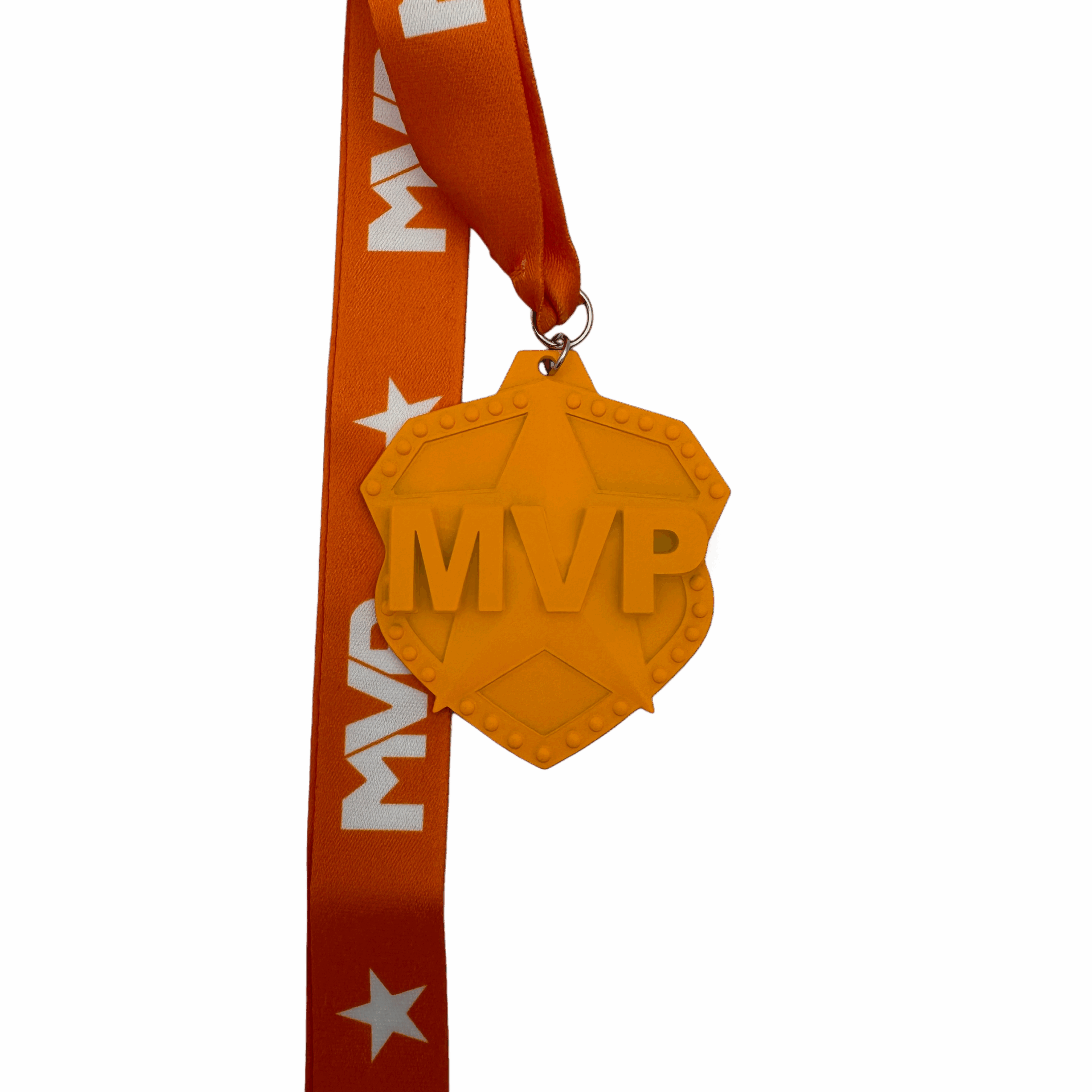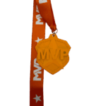 All of our medals are made of a zinc alloy. The medal is 2.75″ by 3″ with an 18″ ribbon. These medals are orange in color and shows MVP on top of a star. The ribbon is orange with MVP and a star.