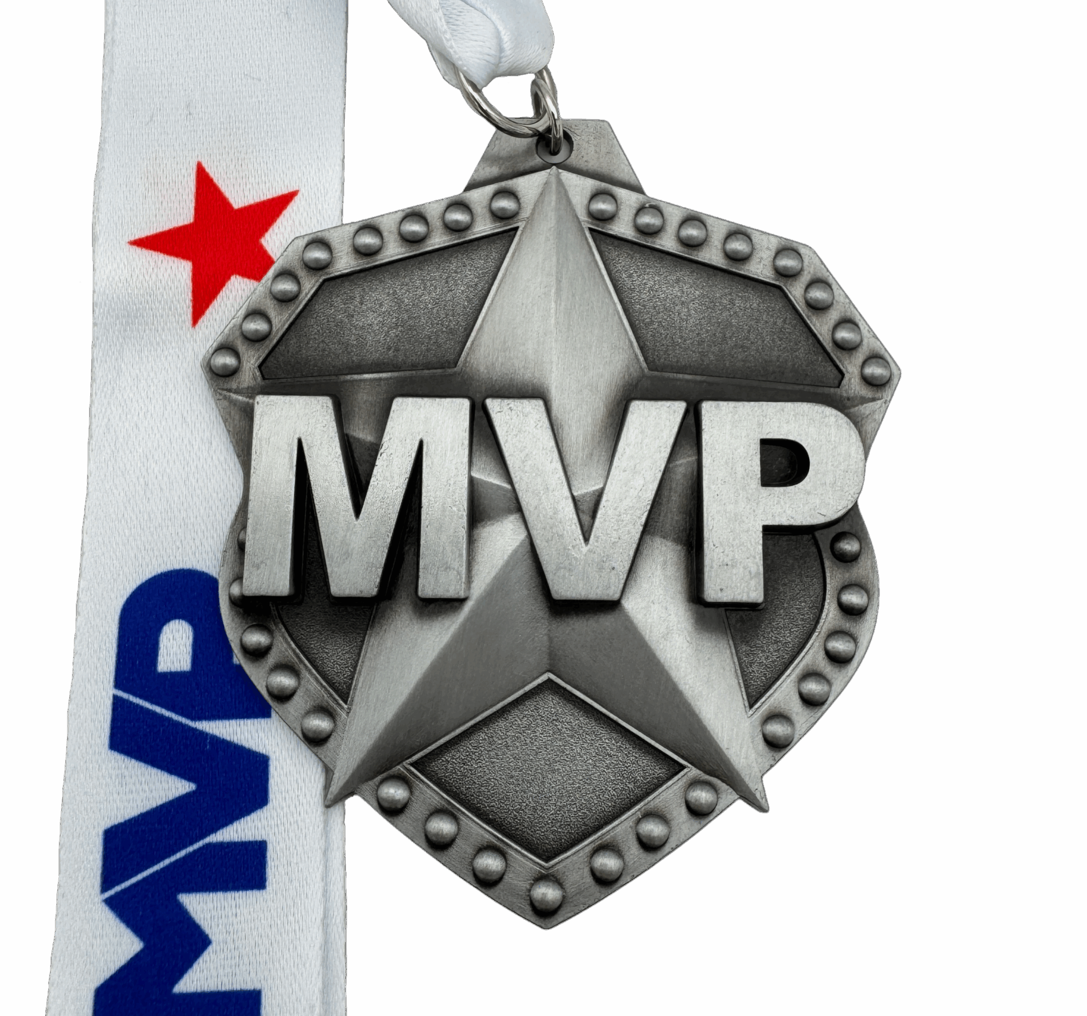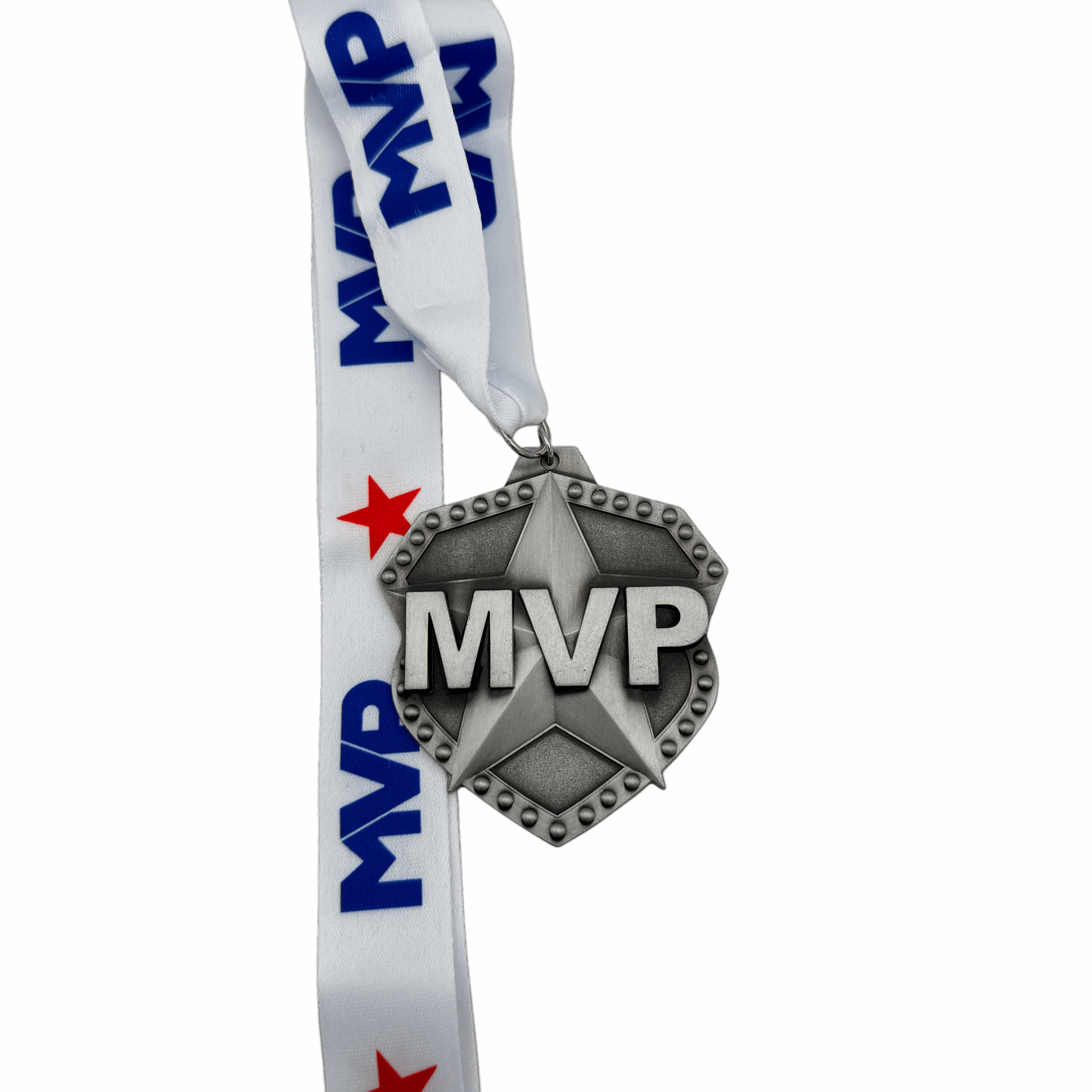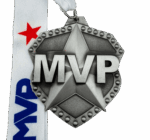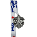 All of our medals are made of a zinc alloy. The medal is 2.75″ by 3″ with an 18″ ribbon. These medals are silver in color and shows MVP on top of a star. The ribbon is white with MVP and a star.