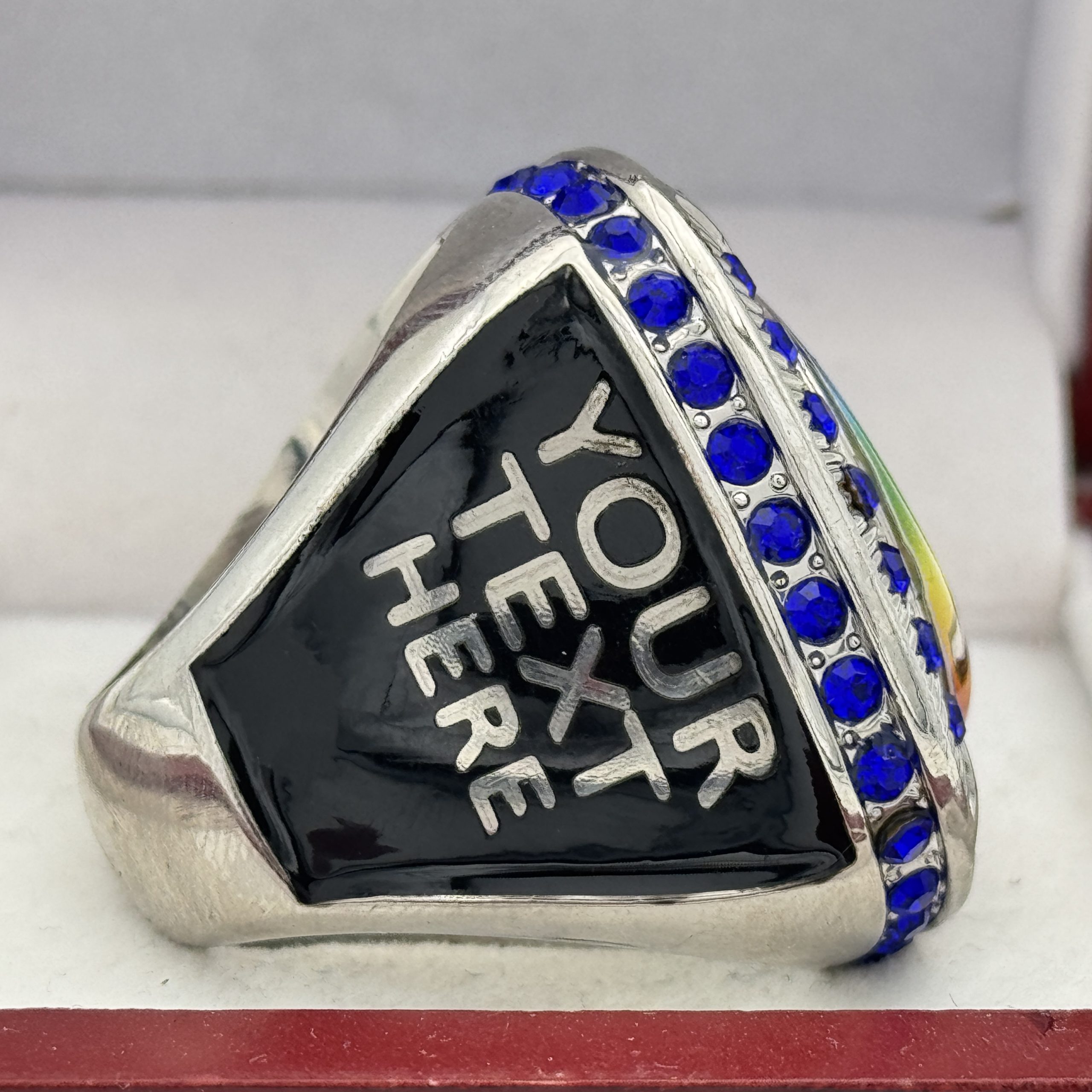 ROUND ADD YOUR LOGO CHAMPION RING — SILVER BODY, BLUE STONES, 2 ENGRAVABLE SIDES (Item #59-172)