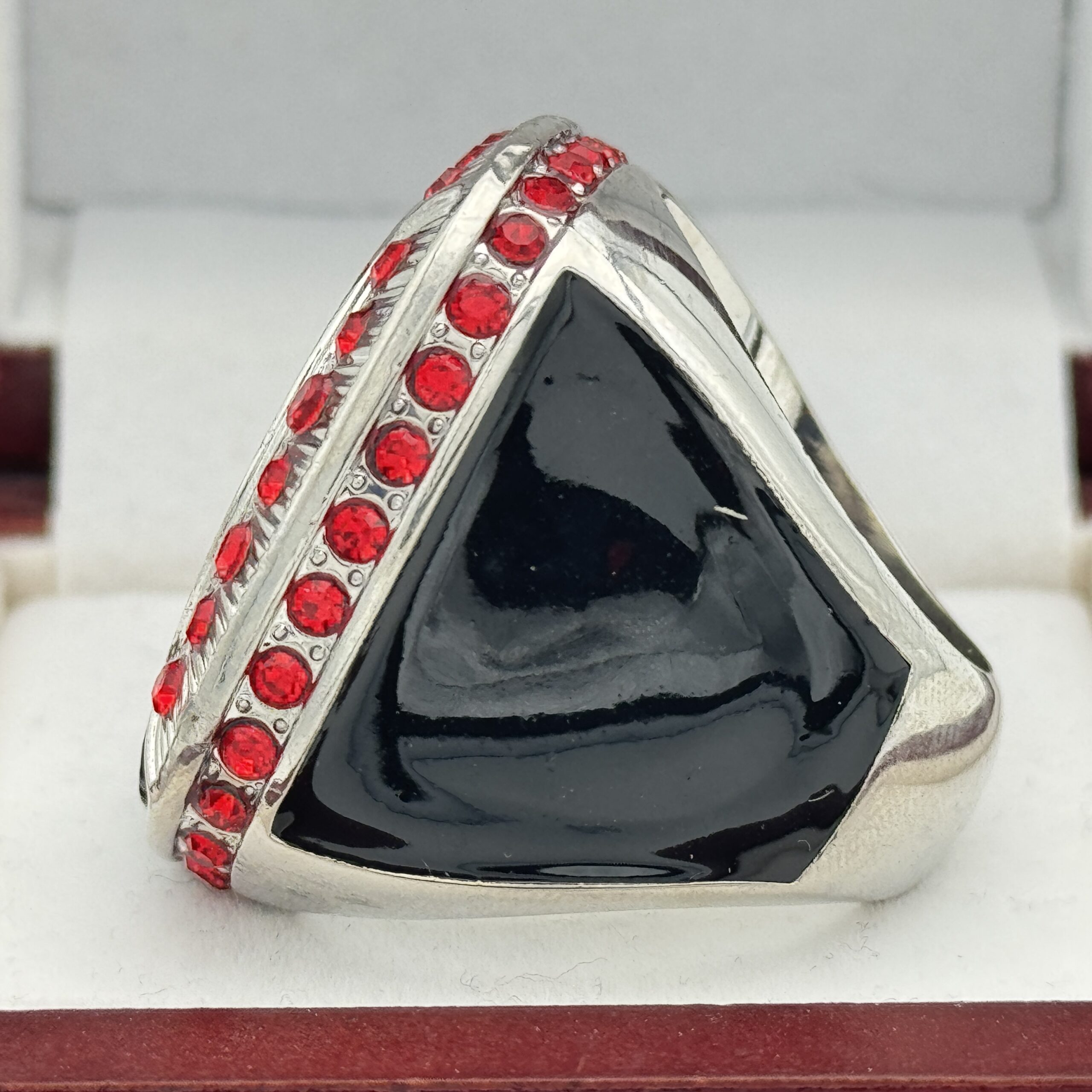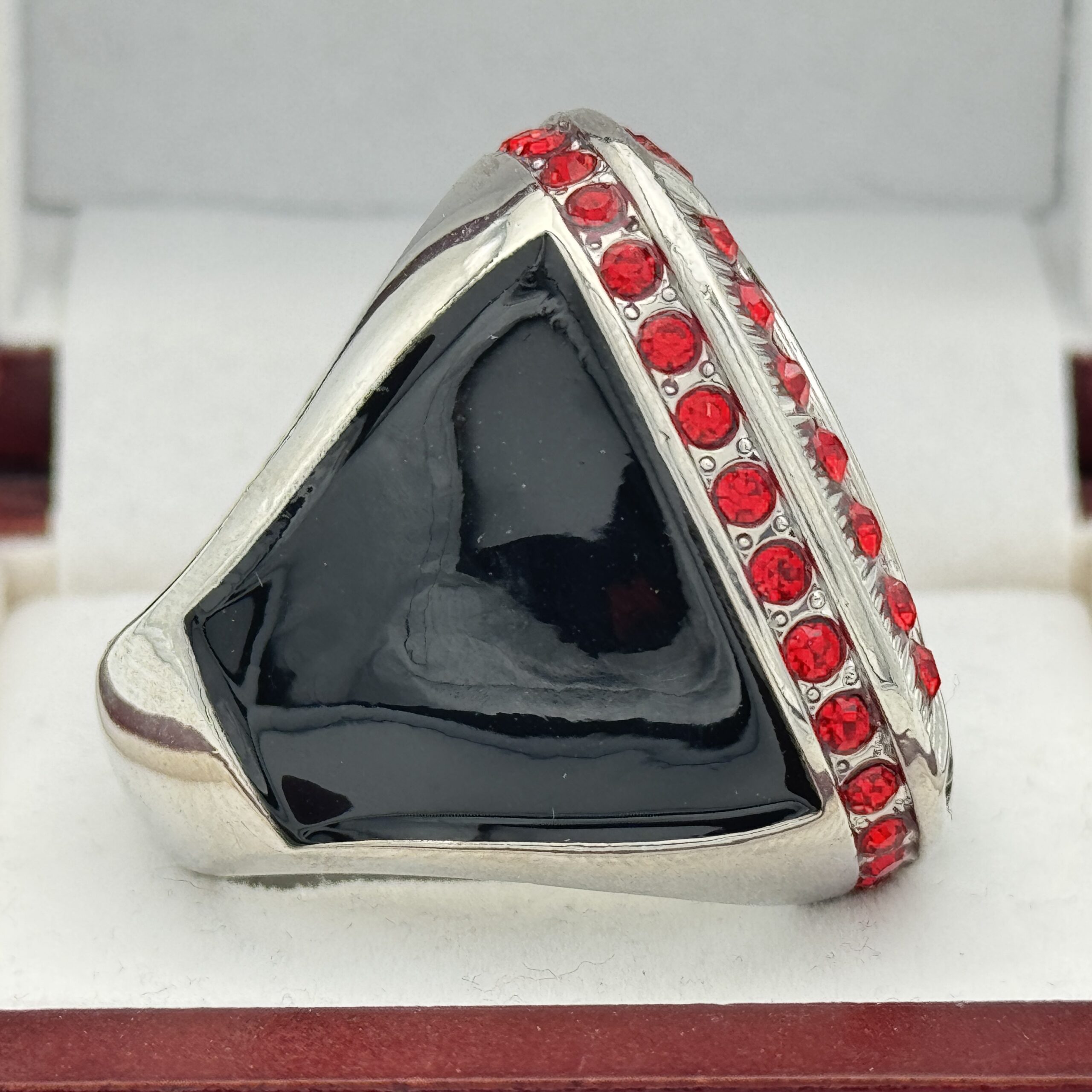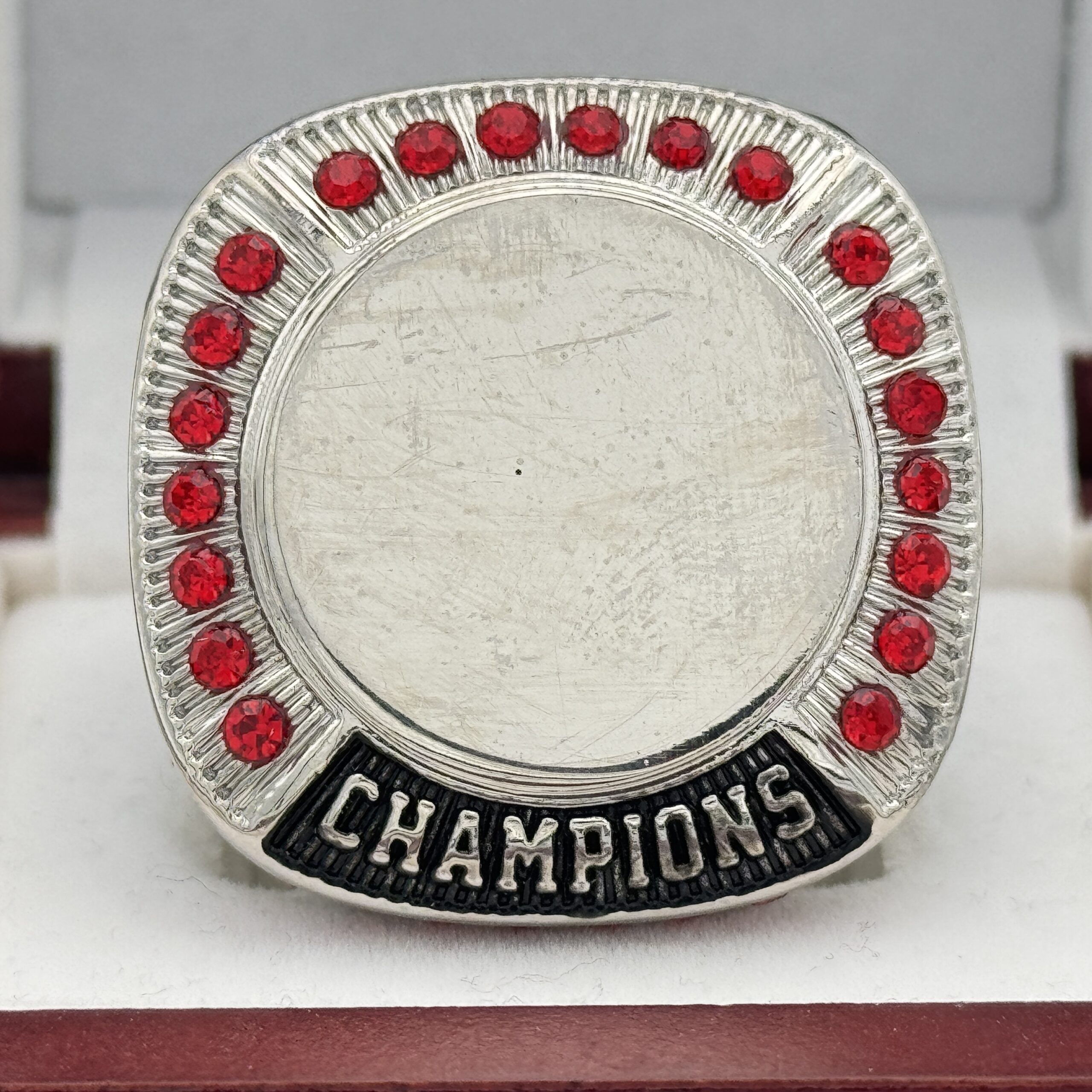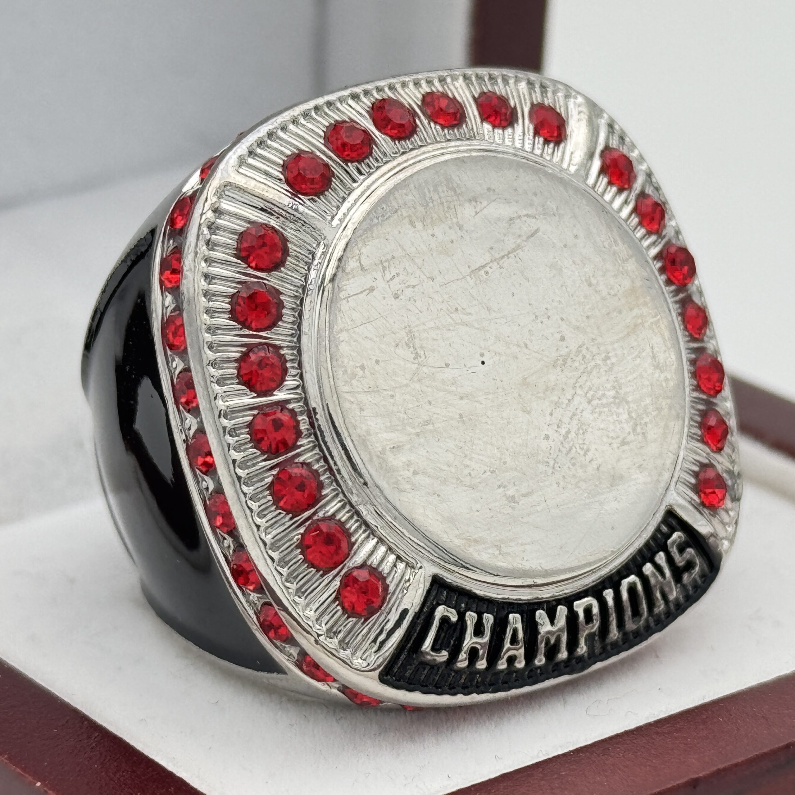 This ring is made of a zinc alloy. The ring body is silver in color. The stones on the side bezel are red in color and the stones in the top bezels are red in color. The sides of the ring are black for customization. The top of the ring is blank for adding your logo with champions.Â