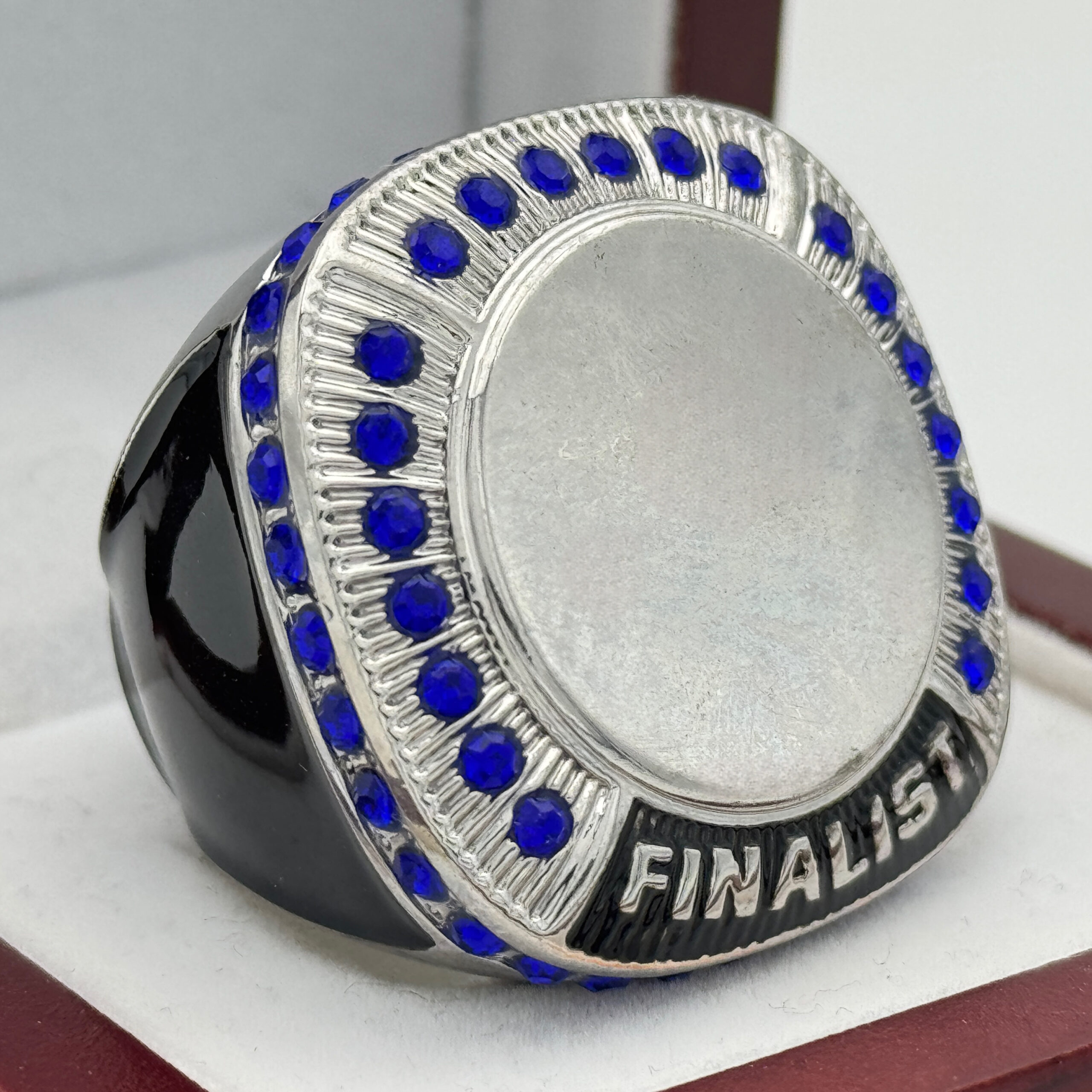 ROUND ADD YOUR LOGO FINALIST RING — SILVER BODY, BLUE STONES, 2 ENGRAVABLE SIDES (Item #58-169)