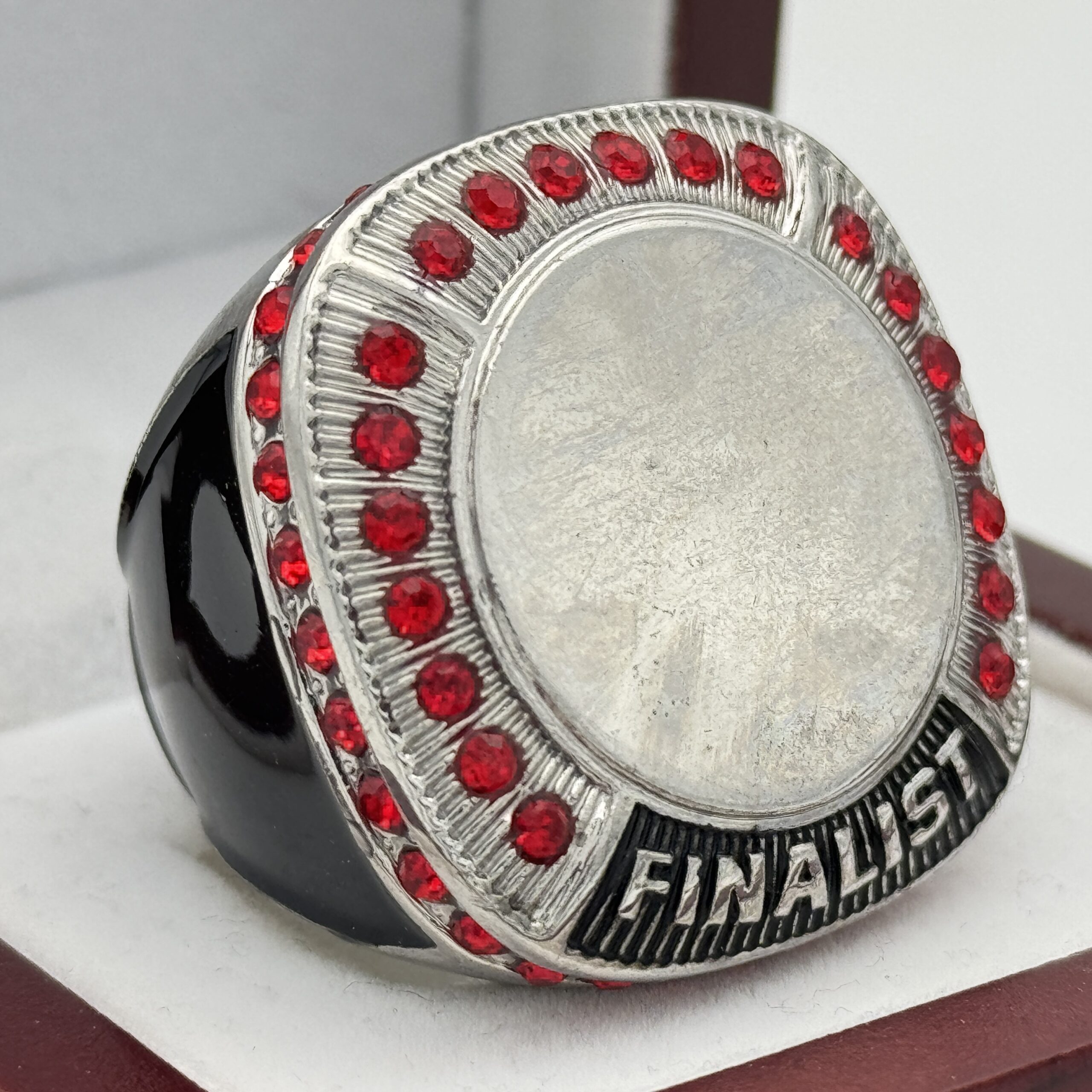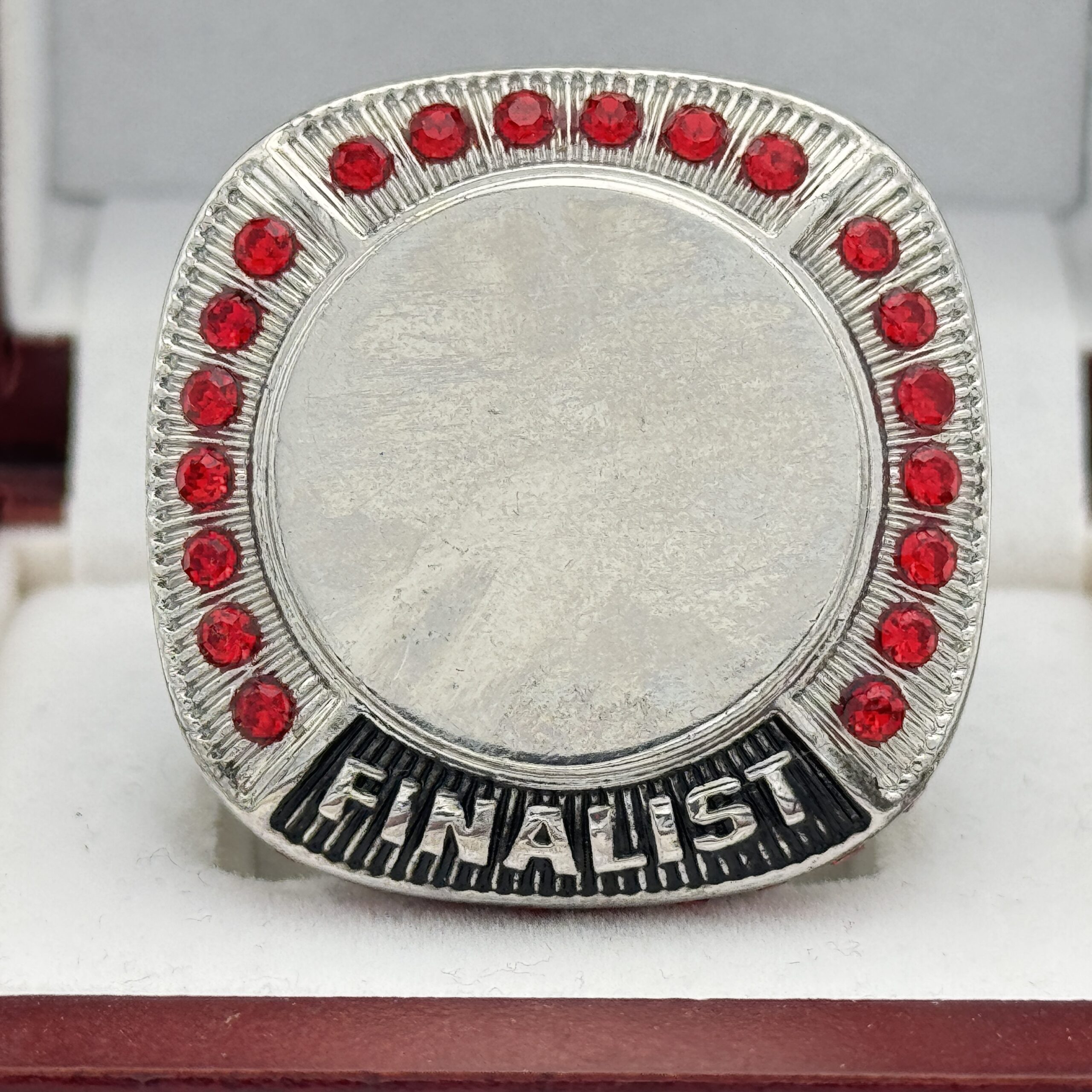 ROUND ADD YOUR LOGO FINALIST RING — SILVER BODY, RED STONES, 2 ENGRAVABLE SIDES (Item #58-161)