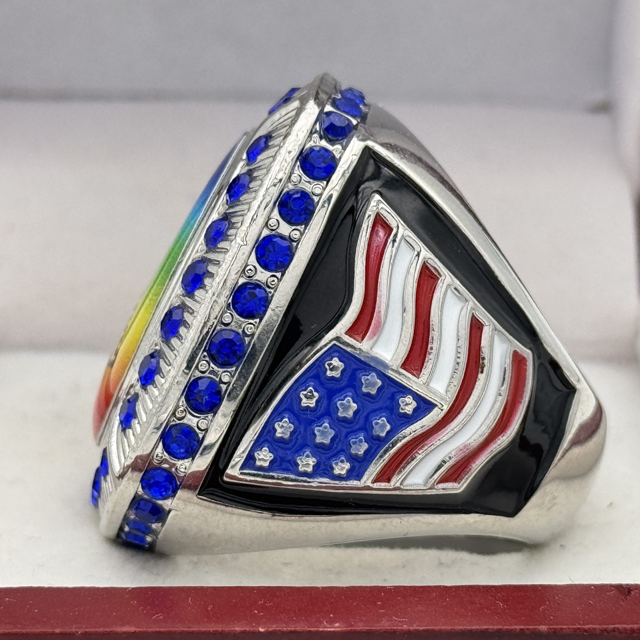 This ring is made of a zinc alloy. The ring body is silver in color. The stones on the side bezel are blue in color and the stones in the top bezels are blue in color. The left side of the ring shows an American flag and the right side shows a trophy cup. The top of the ring is blank for adding your logo.Â