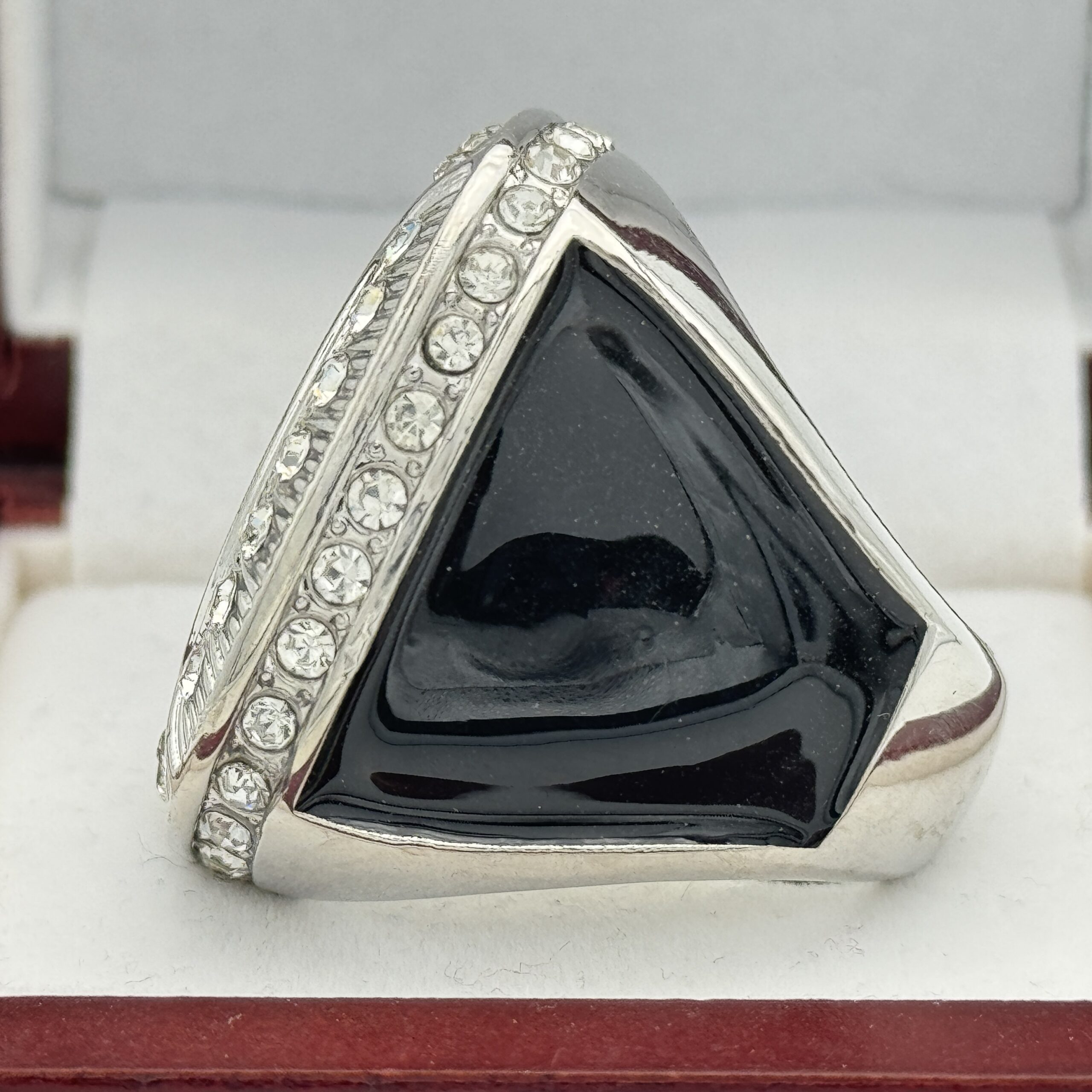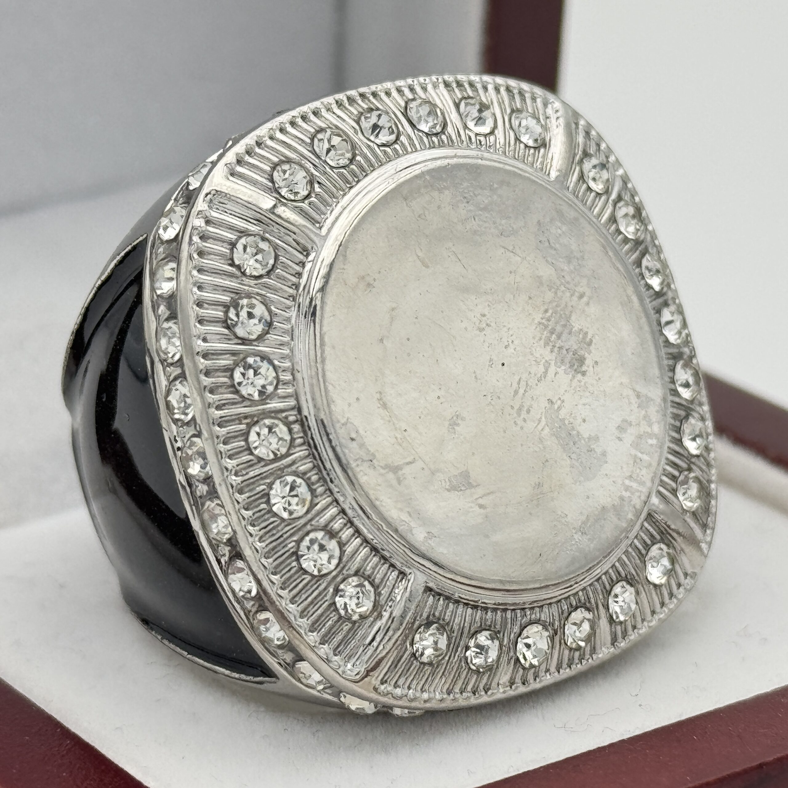 This ring is made of a zinc alloy. The ring body is silver in color. The stones on the side bezel are clear in color and the stones in the top bezels are clear in color. The sides of the ring are black for customization. The top of the ring is blank for adding your logo.Â