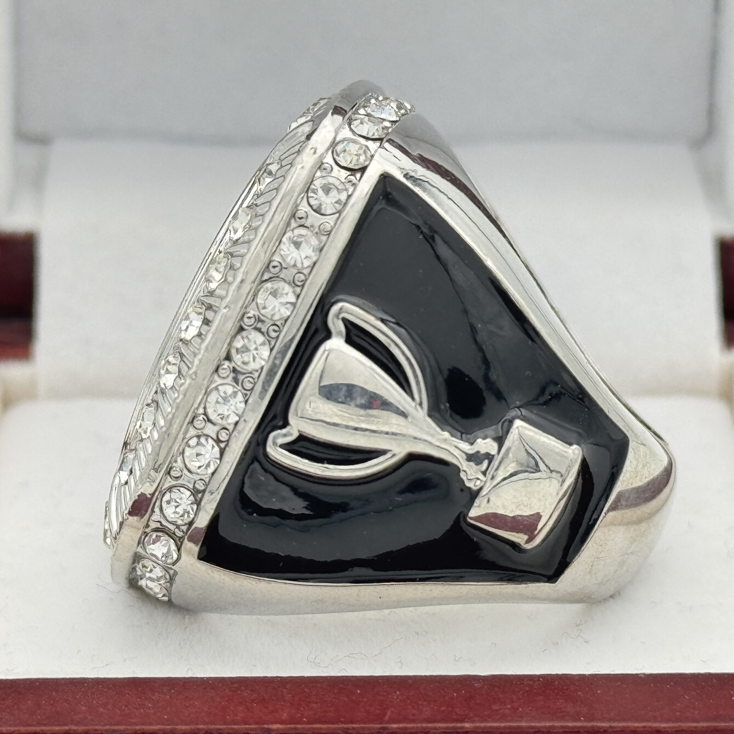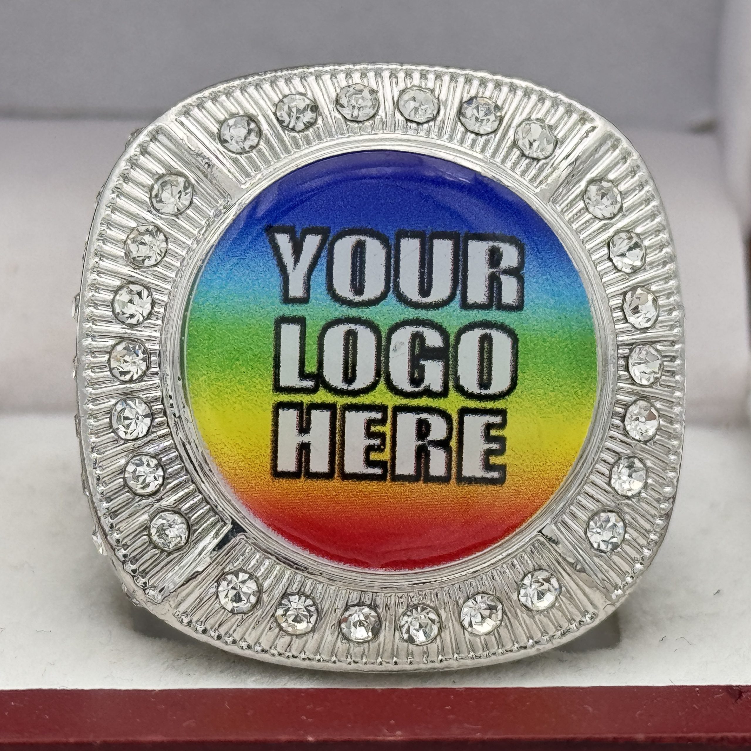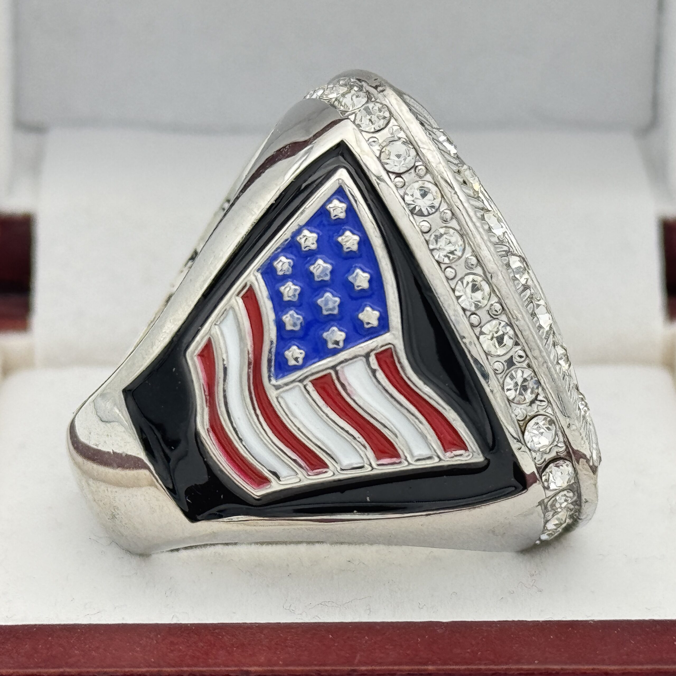 This ring is made of a zinc alloy. The ring body is silver in color. The stones on the side bezel are clear in color and the stones in the top bezels are clear in color. The left side of the ring shows an American flag and the right side shows a trophy cup. The top of the ring is blank for adding your logo.Â