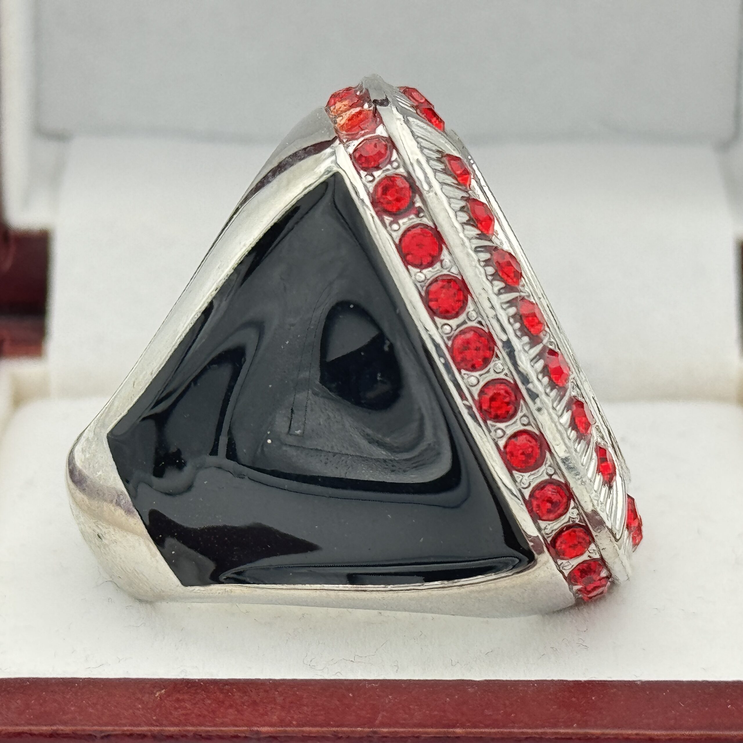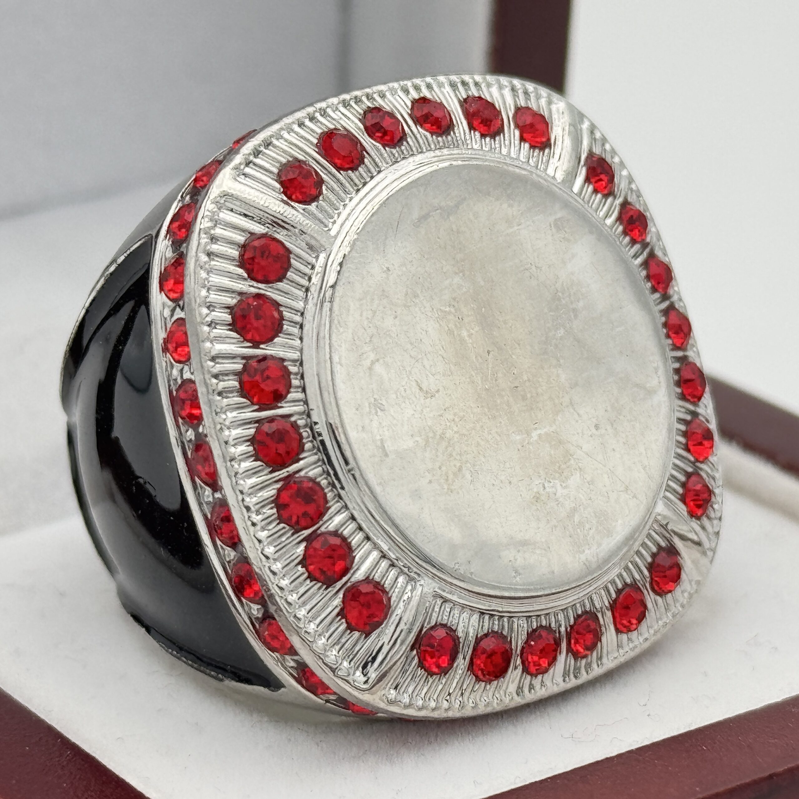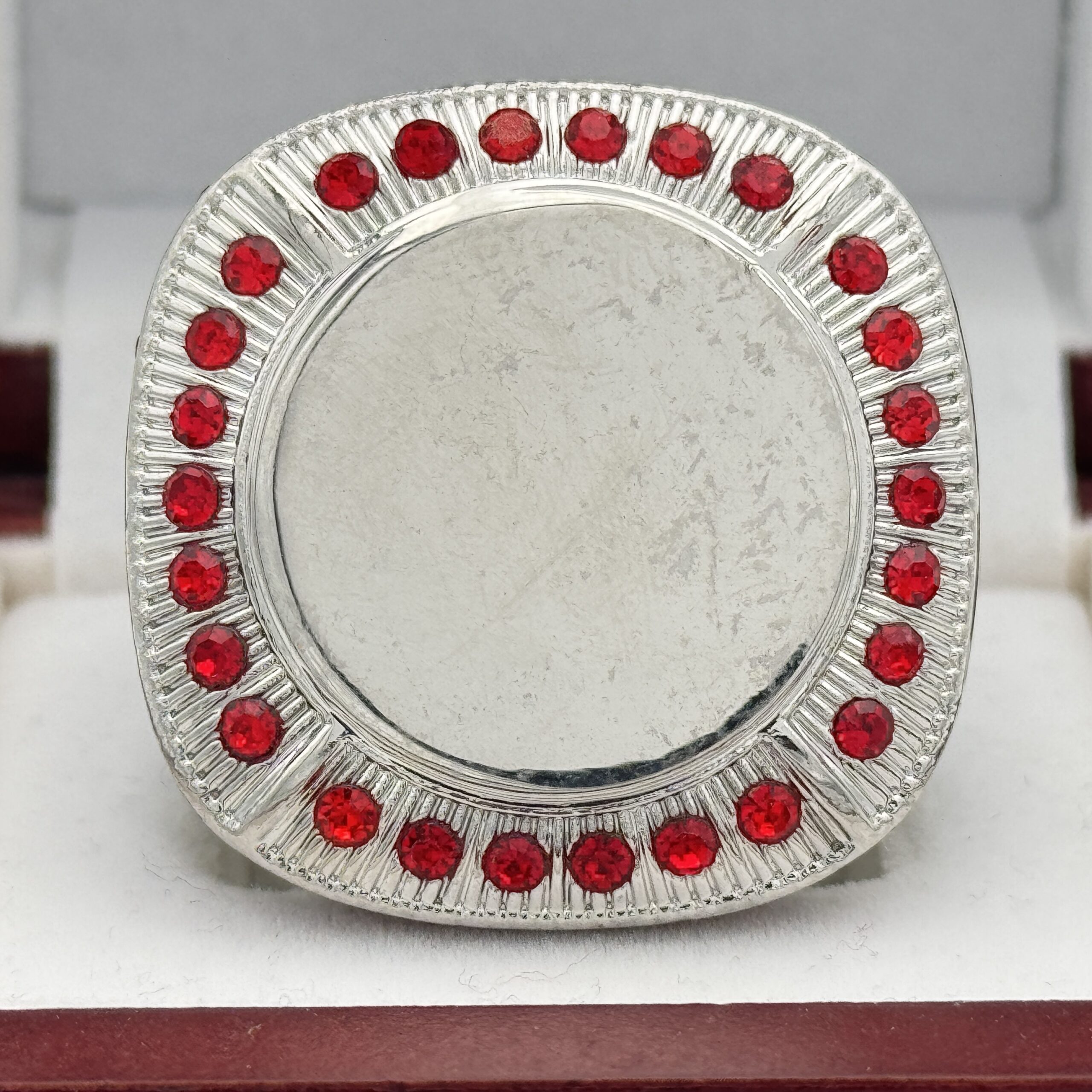 This ring is made of a zinc alloy. The ring body is silver in color. The stones on the side bezel are red in color and the stones in the top bezels are red in color. The sides of the ring are black for customization. The top of the ring is blank for adding your logo.Â