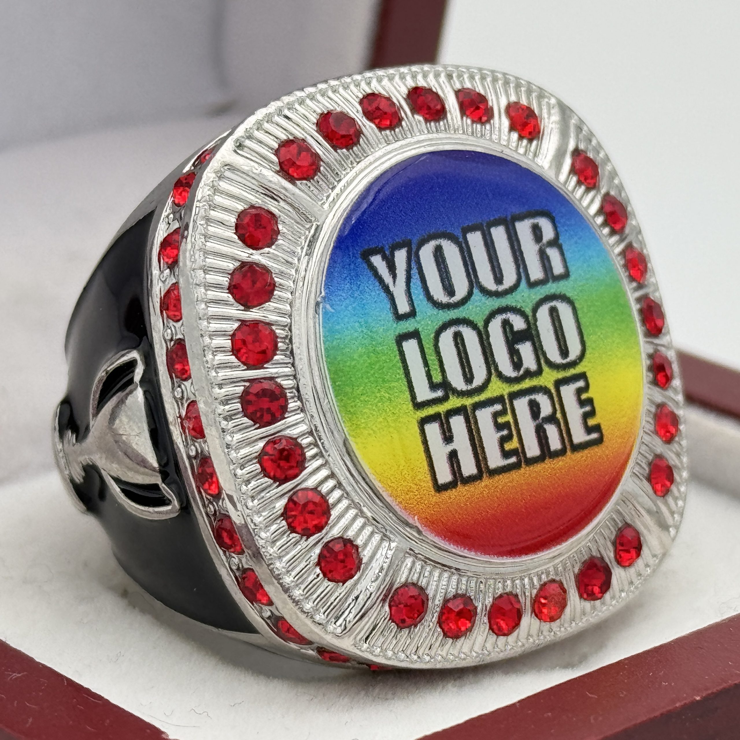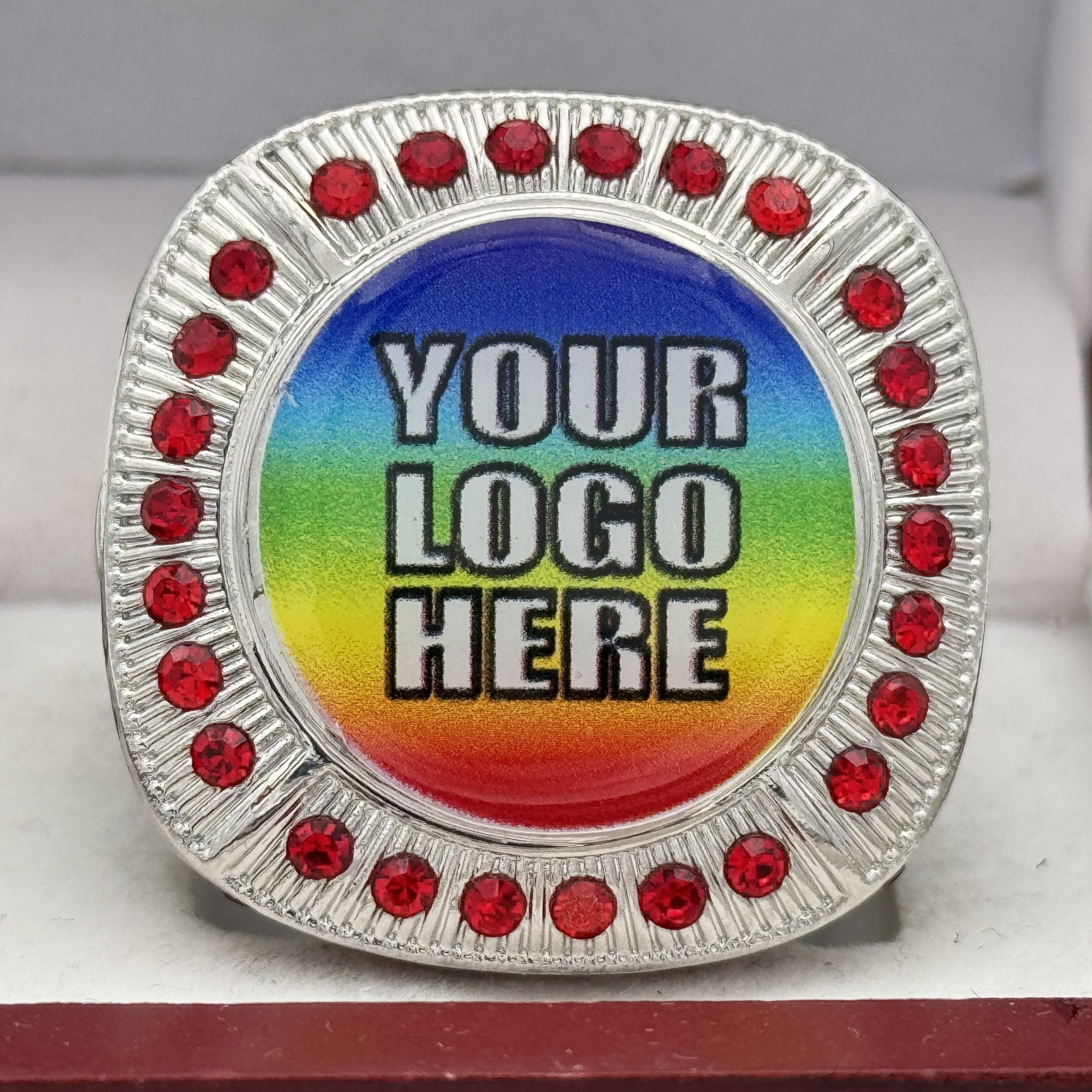 ROUND ADD YOUR LOGO RING — SILVER BODY, RED STONES (Item #58-209)