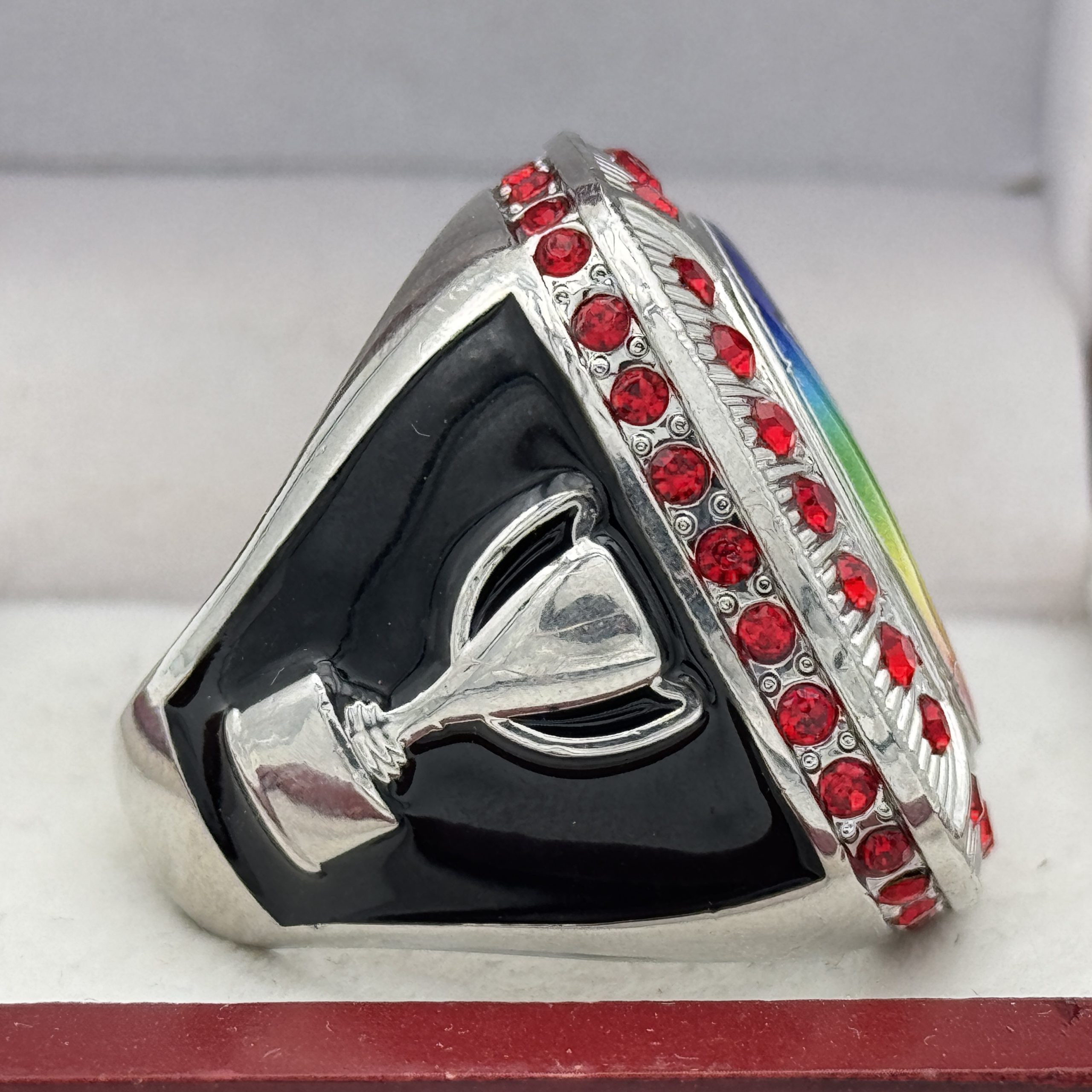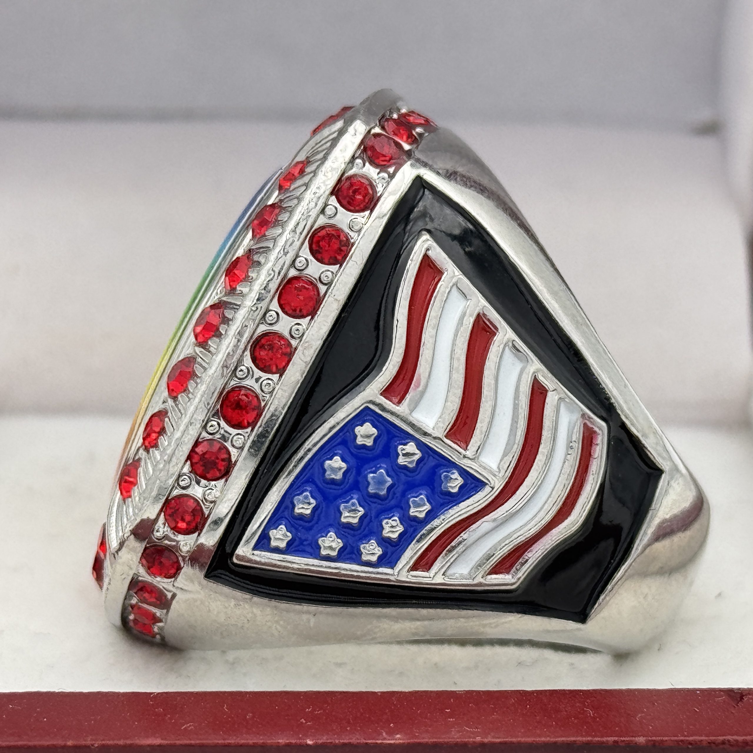 This ring is made of a zinc alloy. The ring body is silver in color. The stones on the side bezel are red in color and the stones in the top bezels are red in color. The left side of the ring shows an American flag and the right side shows a trophy cup. The top of the ring is blank for adding your logo.Â