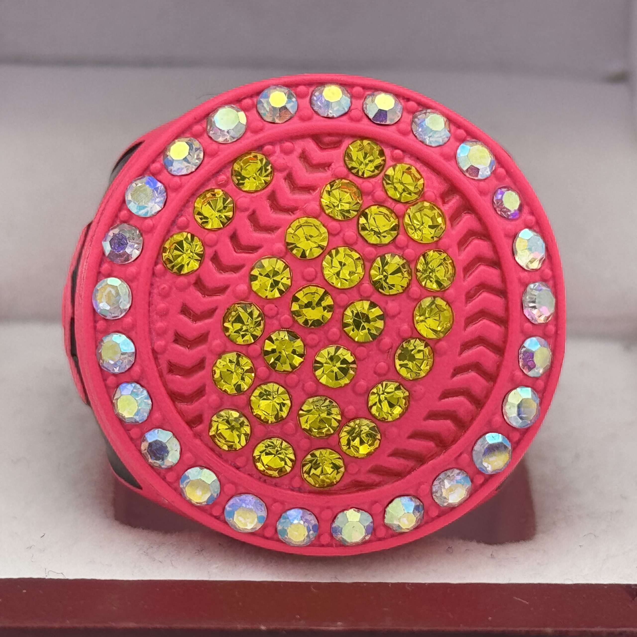 This ring is made of a zinc alloy. The ring body is noen pink in color. The stones on the side bezel are prismatic in color the stones in the top bezel are prismatic in color. There is black color paint on the sides of the rings. The left side of the ring shows an American Flag and the right side shows a ball on top of a base with crossed bats in the background. The top of the ring is a ball with red laces with yellow stones.