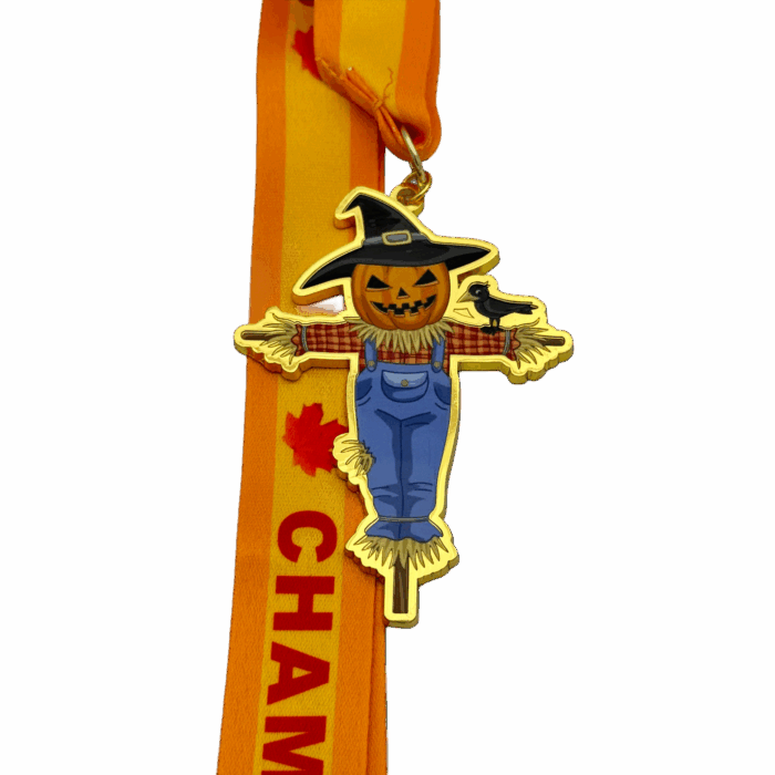 All of our medals are made of a zinc alloy. These medals are gold in color with a scarecrow. The ribbon is orange and yellow with a maple leaf and champions.