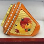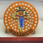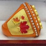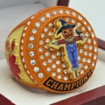 This ring is made of a zinc alloy. The ring body is orange in color. The stones on the side bezel are clear in color. The stones in the top bezels are clear in color. There are gold inserts on the sides of the rings. The left side of the ring shows fall leaves and the right side shows an assortment of pumpkins and gourds. The top of the ring shows a scarecrow and champions.Â