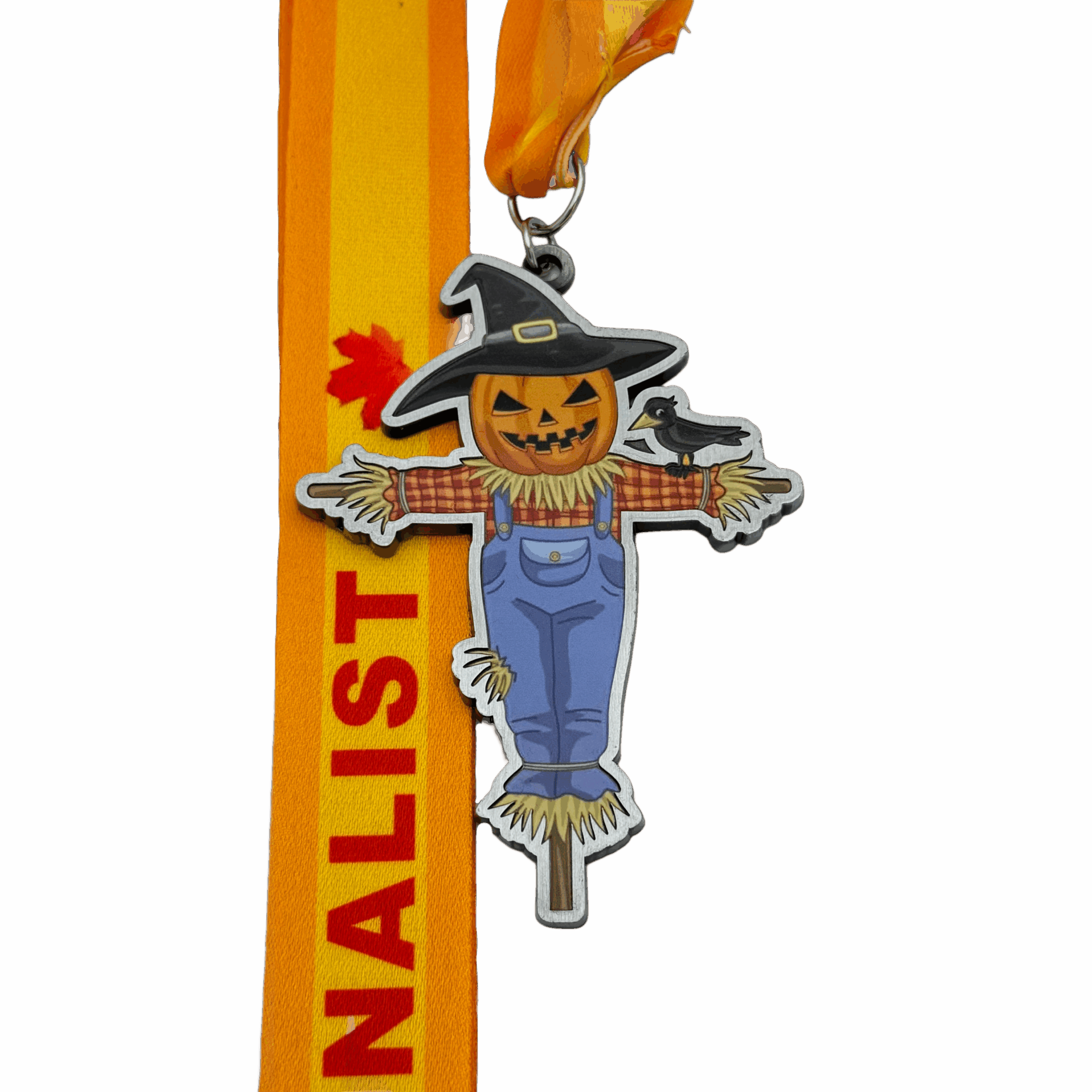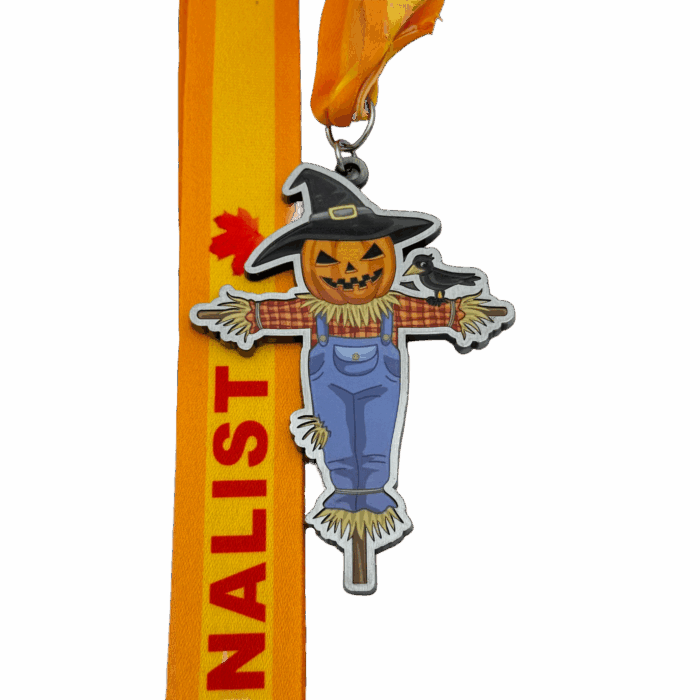 All of our medals are made of a zinc alloy. These medals are silver in color with a scarecrow. The ribbon is orange and yellow with a maple leaf and finalist.