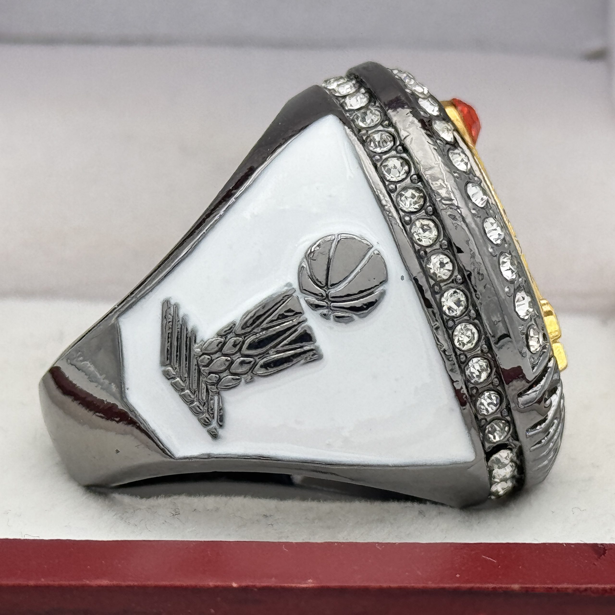 SLAM DUNK BASKETBALL CHAMPION RING — GUN METAL BODY, CLEAR STONES (Item #52-92)