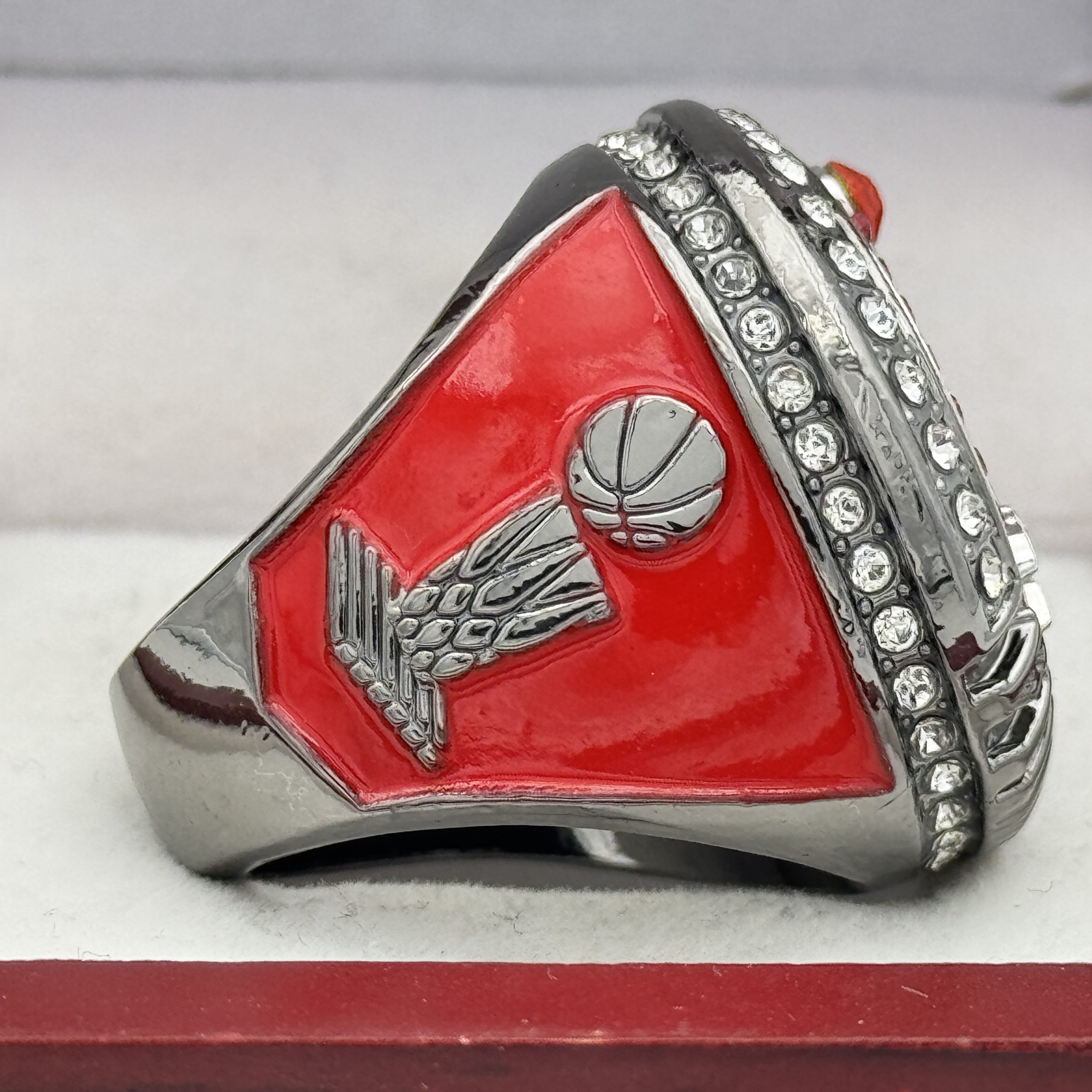 This ring is made of a zinc alloy. The ring body is gun metal in color. The stones on the side bezel are clear in color and the stones in the top bezels are clear in color. The sides have red paint. The left side shows a basketball on a trophy and the right side shows a basketball going through a net. The top of the ring shows a player doing a slam dunk surrounded with red stones and with a basketball in the background. The top of the ring says finalist.