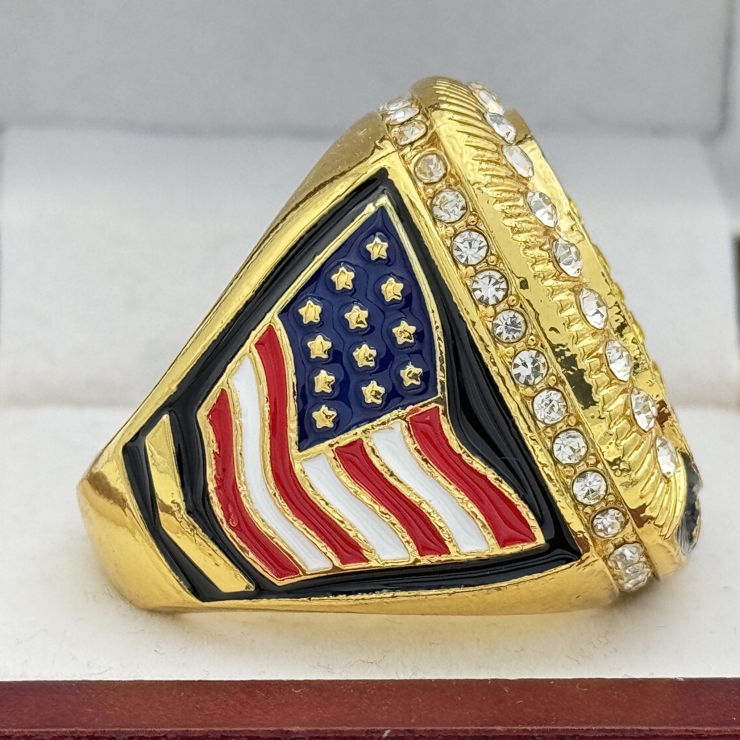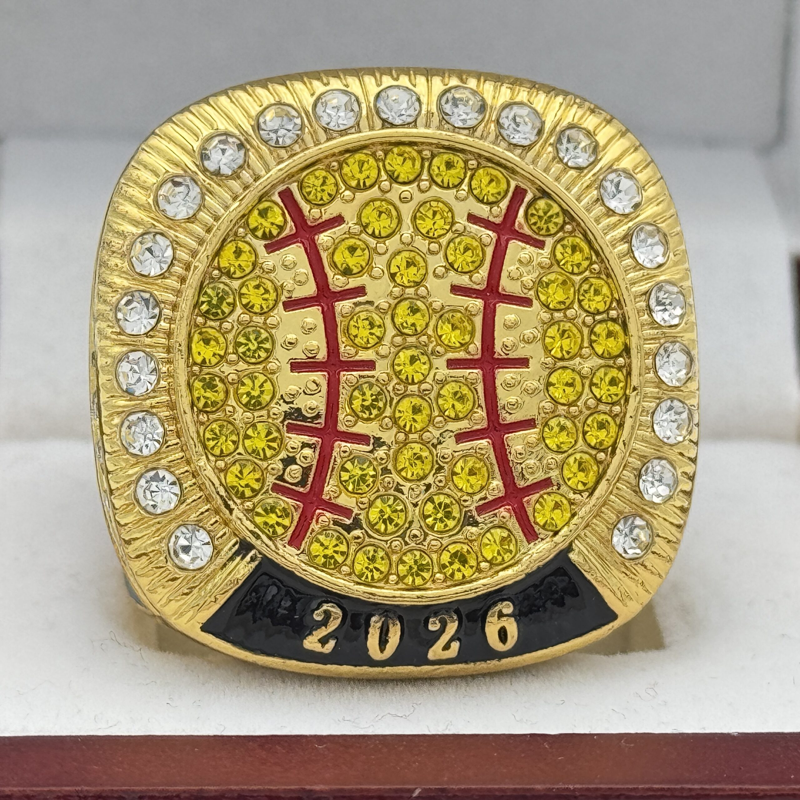 This ring is made of a zinc alloy. The ring body is gold in color. The stones on the side bezel are clear in color the stones in the top bezel are red in color. There is black color paint on the sides of the rings. The left side of the ring shows an American Flag and the right side shows a ball on top of a base with crossed bats in the background. The top of the ring is a ball with red laces with yellow stones and 2026.