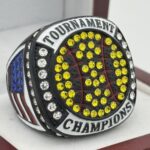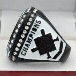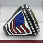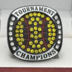 This ring is made of a zinc alloy. The ring body is black in color. The stones on the side bezel are clear in color the stones in the top bezel are clear in color. There is white color paint on the sides of the rings. The left side of the ring shows an American Flag and the right side shows a ball on top of a base with crossed bats in the background and the word champions. The top of the ring is a ball with red laces with yellow stones and tournament champions.