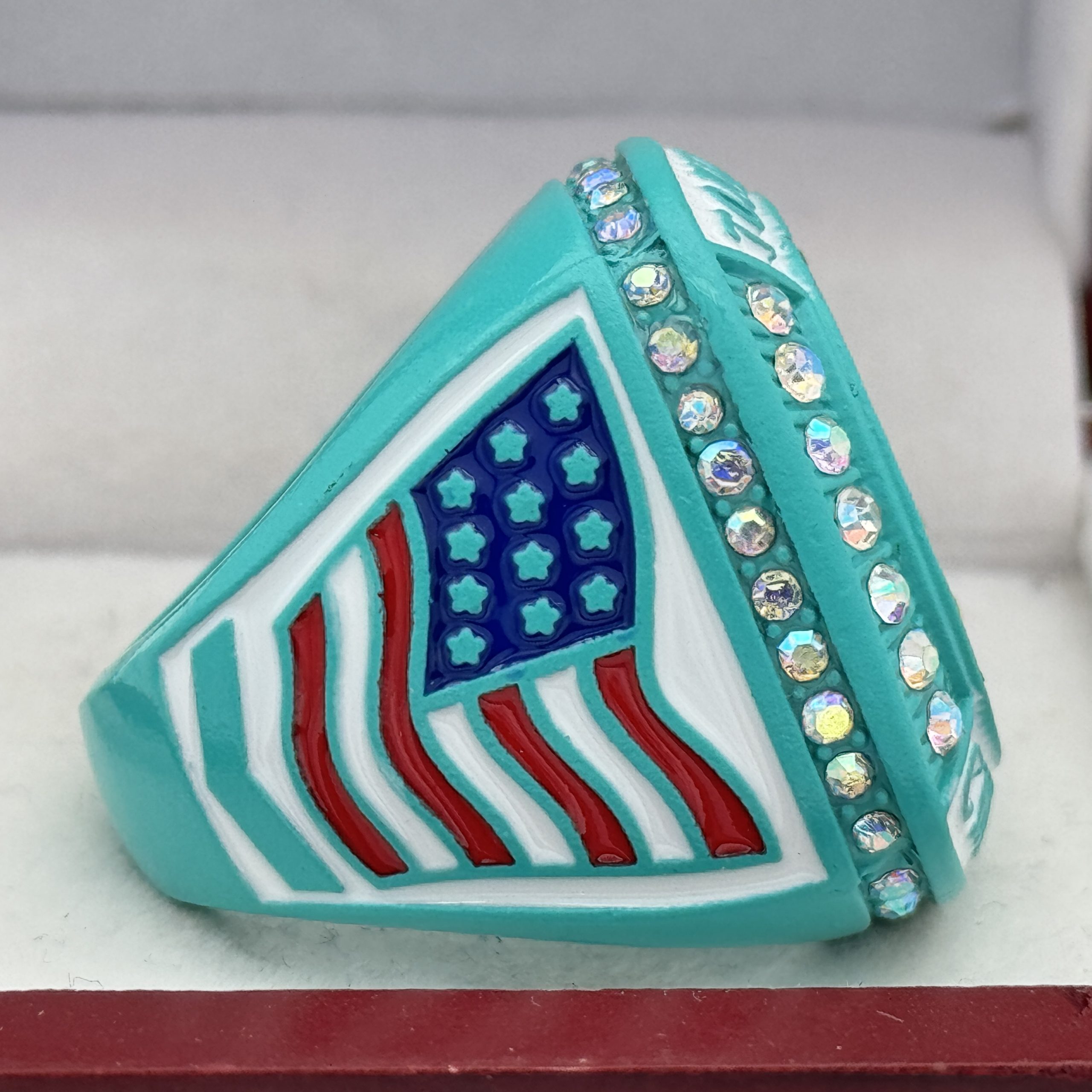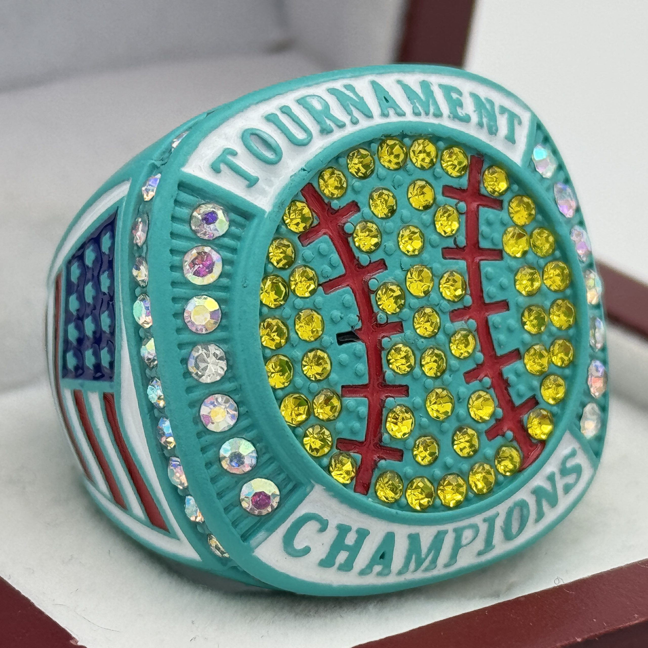 This ring is made of a zinc alloy. The ring body is teal in color. The stones on the side bezel are prismatic in color the stones in the top bezel are prismatic in color. There is white color paint on the sides of the rings. The left side of the ring shows an American Flag and the right side shows a ball on top of a base with crossed bats in the background and the word champions. The top of the ring is a ball with red laces with yellow stones and tournament champions.