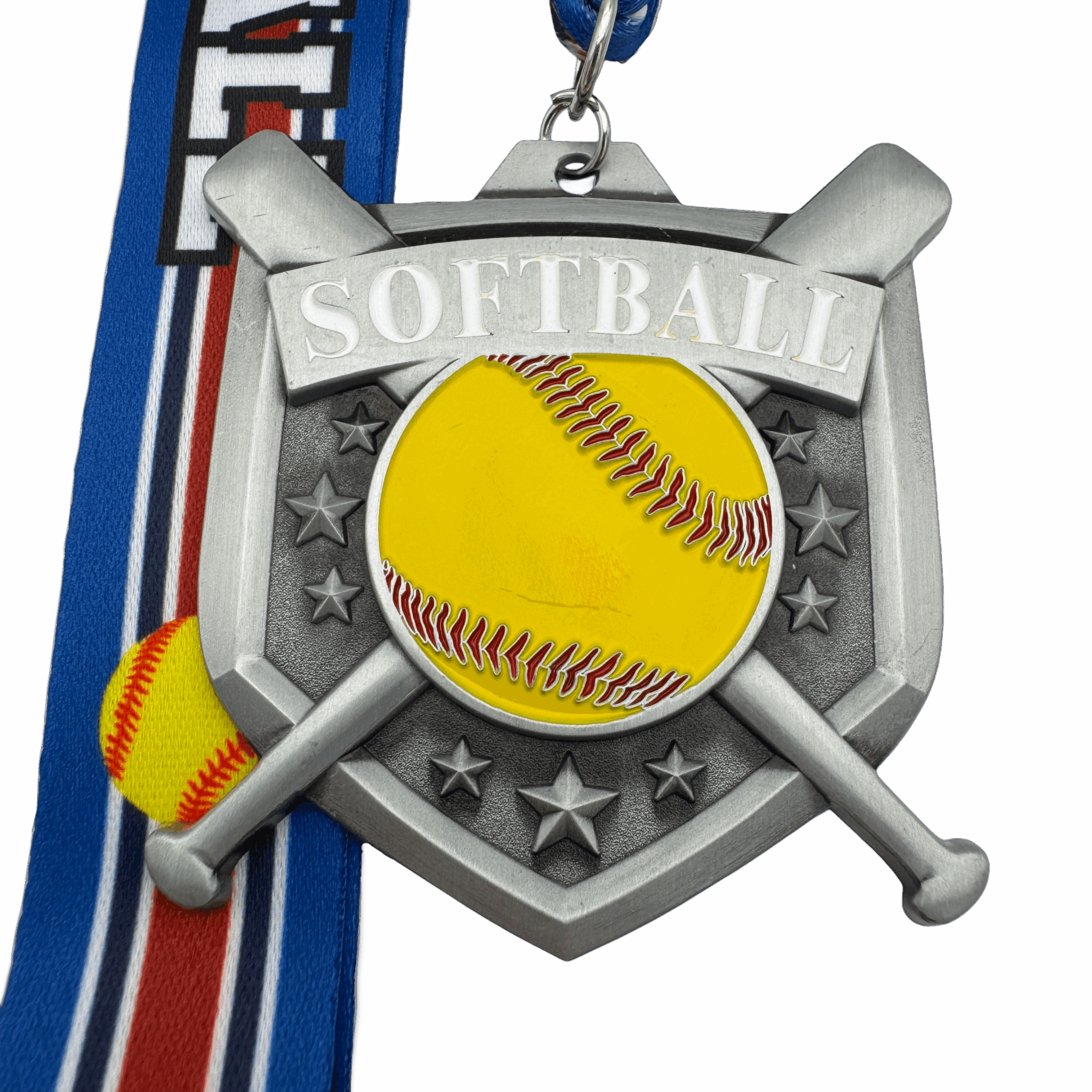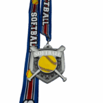 All of our medals are made of a zinc alloy. This medal is 2.75″ by 2.75″ with an 18″ ribbon. These medals are silver in color and say softball with a painted ball and background. The ribbon is blue with red and white stripes with the word softball and an image of a softball.