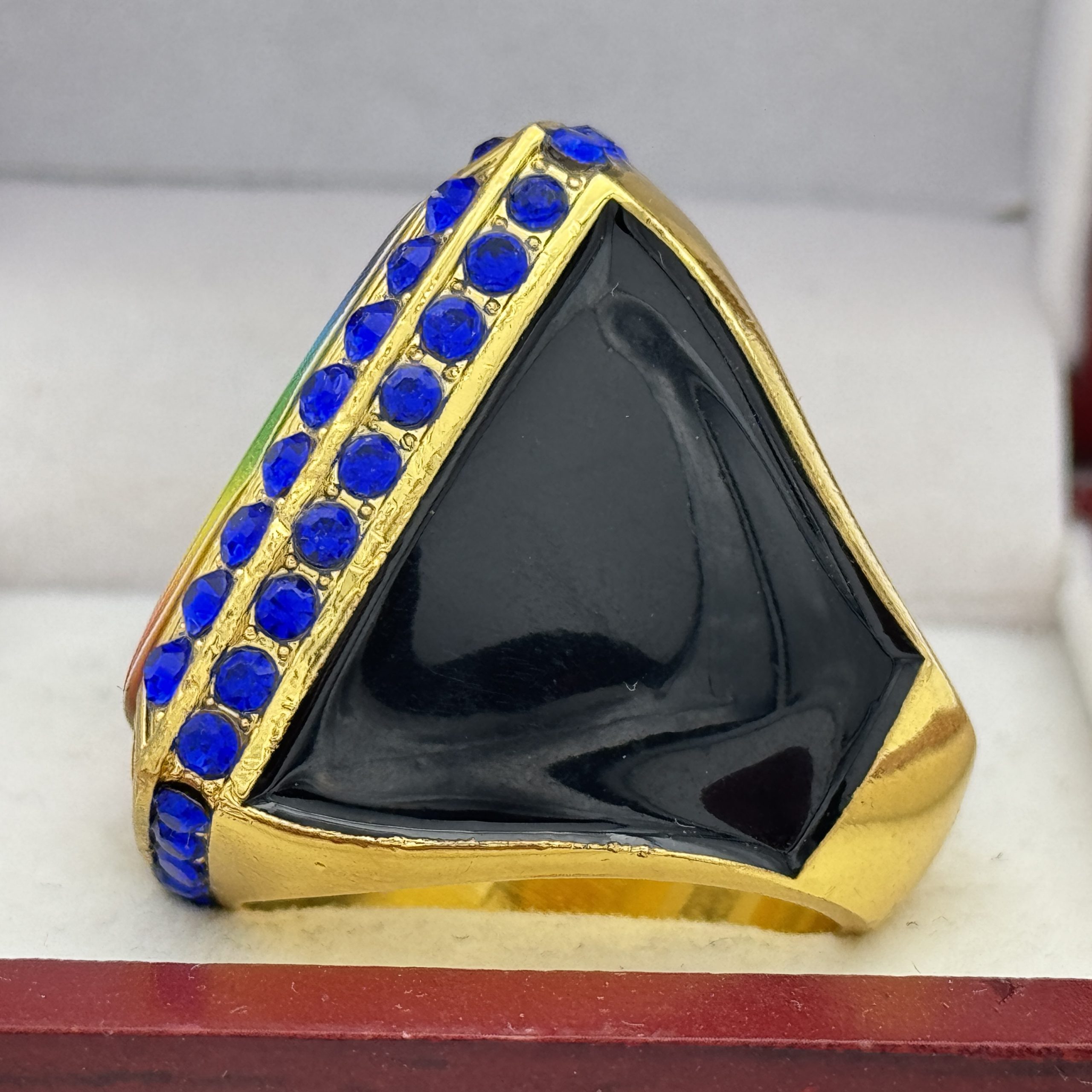 This ring is made of a zinc alloy. The ring body is gold in color. The stones on the side bezel are blue in color and the stones in the top bezels are blue in color. The sides of the ring are black for customization. The top of the ring is blank for adding your logo with champions.Â