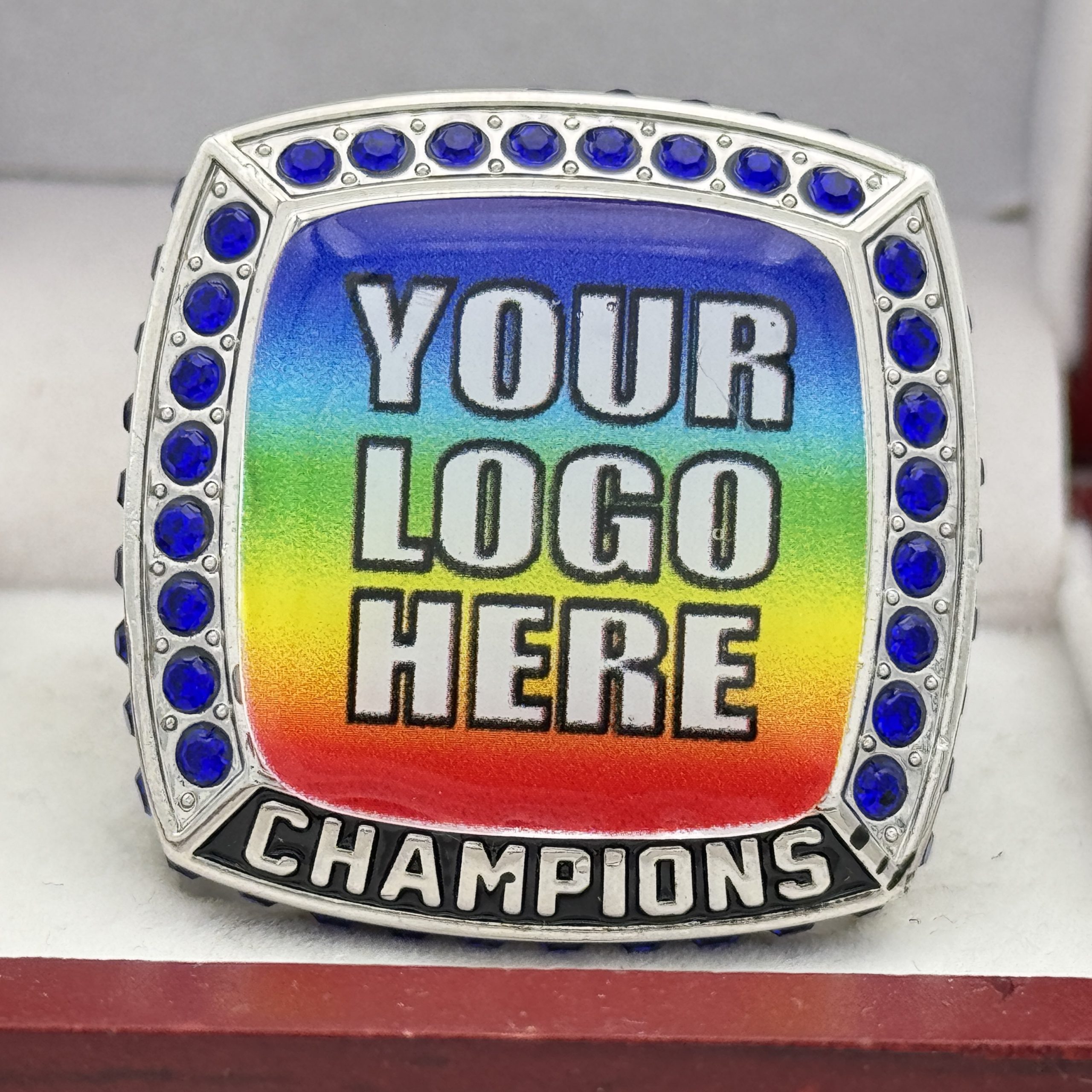SQUARE ADD YOUR LOGO CHAMPION RING — SILVER BODY, BLUE STONES, 2 ENGRAVABLE SIDES (Item #59-184)