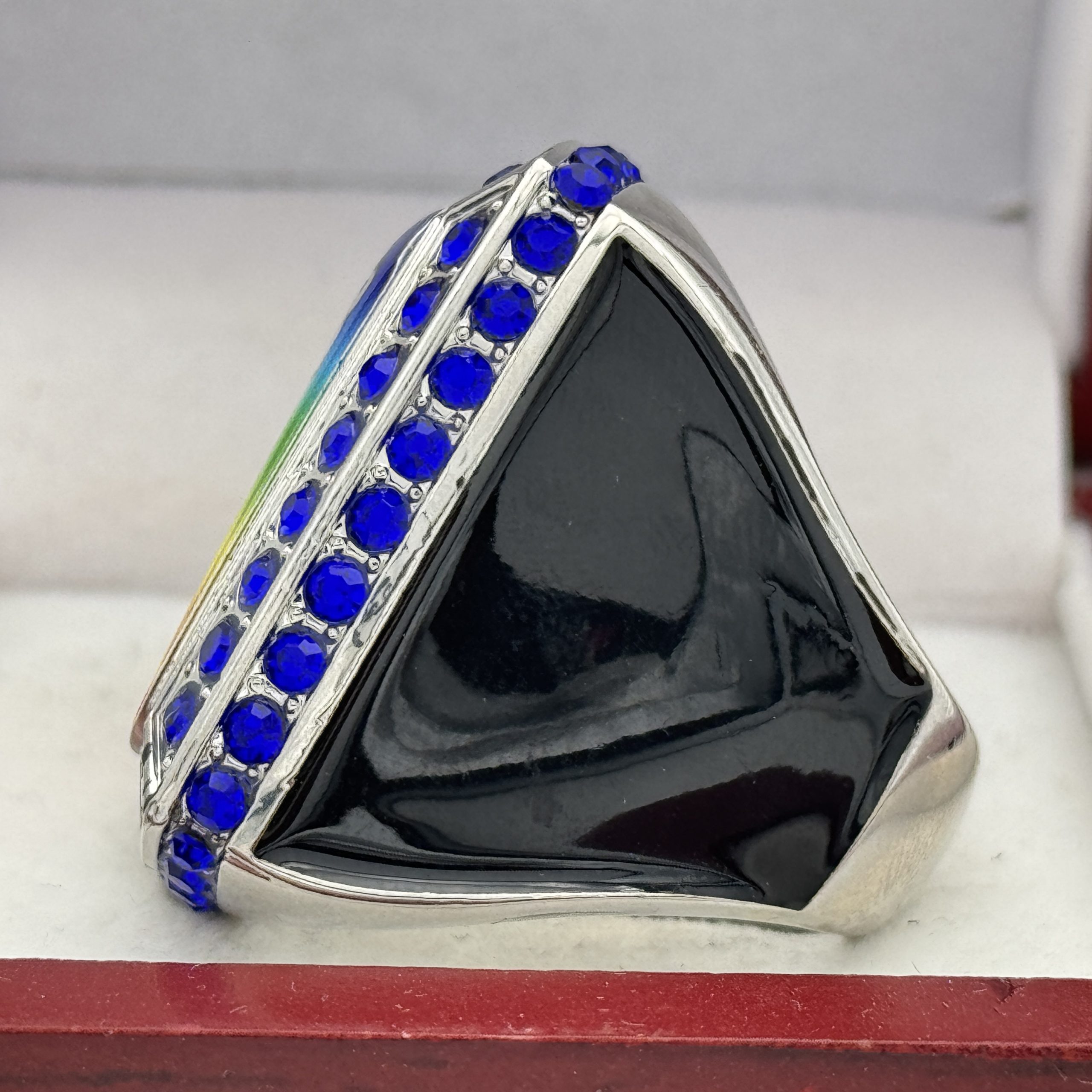 This ring is made of a zinc alloy. The ring body is silver in color. The stones on the side bezel are blue in color and the stones in the top bezels are blue in color. The sides of the ring are black for customization. The top of the ring is blank for adding your logo with champions.Â
