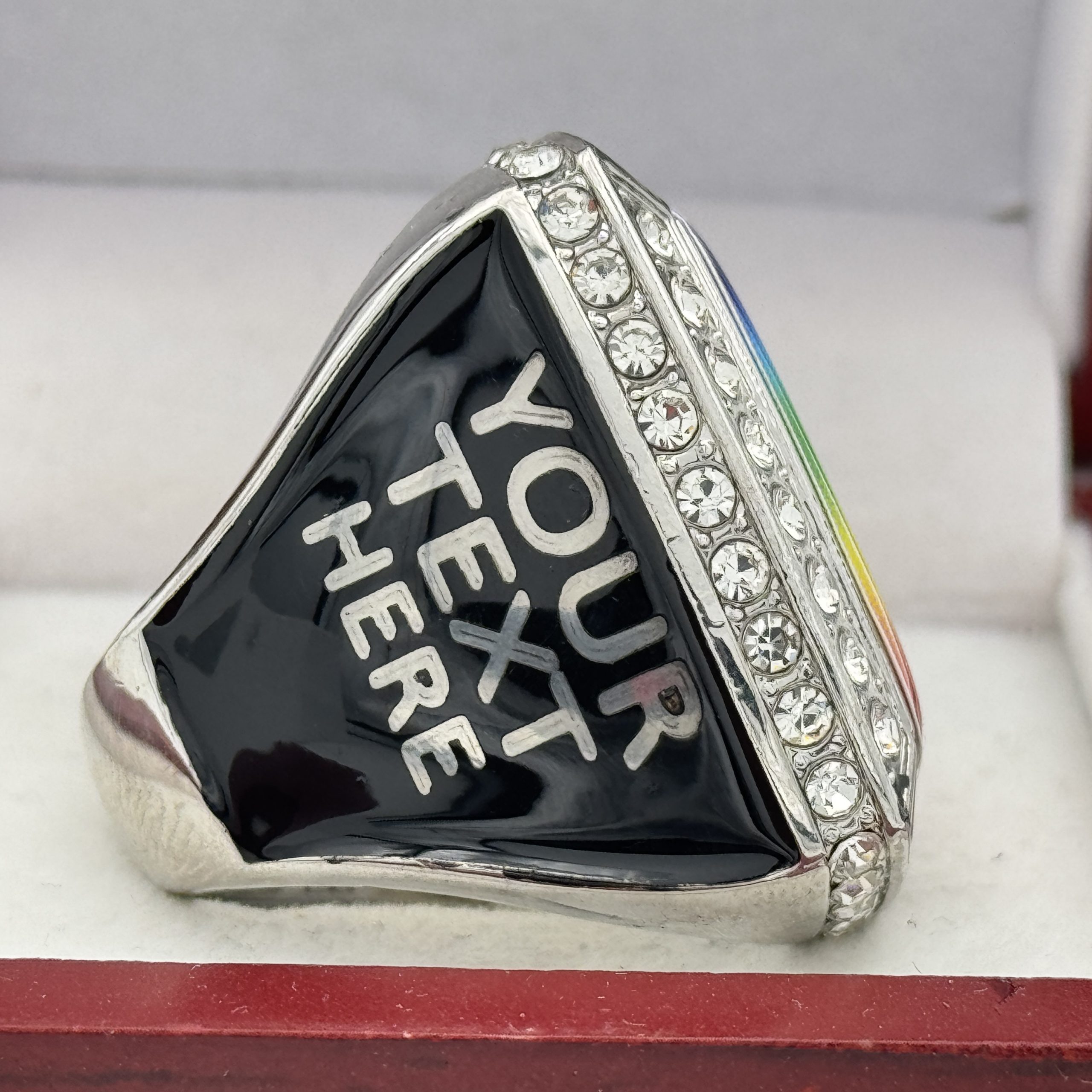 SQUARE ADD YOUR LOGO CHAMPION RING — SILVER BODY, CLEAR STONES, 2 ENGRAVABLE SIDES (Item #59-180)