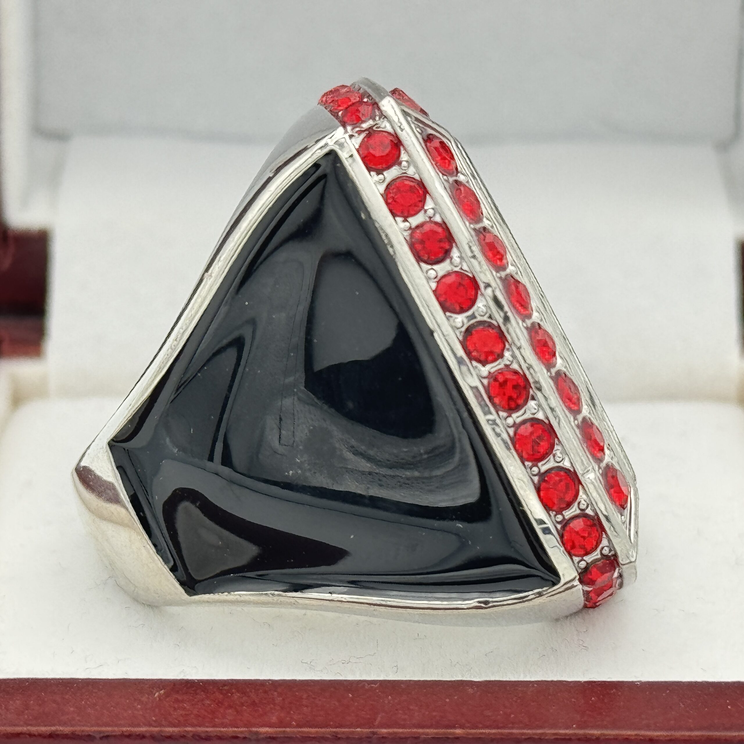 This ring is made of a zinc alloy. The ring body is silver in color. The stones on the side bezel are red in color and the stones in the top bezels are red in color. The sides of the ring are black for customization. The top of the ring is blank for adding your logo with finalist.Â