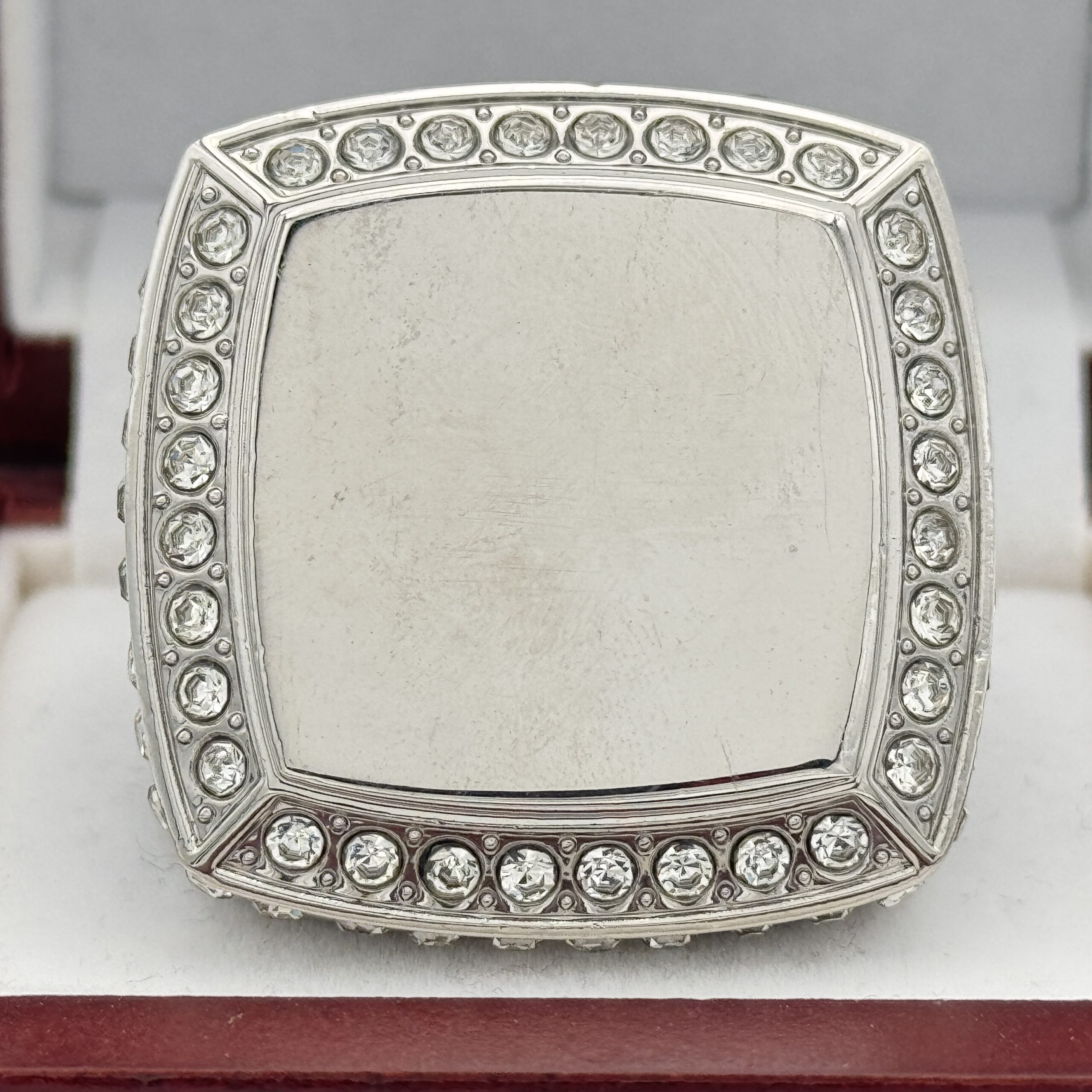 SQUARE ADD YOUR LOGO RING — SILVER BODY, CLEAR STONES, 2 ENGRAVABLE SIDES (Item #58-201)