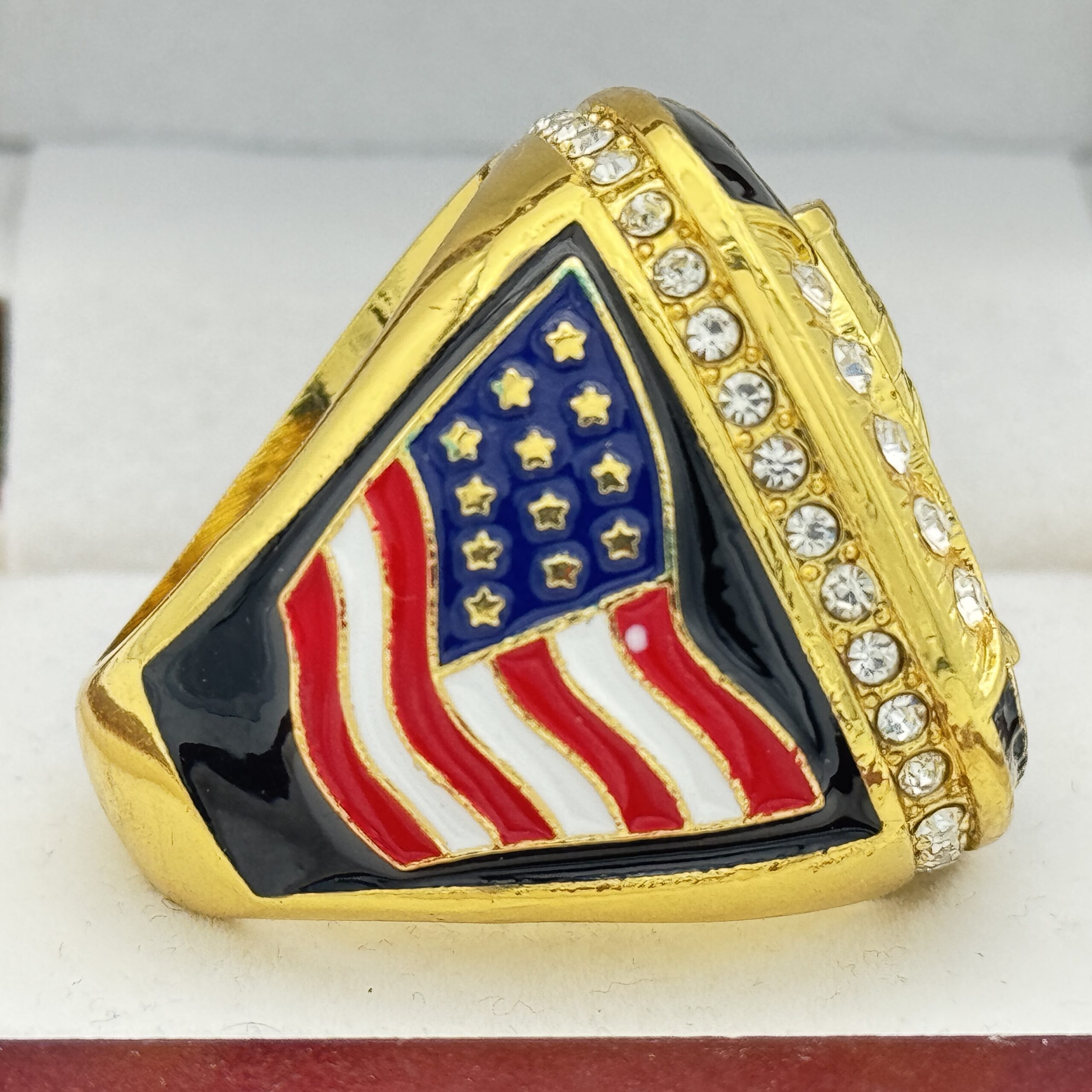 This ring is made of a zinc alloy. The ring body is gold in color. The stones on the side bezel are clear in color the stones in the top bezel are clear in color. There is black color paint on the sides of the rings. The left side of the ring shows an American Flag and the right side shows a star. The top of the ring shows a trophy cup with clear stones and 2026 champions.Â