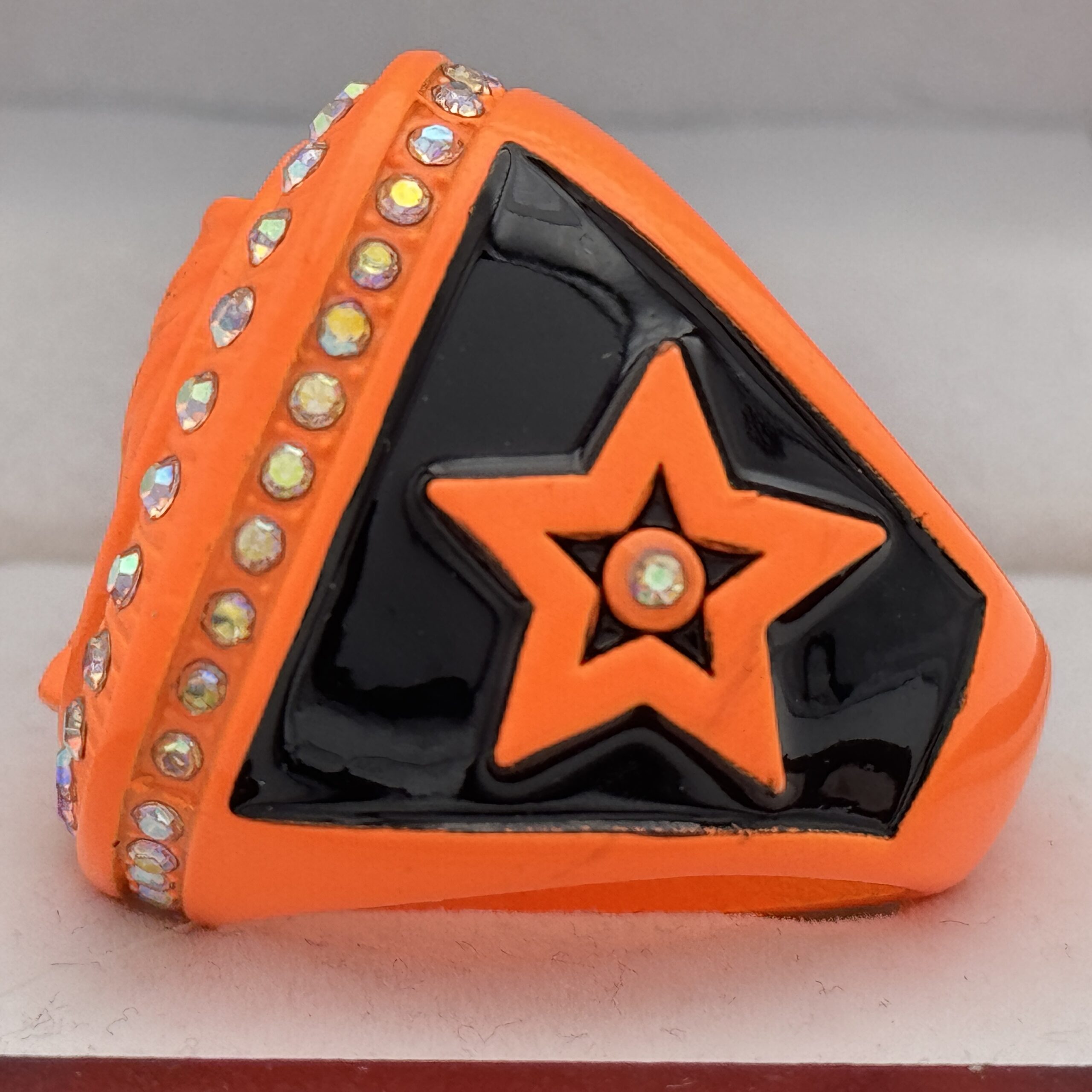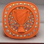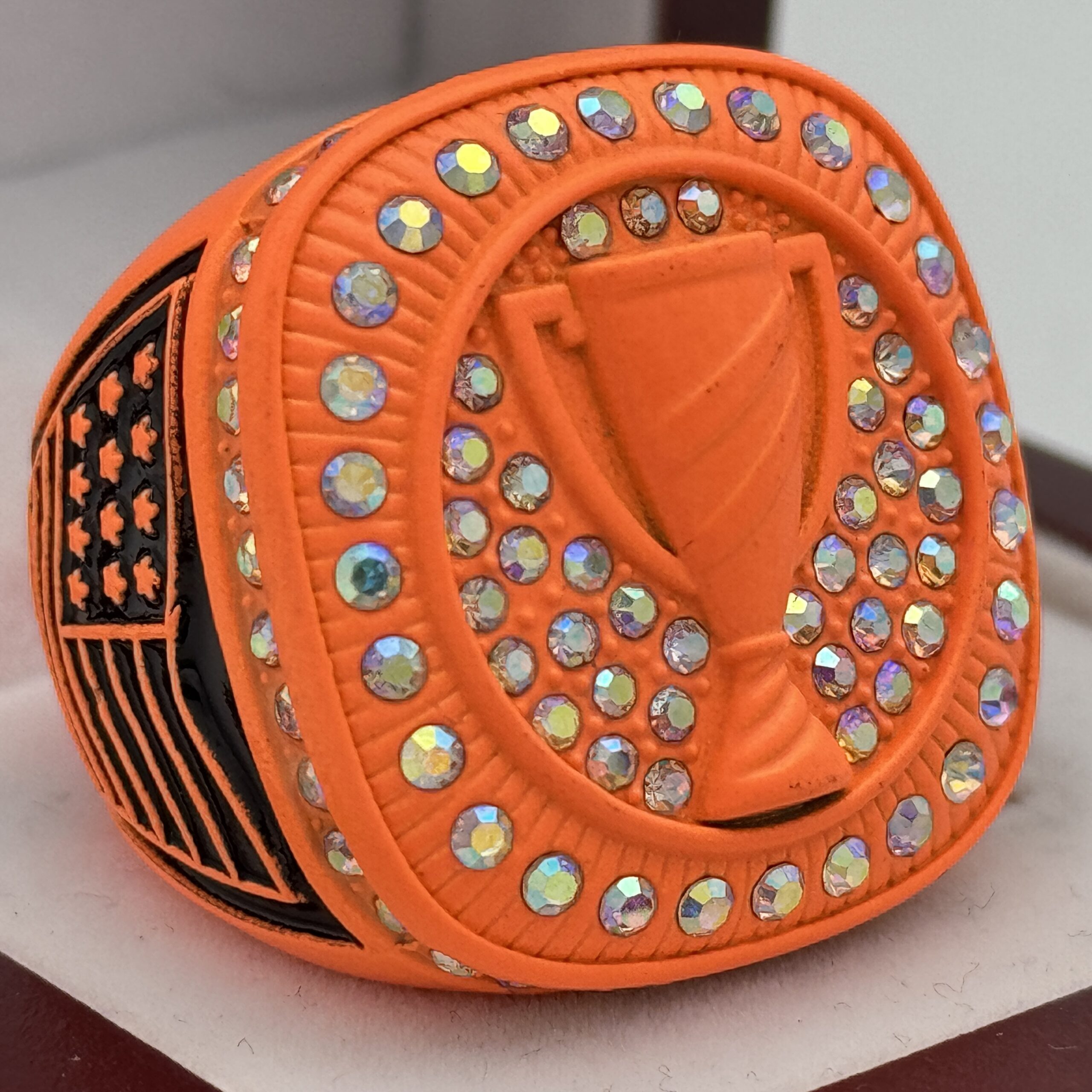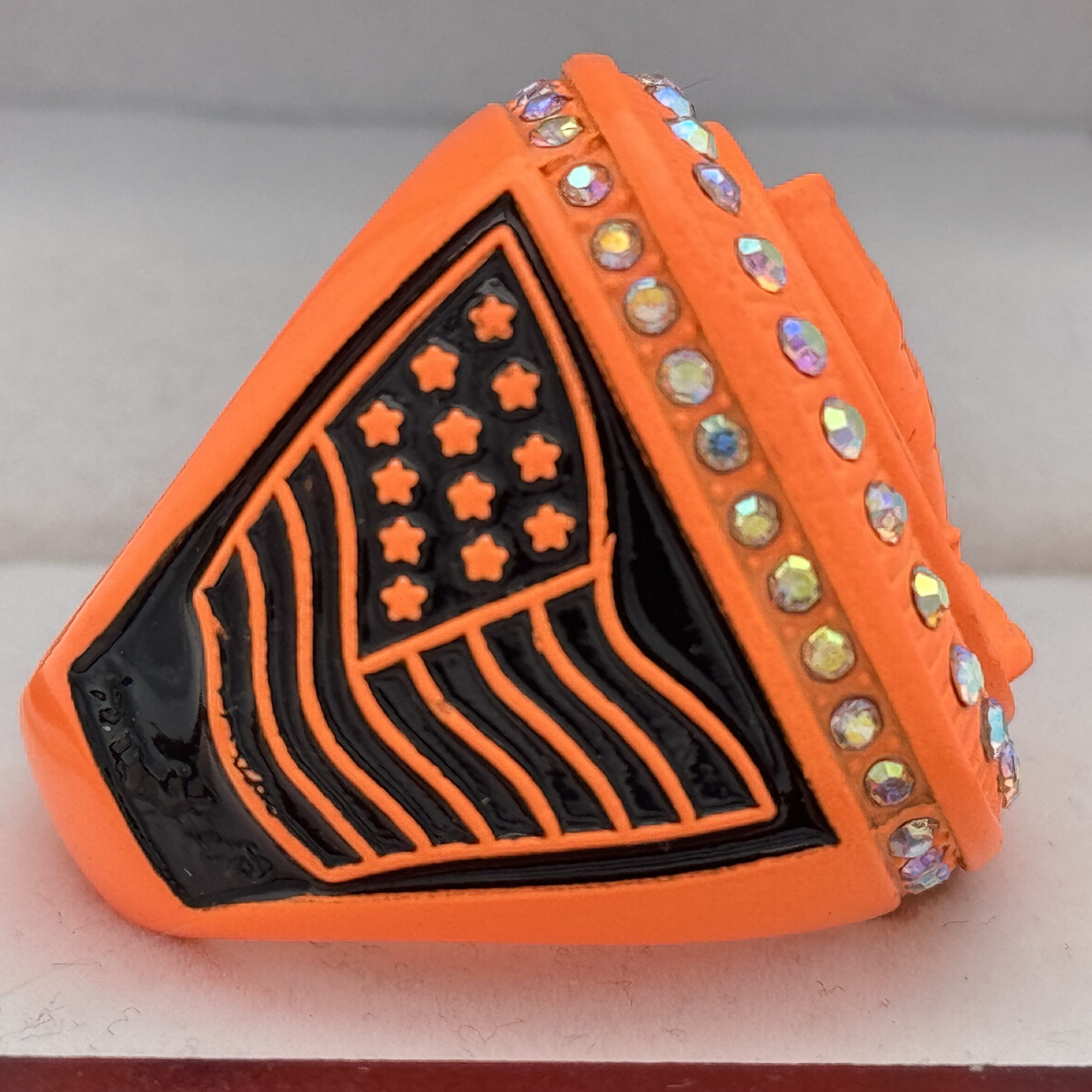 This ring is made of a zinc alloy. The ring body is neon orange in color. The stones on the side bezel are prismatic in color the stones in the top bezel are prismatic in color. There is black color paint on the sides of the rings. The left side of the ring shows an American Flag and the right side shows a star. The top of the ring shows a trophy cup with prismatic stones.Â