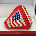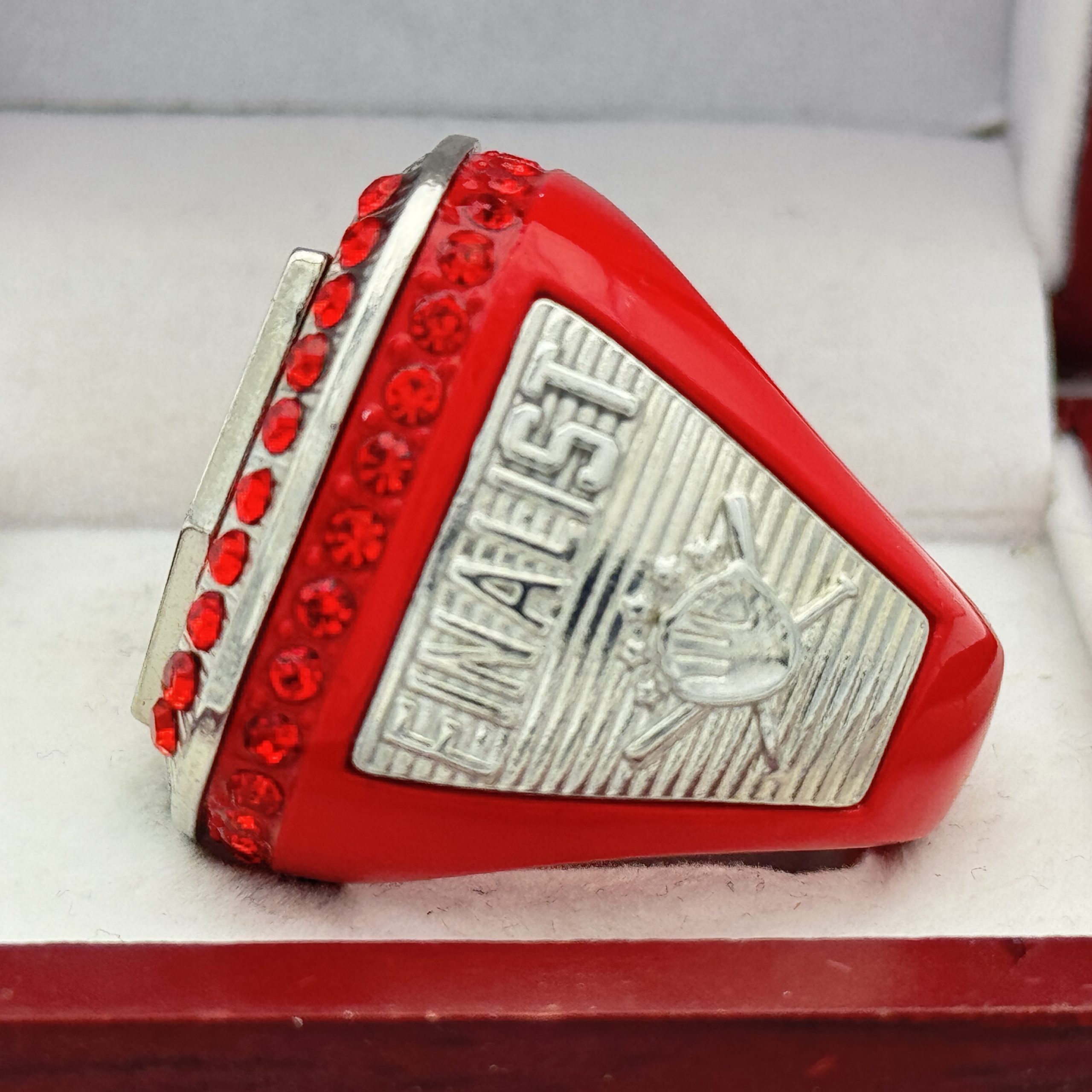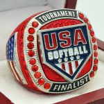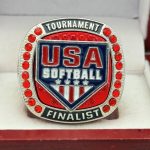 This ring is made of a zinc alloy. The ring body is red in color. The stones on the side bezel are red in color the stones in the top bezel are red in color. There are silver inserts on the sides of the rings. The left side of the ring shows a batter swinging and the right side shows a glove with crossed bats in the background and finalist. The top of the ring shows the USA softball shield and TOURNAMENT finalist on the top.