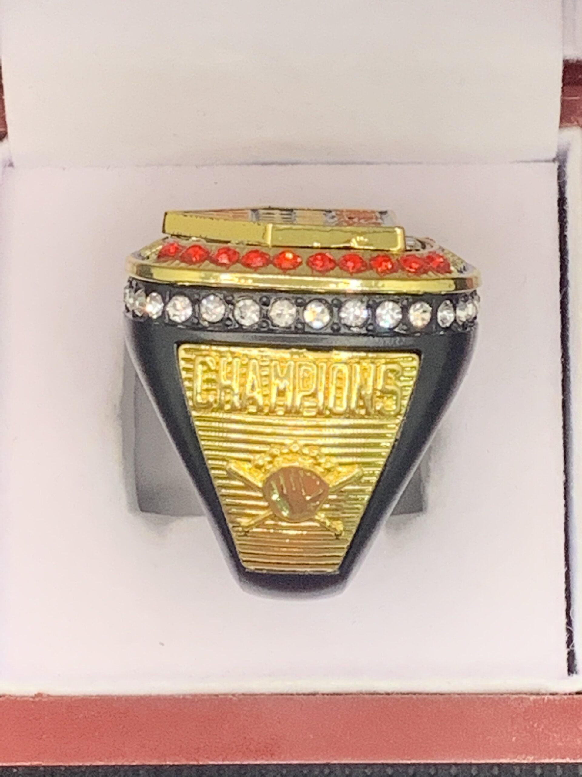 USA 5 STAR WORLD SERIES CHAMPION RING — BLACK BODY, RED STONES, OFFICIAL LOGO (Item #39-84)
