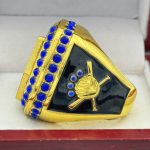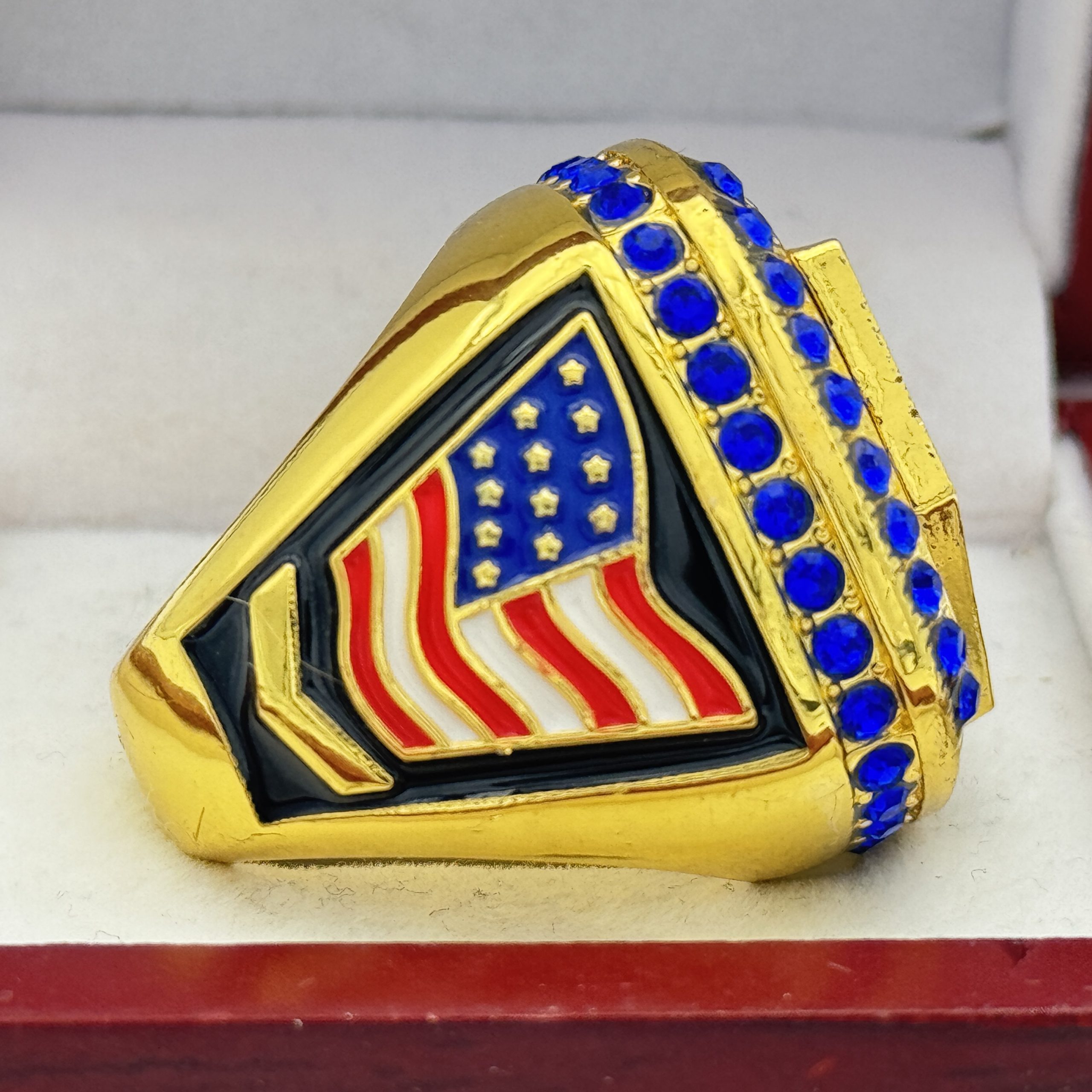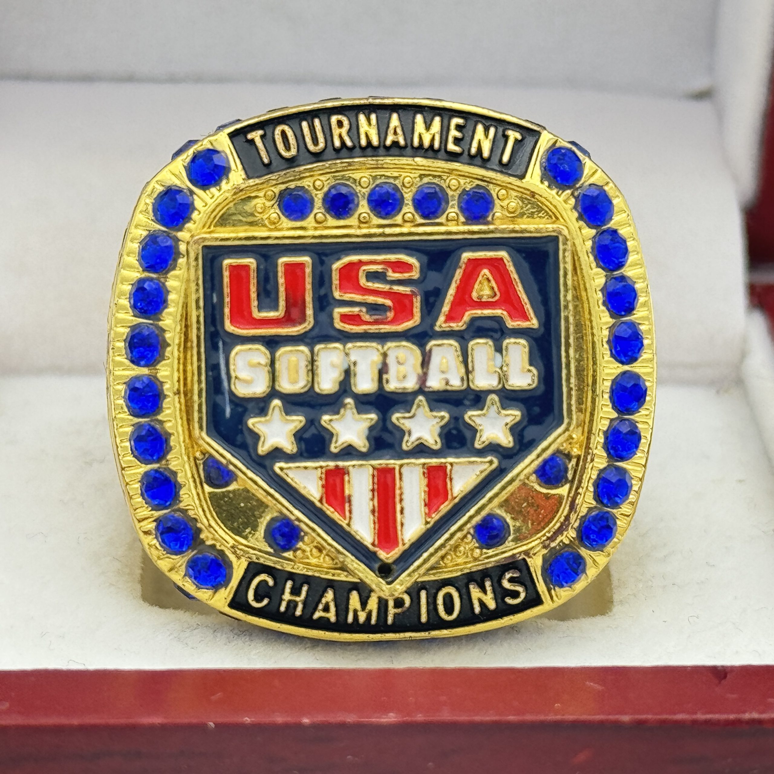 This ring is made of a zinc alloy. The ring body is gold in color. The stones on the side bezel are blue in color the stones in the top bezel are blue in color. There is BLACK color paint on the sides of the rings. The left side of the ring shows an American Flag and the right side shows a glove with crossed bats in the background. The top of the ring shows the USA Softball shield and TOURNAMENT champions on the top.