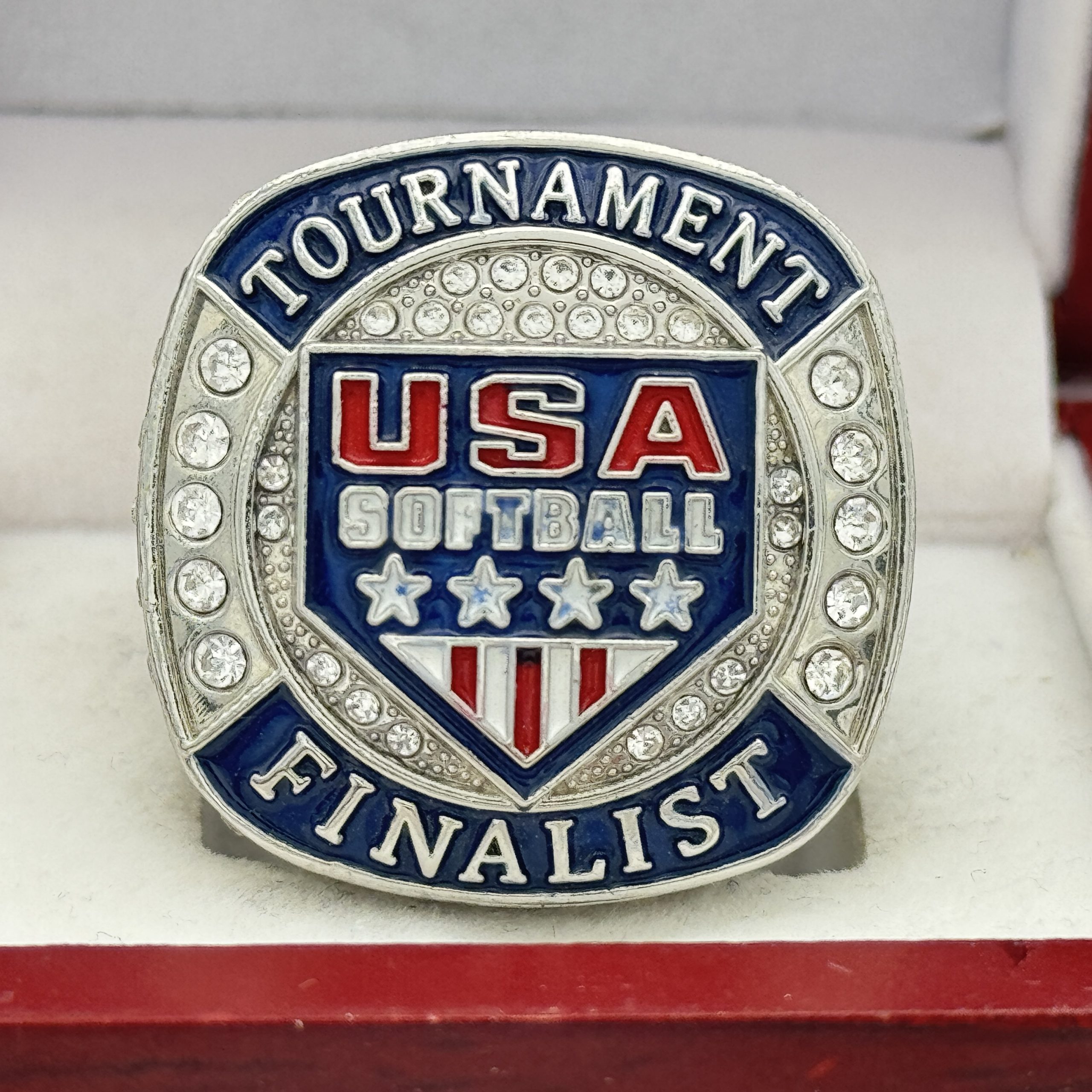 This ring is made of a zinc alloy. The ring body is silver in color. The stones on the side bezel are clear in color the stones in the top bezel are clear in color. There is BLACK color paint on the sides of the rings. The left side of the ring shows an American Flag and the right side shows a batter swinging. The top of the ring shows the USA Softball shield and TOURNAMENT finalist on the top.