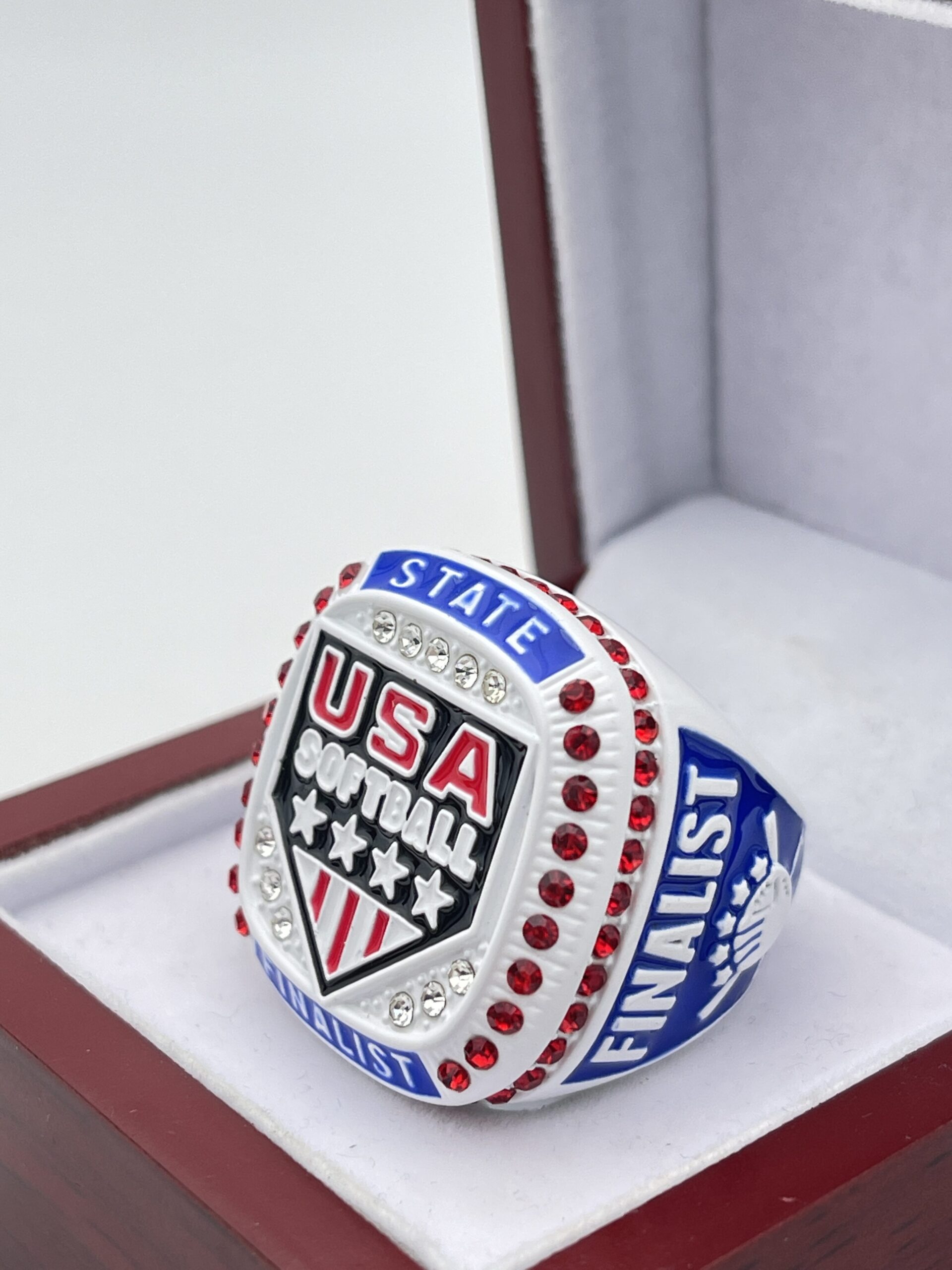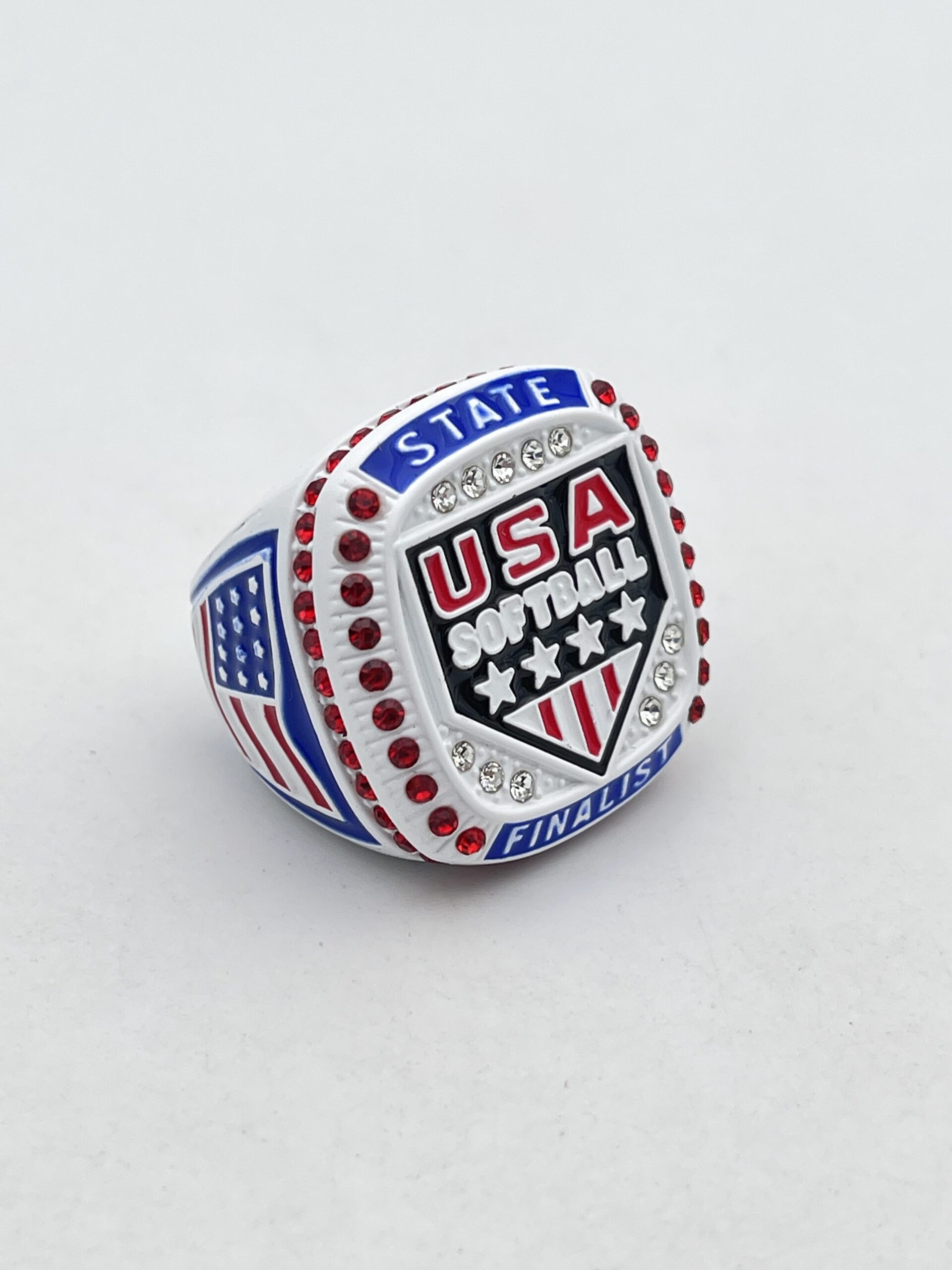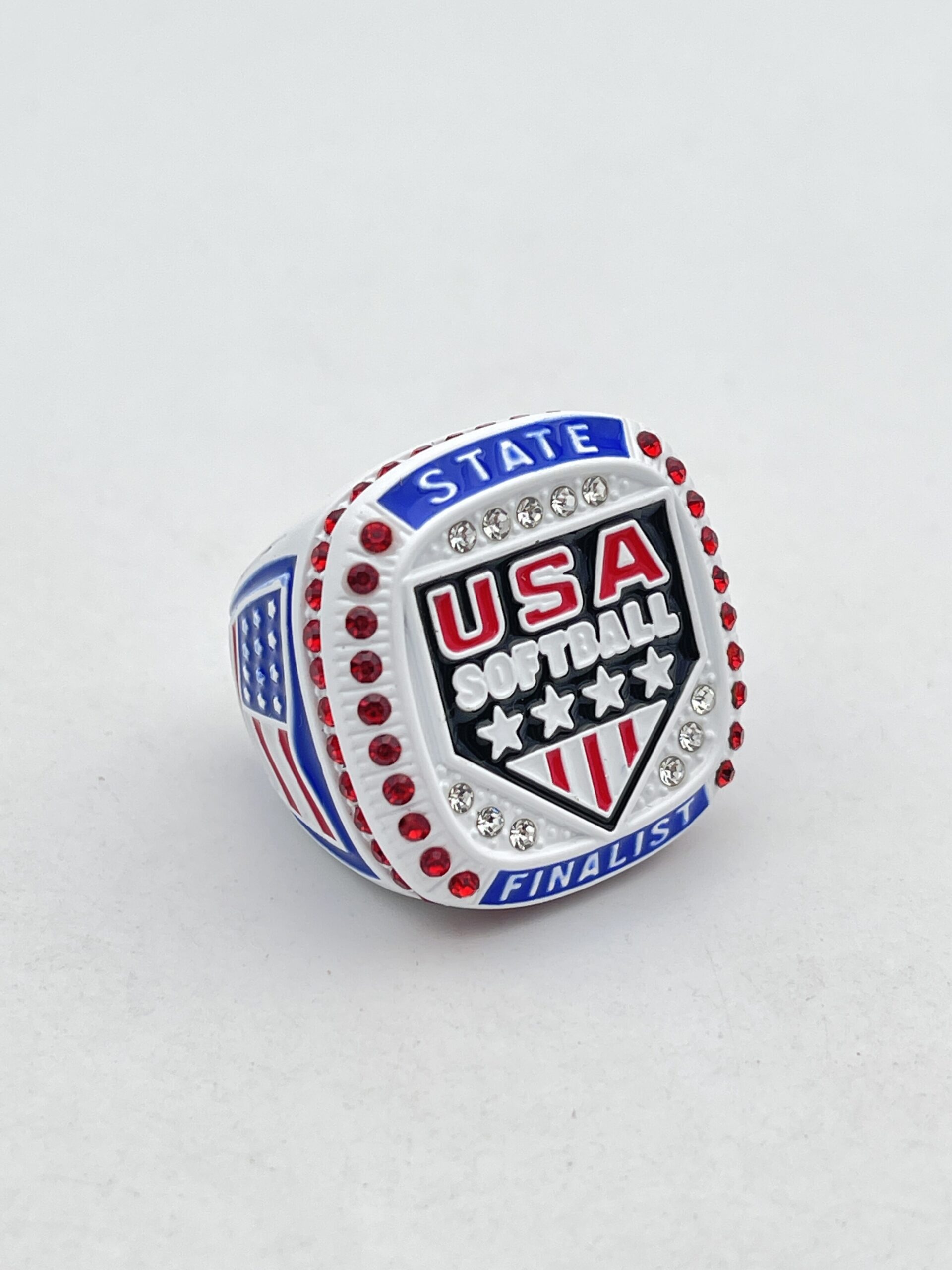 Home Shop By Sport SOFTBALL AWARDS USA HOME PLATE STATE FINALIST RING — WHITE BODY, RED STONES, OFFICIAL LOGO (Item #39-113)