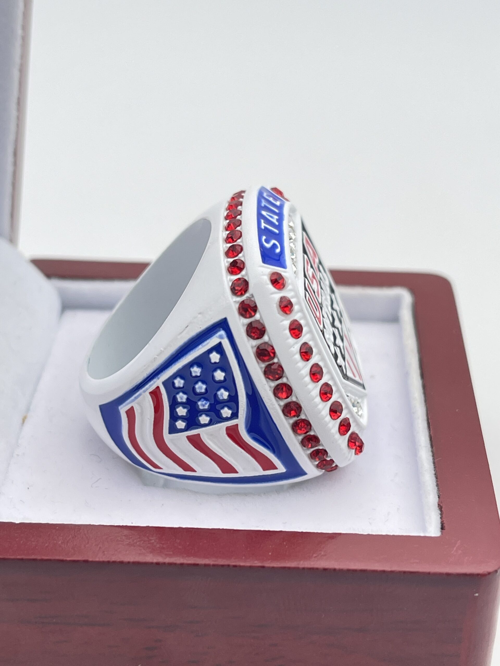 USA HOME PLATE CHAMPION RING — WHITE BODY, RED STONES, OFFICIAL LOGO (Item #39-28)