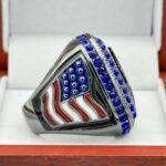 This ring is made of a zinc alloy. The ring body is gun metal in color. The stones on the side bezel are blue in color the stones in the top bezel are blue in color. There is black color paint on the sides of the rings. The left side of the ring shows an American Flag and the right side shows a glove with crossed bats in the background and champions. The top of the ring shows the USA SOFTBALL SHIELD with blue stones and STATE champions on the top.