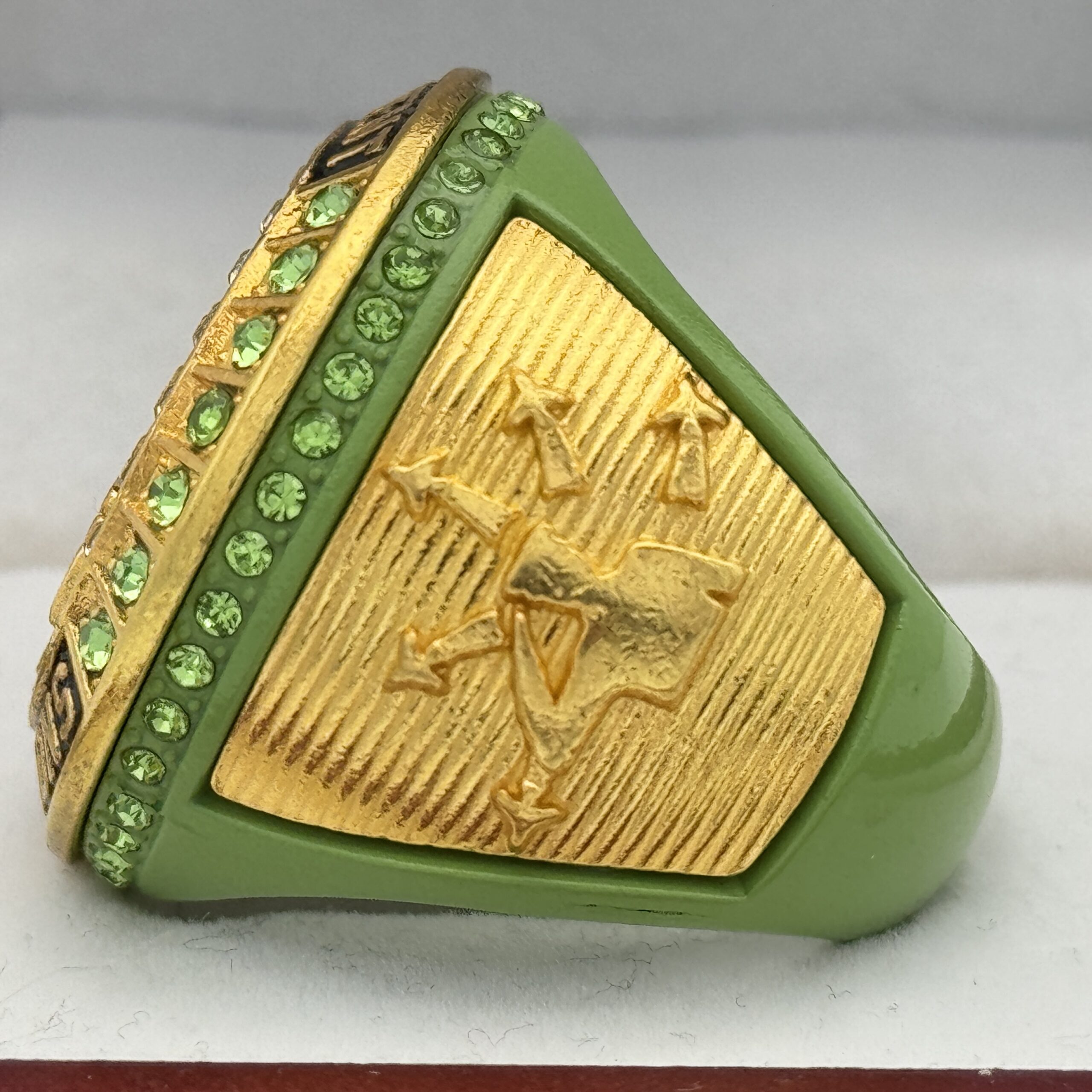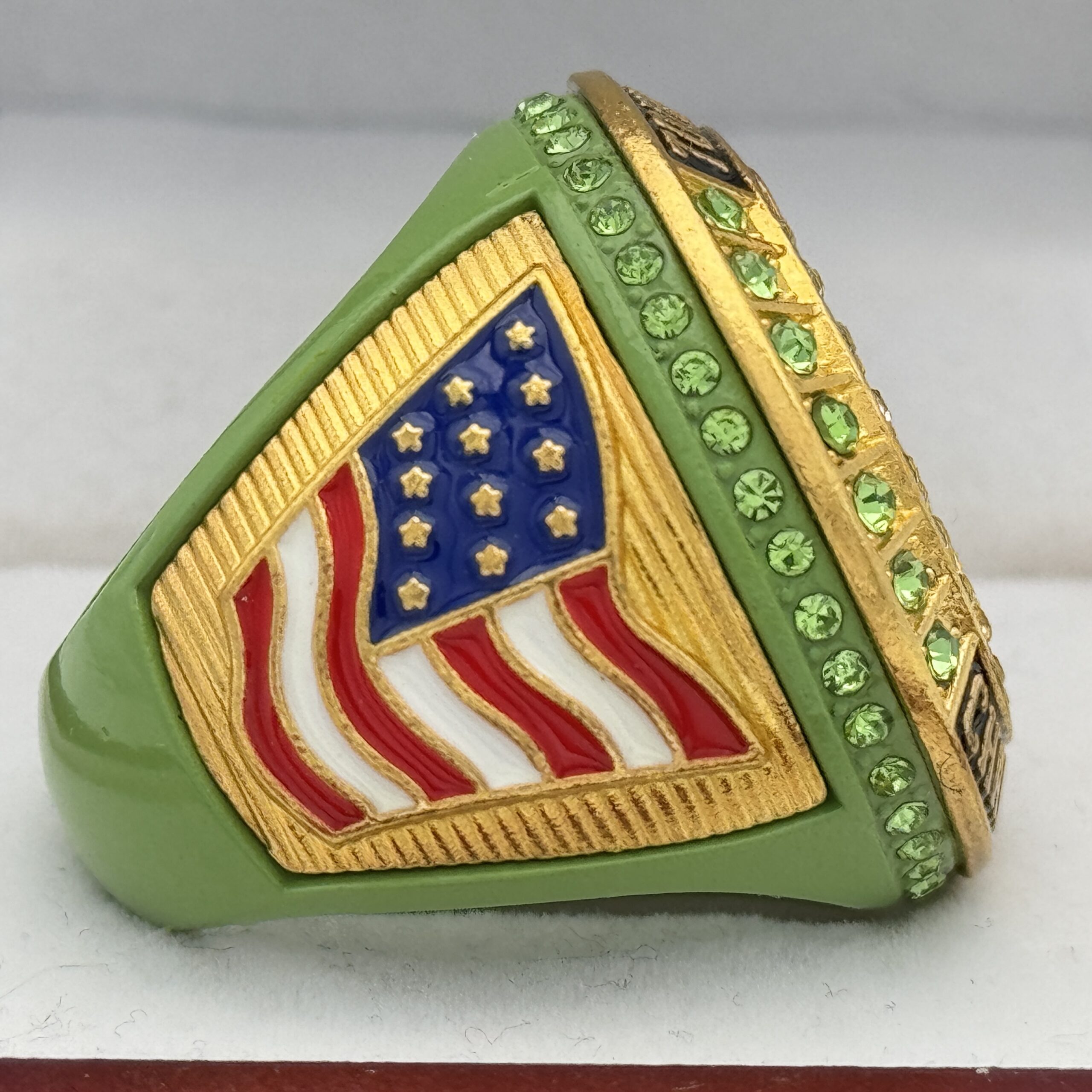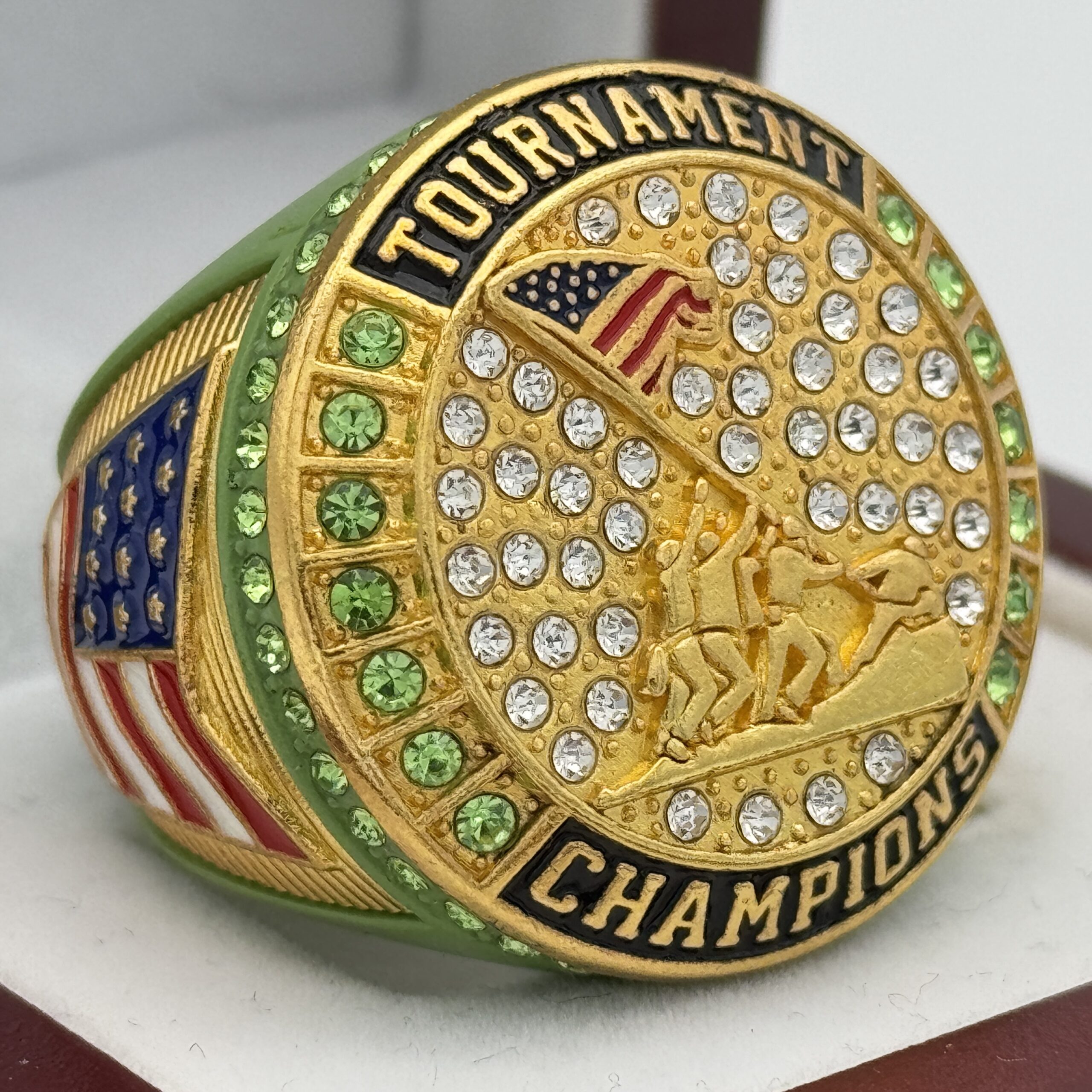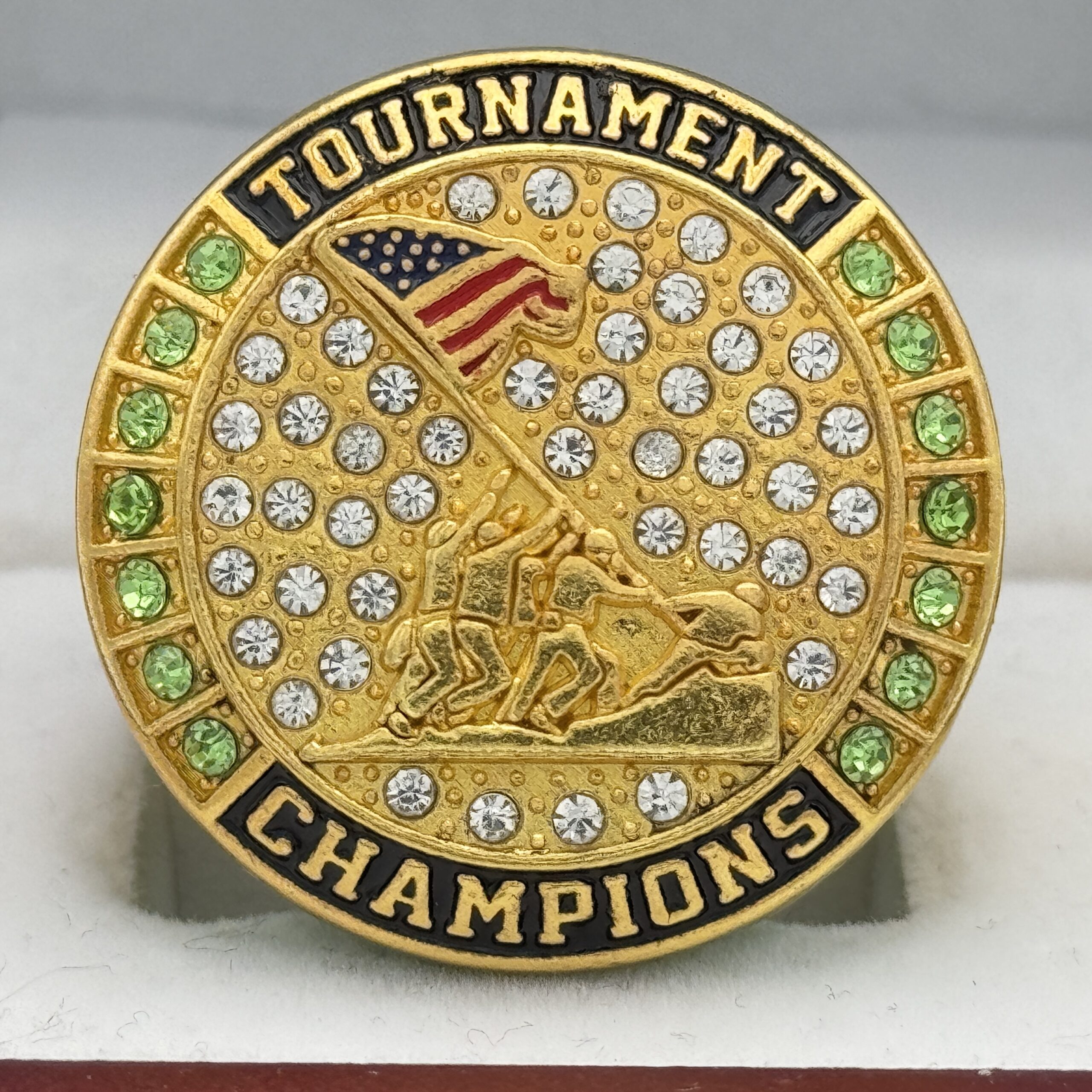 This ring is made of a zinc alloy. The ring body is green in color. The stones on the side bezel are green in color. The stones in the top bezels are green in color. There are gold inserts on the sides of the rings. The left side of the ring shows an American flag and the right side shows a soldier saluting with fireworks in the background. The top of the ring shows the flag raising at Iwo Jima and tournament champions.Â