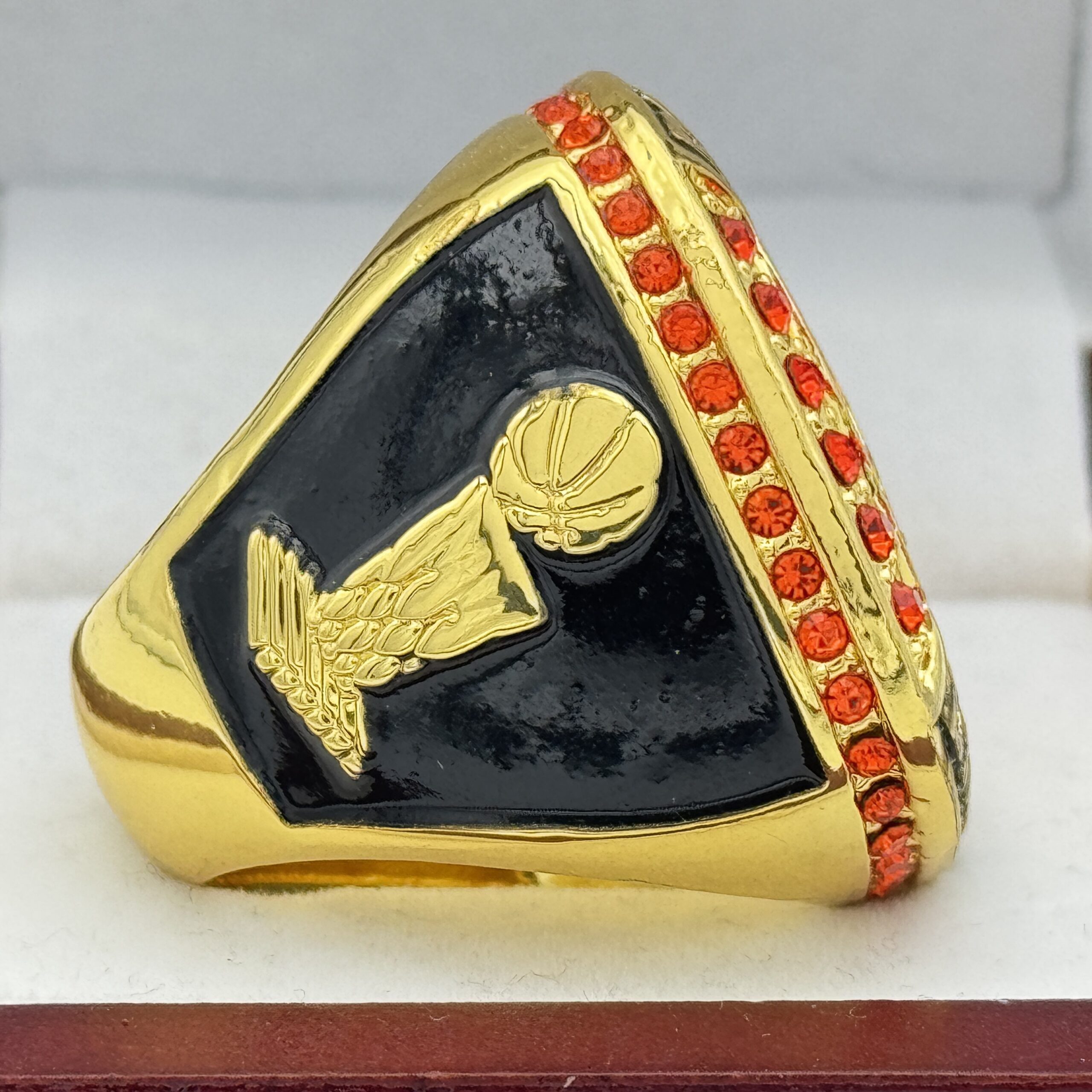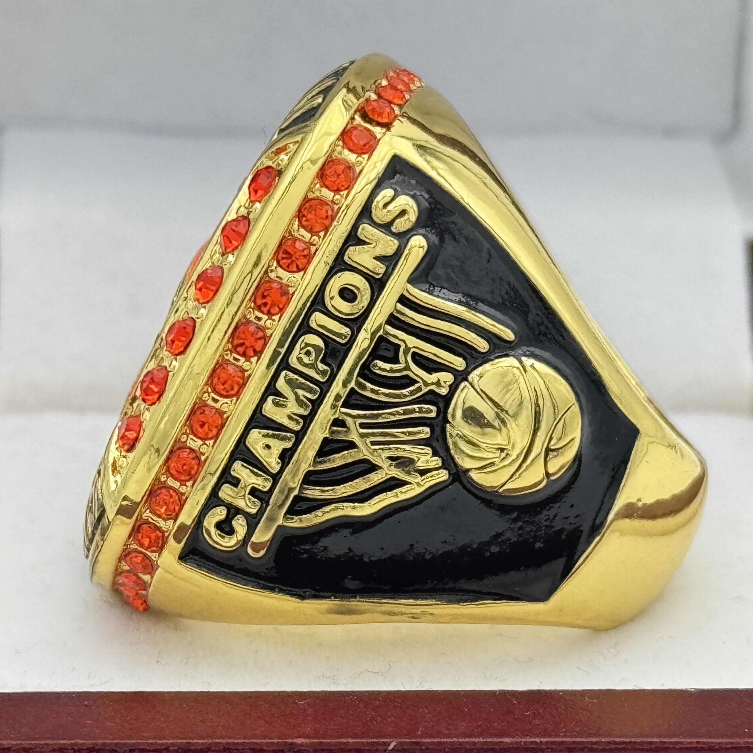 This ring is made of a zinc alloy. The ring body is gold in color and the side bezel has orange colored stones. There is black paint on the sides and top of the rings. The right side of the ring shows a basketball going through a net and Champions the left side shows a trophy with a basketball on top. The top of the ring shows a painted basketball surrounded by clear stones and Basketball Champions.